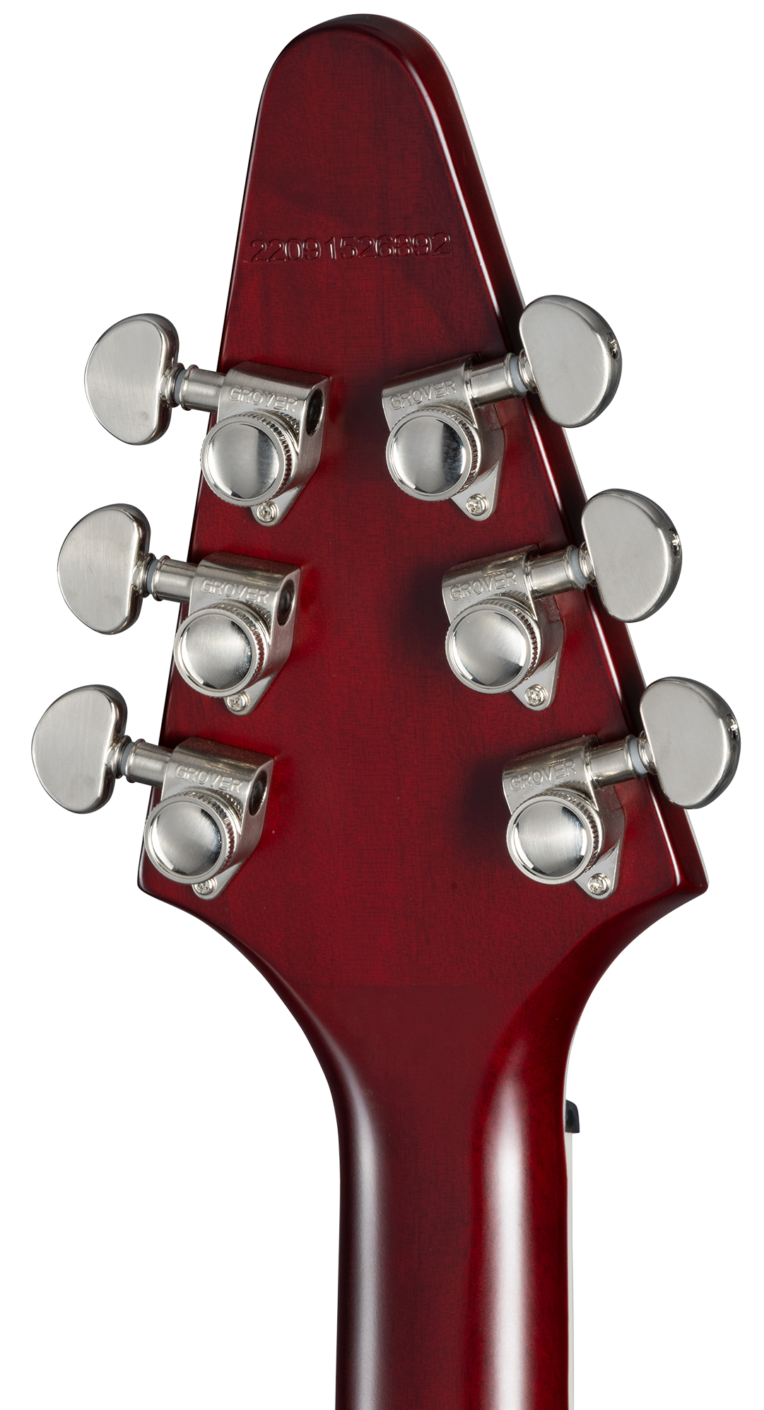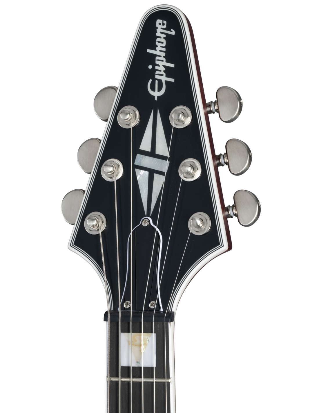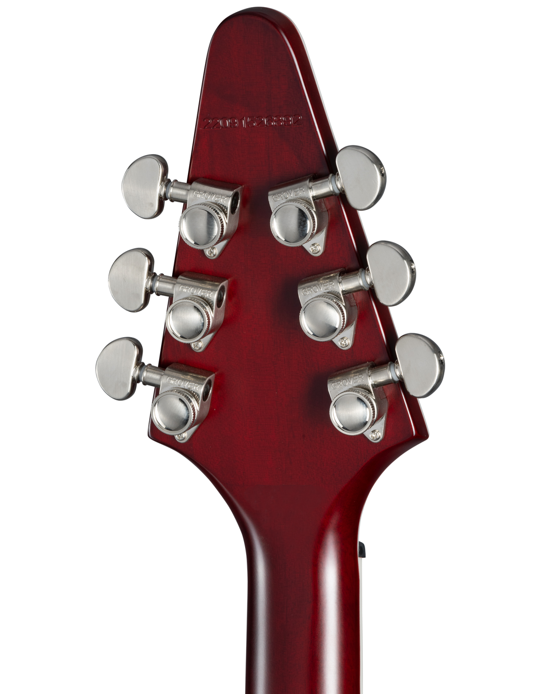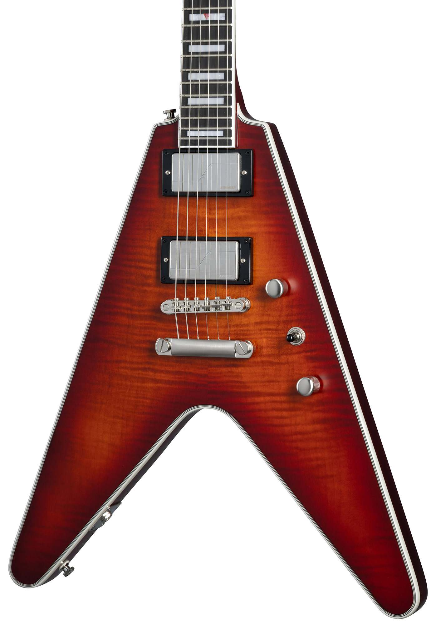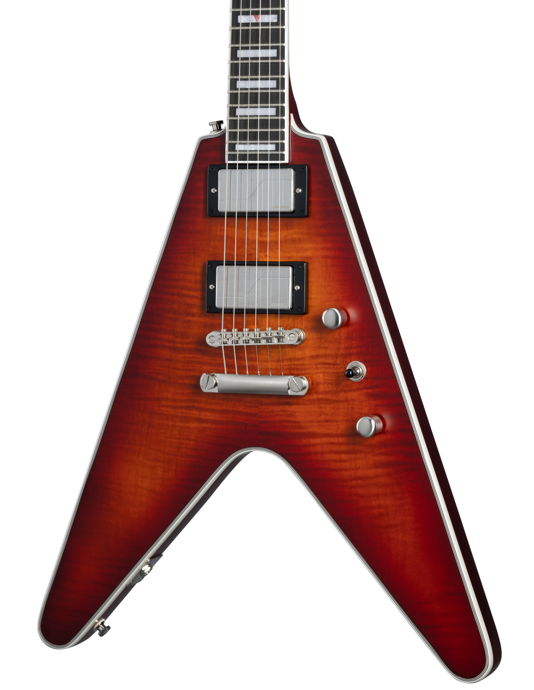 EPIPHONE FLYING V PROPHECY AGED BENGAL TIGER BURST est une guitare électrique solid body, modèle Epiphone Prophecy Flying V, avec un corps en Acajou et un top en Érable flammé AAA, un manche en Acajou à profil SlimTaper asymétrique avec un fond sculpté, une touche en Ébène à rayon de 12" avec 24 frettes Jumbo et des incrustations rectangulaires, un sillet en NuBone Tech Black Graph de 43mm, un matériel en nickel brossé, des mécaniques Grover Locking Rotomatic et un pont LockTone Tune-o-matic avec une cordière StopBar. L'électronique à configuration HH consiste en 2 micros Humbucker Fishman Fluence Custom qui offrent 3 sons distincts : vintage Gibson BurstBucker, hot-humbucker moderne, et single coil sélectionnables via les interrupteurs Push/Pull sur le contrôle du volume et du ton, et un sélecteur de micros à 3 voies. Inclut un Premium Gigbag