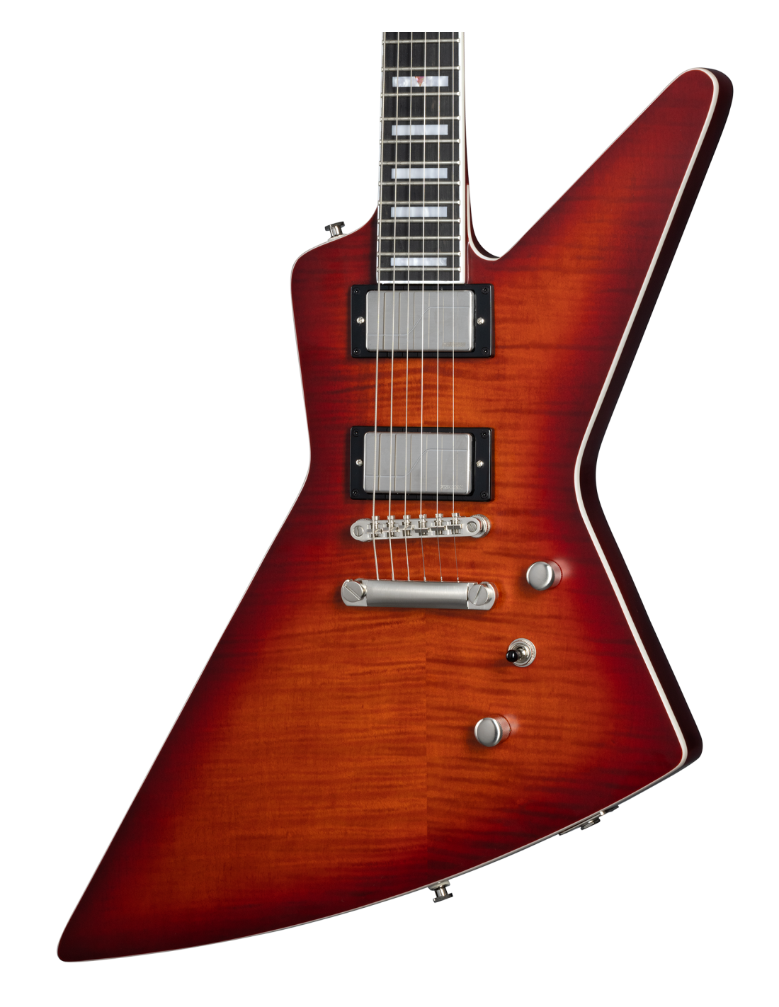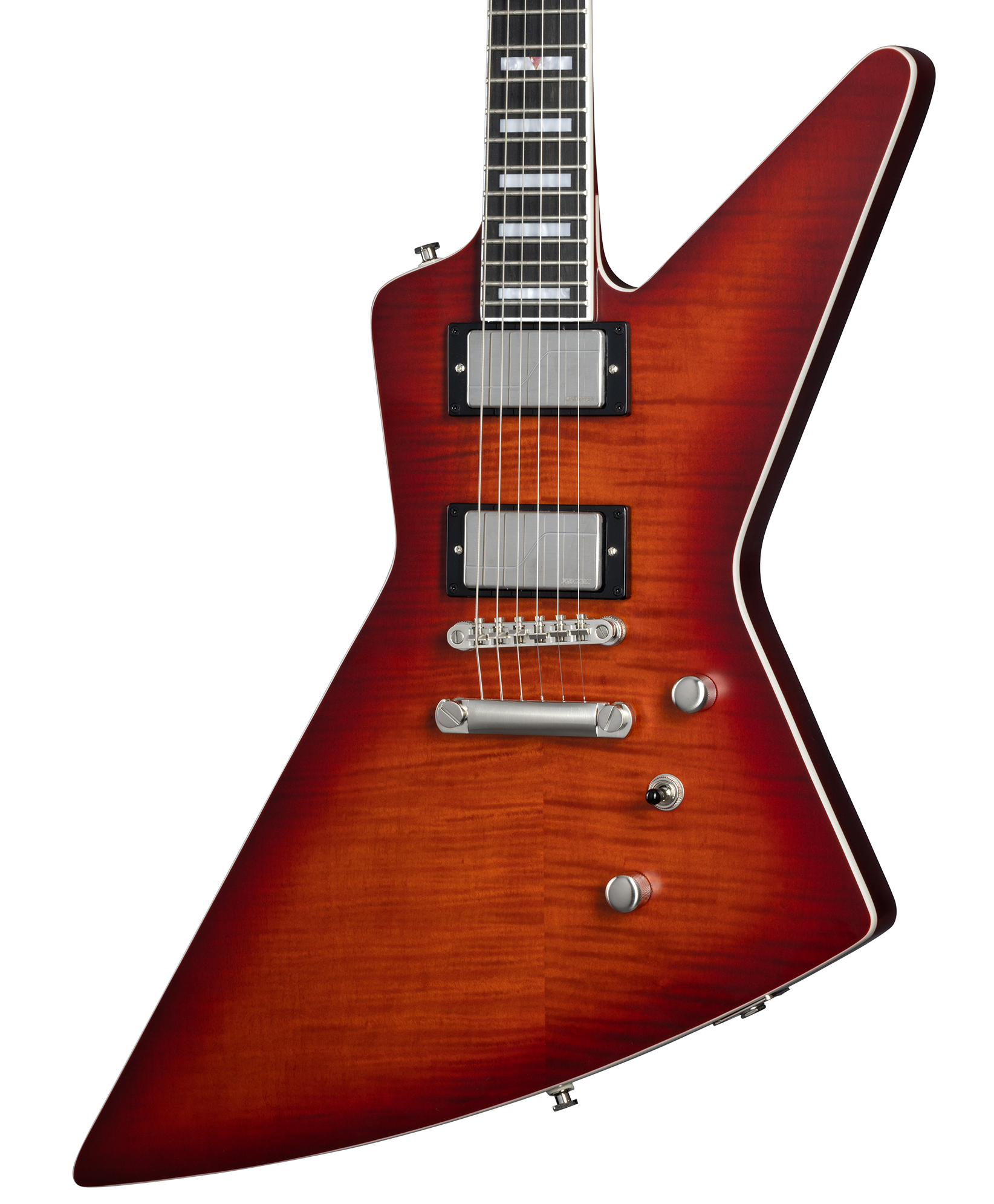 EPIPHONE EXTURA PROPHECY AGED BENGAL BURST W/BAG est une guitare électrique solid body, modèle Epiphone Prophecy Extura, avec un corps en acajou et un top en érable flammé AAA plaqué, un manche en acajou à profil SlimTaper asymétrique avec un fond sculpté, une touche en ébène à rayon de 12" avec 24 frettes Jumbo et des incrustations rectangulaires, un sillet en NuBone Tech Black Graph de 43mm, un matériel en nickel brossé, des mécaniques Grover Locking Rotomatic et un pont LockTone Tune-o-matic avec une cordière StopBar. L'électronique à configuration HH consiste en 2 micros Humbucker Fishman Fluence Custom qui offrent 3 sons distincts : vintage Gibson BurstBucker, hot-humbucker moderne, et single coil sélectionnables via les interrupteurs Push/Pull sur le contrôle du volume et du ton, et un sélecteur de micros à 3 voies. Inclut une housse de transport Premium
