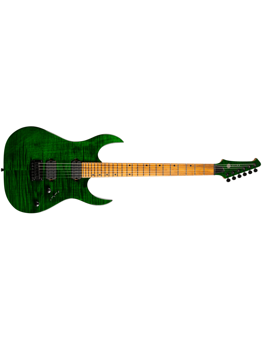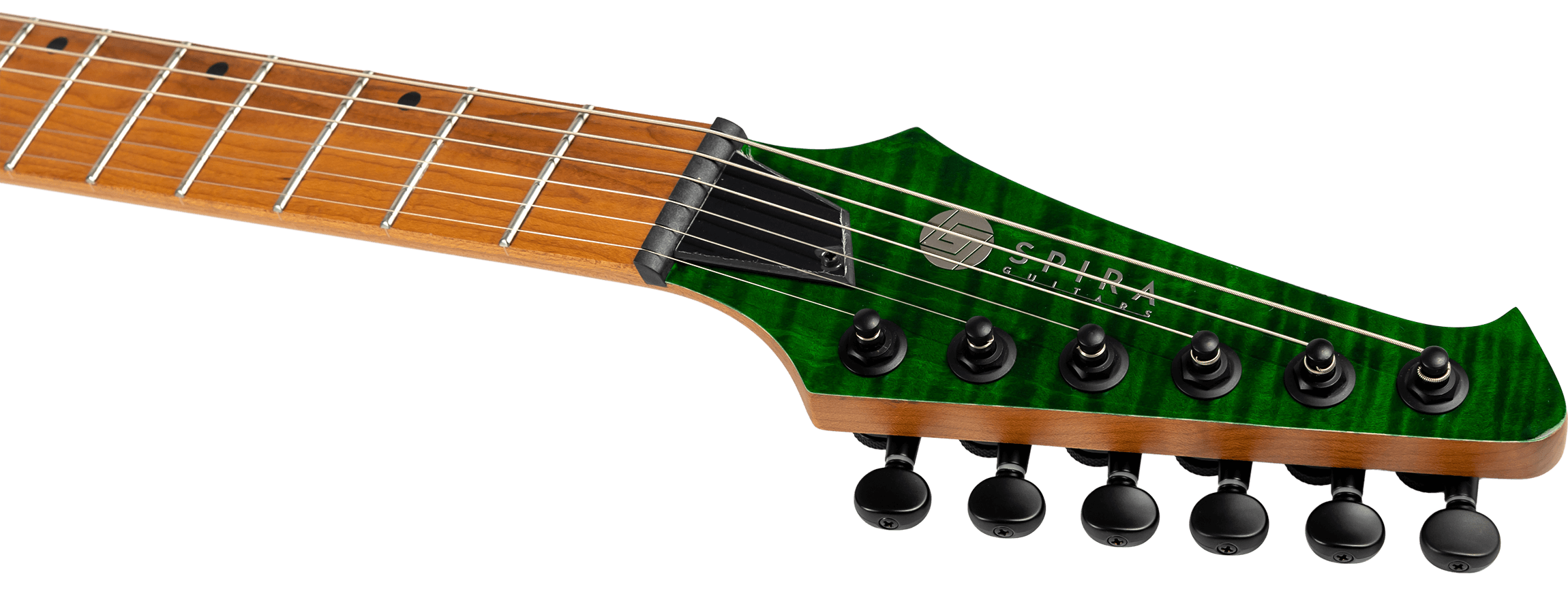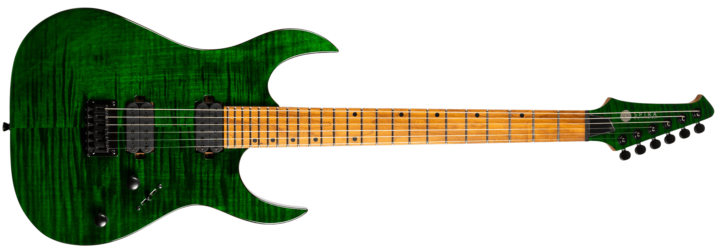 SPIRA S-450 TGR HH TRANSPARENT GREEN est une guitare électrique solid body, série S-450 avec un corps en peuplier rôti et un top en érable flammé, un manche en érable rôti canadien à profil Modern D, un touche en érable rôti à rayon 14" avec 24 frettes Jumbo et des incrustations en points noirs, un sillet en os synthétique, un matériel noir, un Truss Rod Double Action, une tête inversée, des mécaniques Locking Black et un pont fixe. L'électronique à configuration HH consiste en 2 pickups Humbucker Spira Villain Custom Made Ceramic Magnet avec contrôle du volume et du ton et sélecteur de pickups à 3 voies.