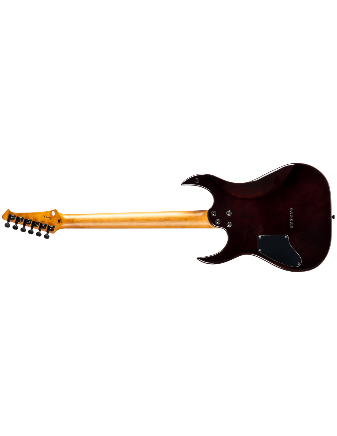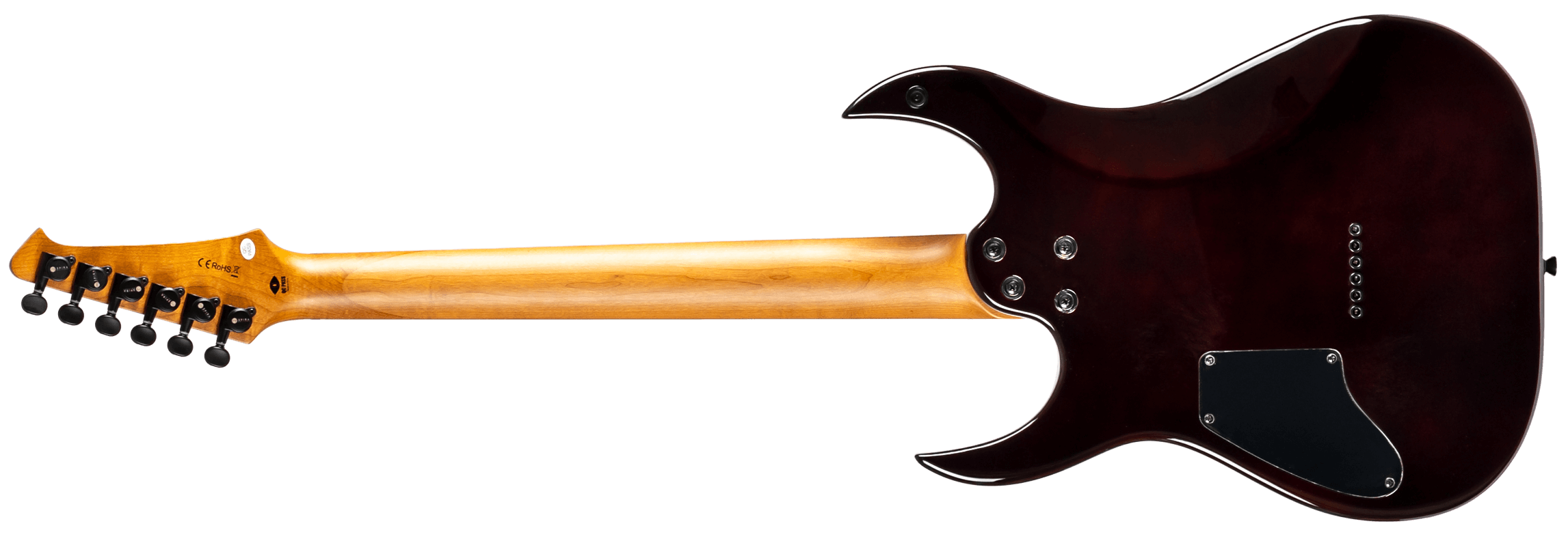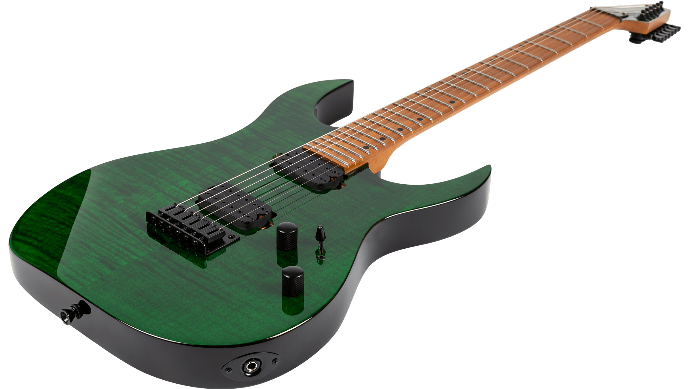 SPIRA S-450 TGR HH TRANSPARENT GREEN est une guitare électrique solid body, série S-450 avec un corps en peuplier rôti et un top en érable flammé, un manche en érable rôti canadien à profil Modern D, un touche en érable rôti à rayon 14" avec 24 frettes Jumbo et des incrustations en points noirs, un sillet en os synthétique, un matériel noir, un Truss Rod Double Action, une tête inversée, des mécaniques Locking Black et un pont fixe. L'électronique à configuration HH consiste en 2 pickups Humbucker Spira Villain Custom Made Ceramic Magnet avec contrôle du volume et du ton et sélecteur de pickups à 3 voies.