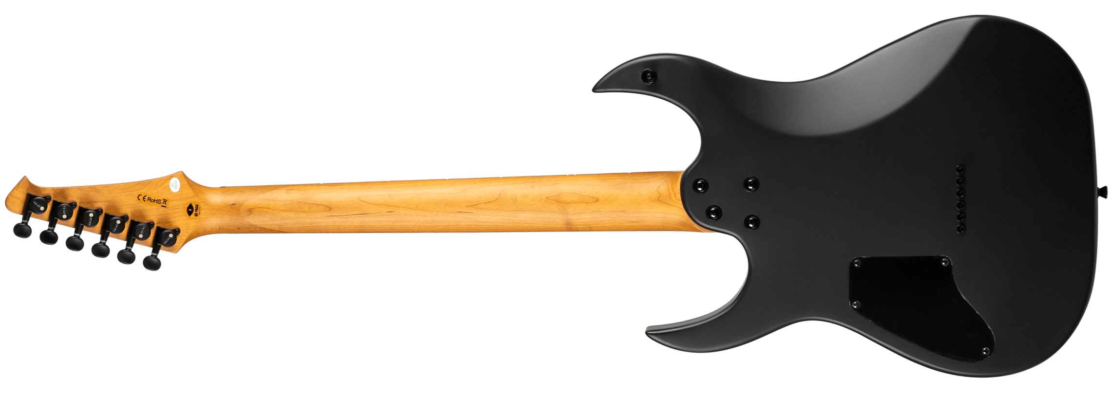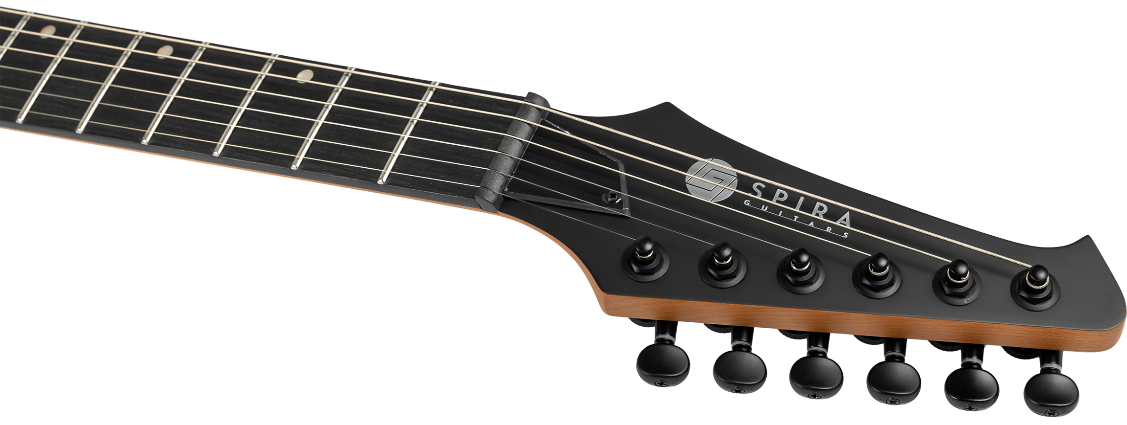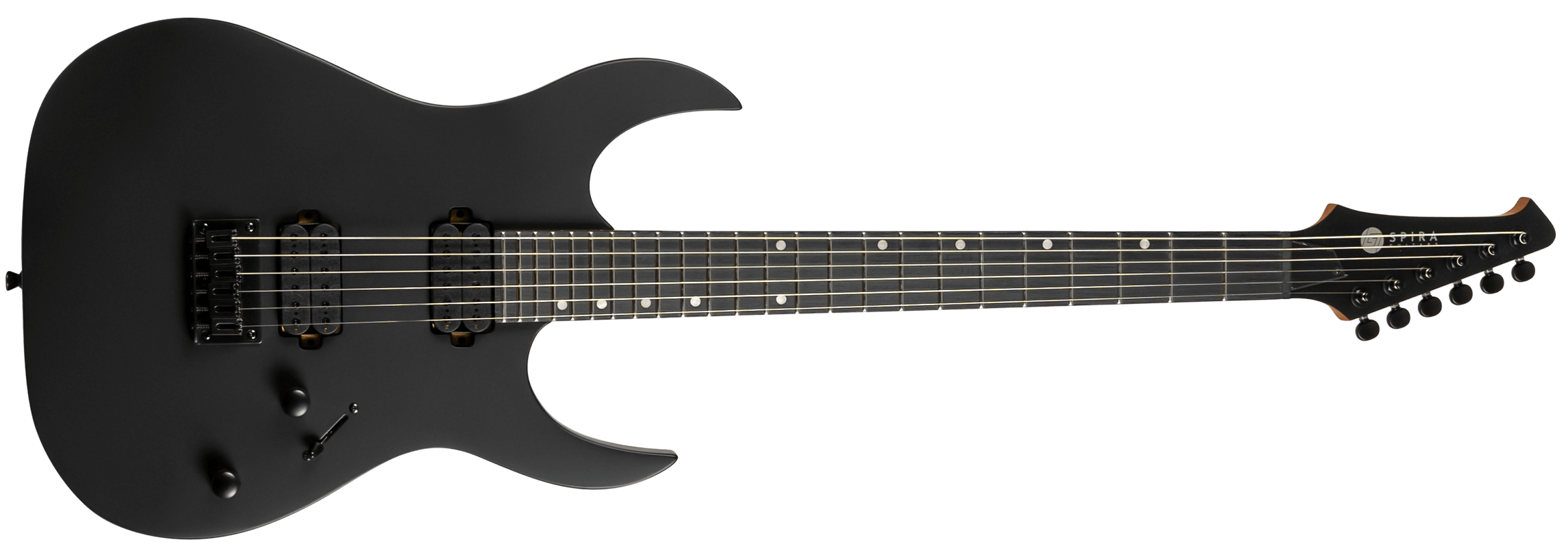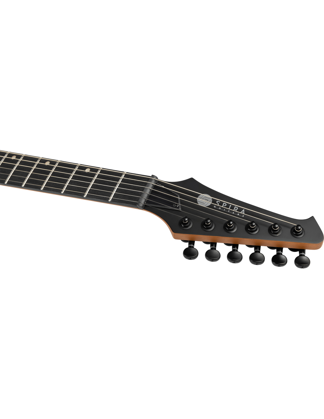 SPIRA S-400 MBK HH SATIN BLACK est une guitare électrique solid body, série S-400 avec un corps en peuplier rôti, un manche en érable rôti canadien au profil Modern D, un doigté en Ébène Tech de haute qualité avec un rayon de 14" et 24 frettes Jumbo et des incrustations de points blancs, un sillet en os synthétique, du matériel noir, un Truss Rod Double Action, une tête inversée, des mécaniques Locking Black et un pont fixe. L'électronique à configuration HH se compose de 2 micros Humbucker Spira Villain Custom Made Ceramic Magnet avec contrôle du volume et du ton et un sélecteur de micros à 3 voies.