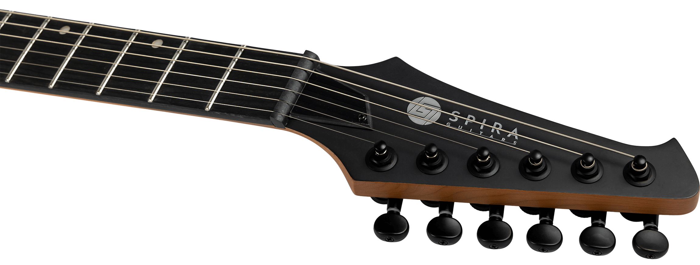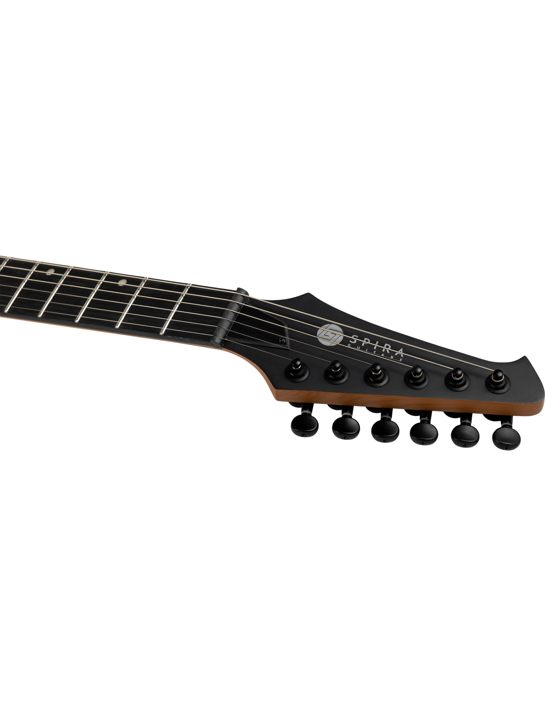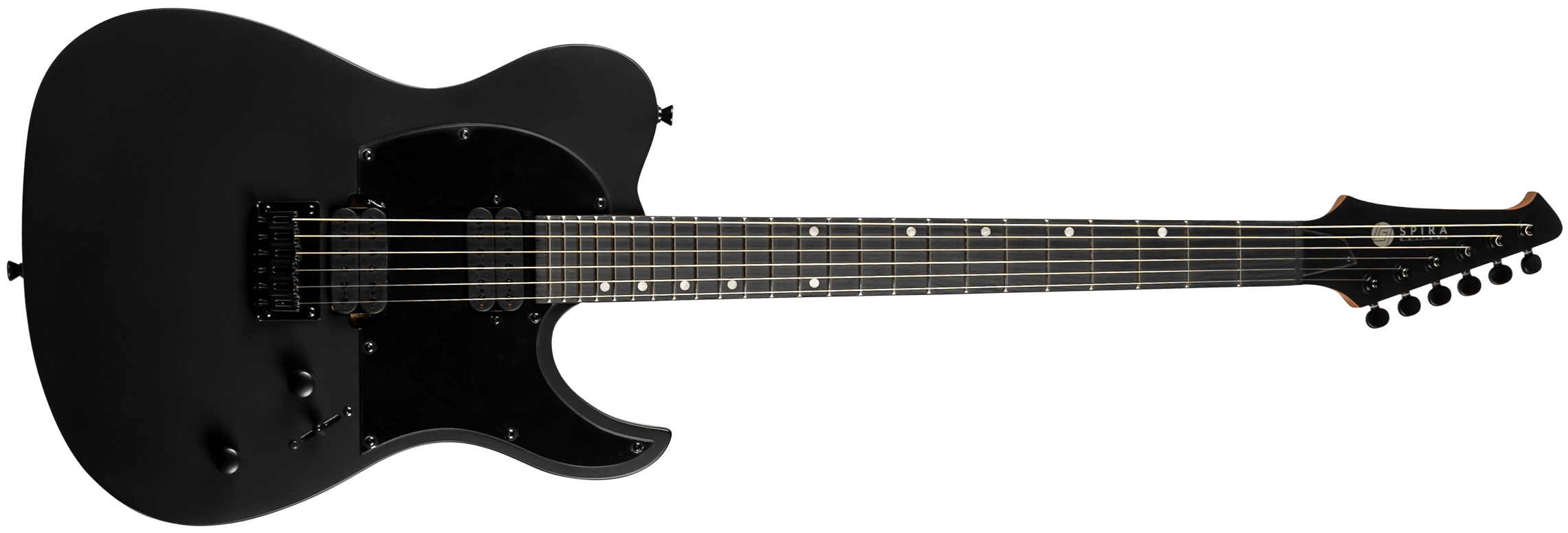 SPIRA T-400 MBK HH SATIN BLACK est une guitare électrique solid body de style T, série T-400 avec un corps en peuplier rôti, un manche en érable rôti canadien au profil Modern D, une touche en Ébène Tech de haute qualité avec un rayon de 14" et 24 frettes Jumbo et des incrustations de points blancs, un sillet en os synthétique, du matériel noir, un Truss Rod à double action, une tête inversée, des mécaniques Locking Black et un pont fixe. L'électronique à configuration HH se compose de 2 pickups Humbucker Spira Villain Custom Made Ceramic Magnet avec contrôle du volume et du ton et sélecteur de pickup à 3 voies.