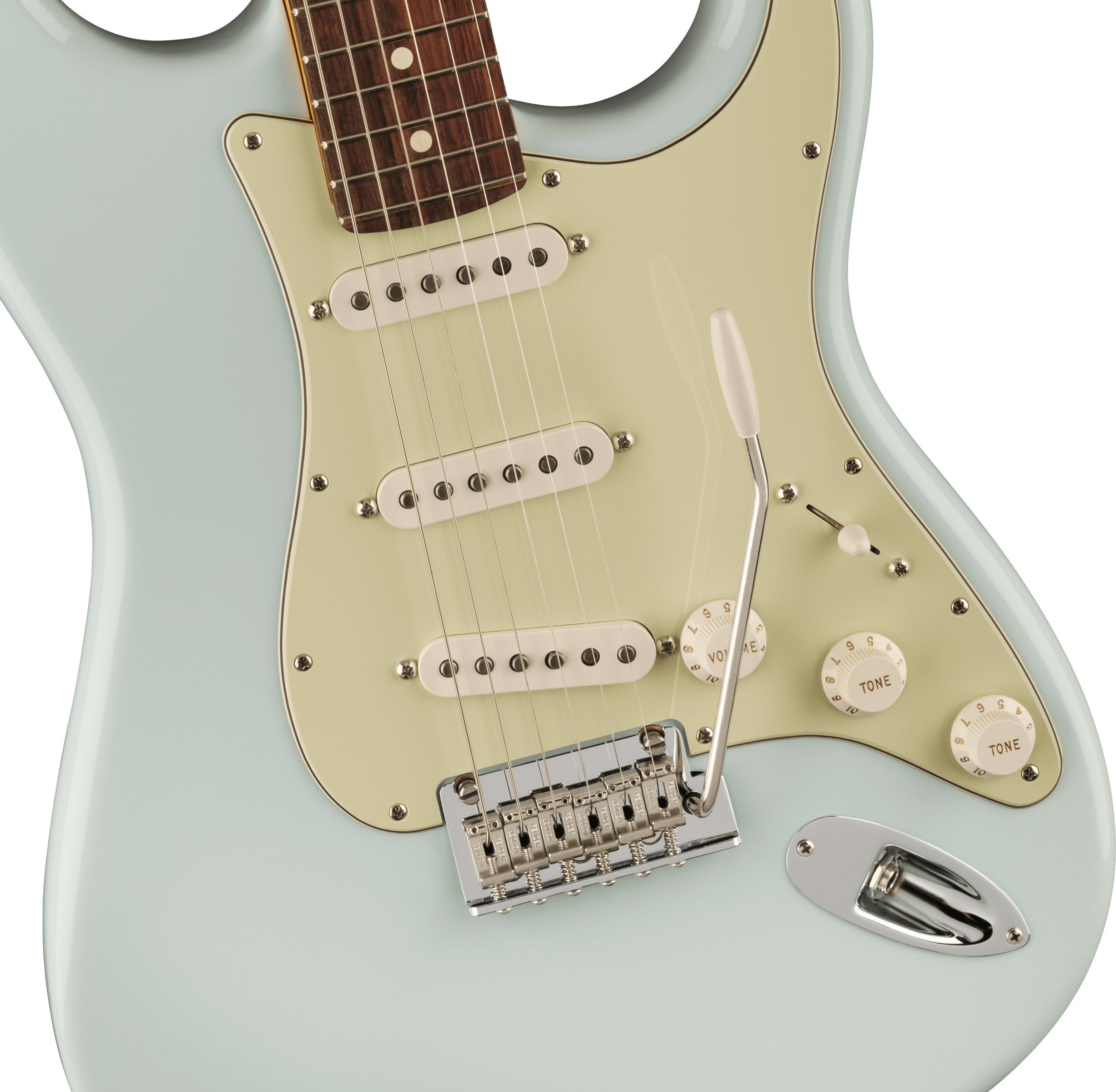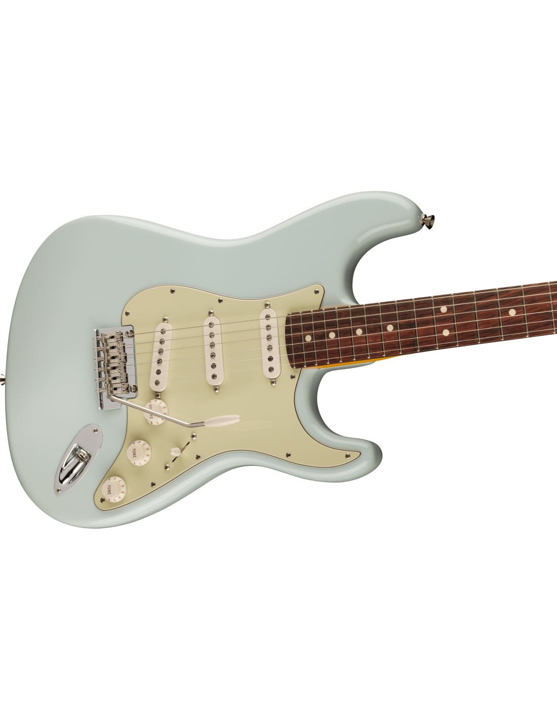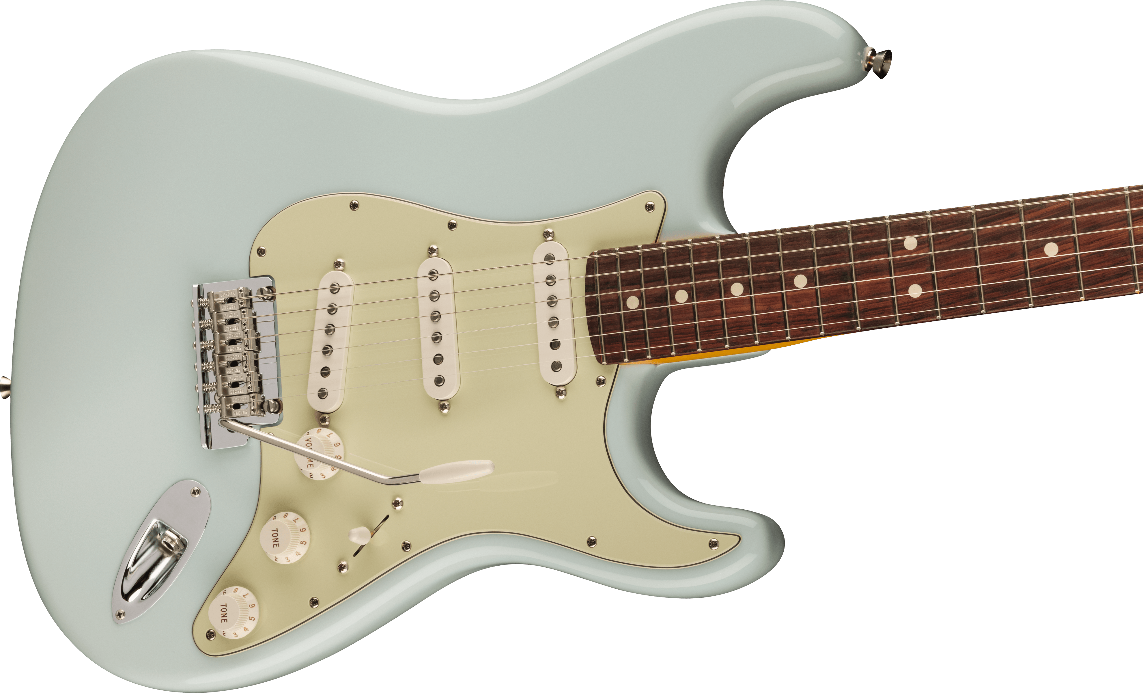 FENDER AM PRO II STRAT LTD RW SONIC BLUE est une guitare électrique solid body, modèle Édition Limitée American Professional II Stratocaster, avec un corps en Alder (aulne) et une finition Gloss Uretane, un manche en érable Quartersawn à profil Deep "C", un doigté en palissandre à rayon 9,5" avec 22 frettes Narrow Tall et des incrustations White Dots, un sillet en os, un matériel nickelé, des mécaniques Fender Standard Staggered et un pont Fender Synchronized Tremolo avec bras pop-in et selles en acier pliées. L'électronique en configuration SSS consiste en 3 micros Single Coil V-Mod II Strat, avec un contrôle Master Volume, 2 contrôles de tonalité avec push/push sur la tonalité 2 pour l'ajout du micro au manche et un sélecteur de micro à 5 voies. Inclut un étui moulé Deluxe