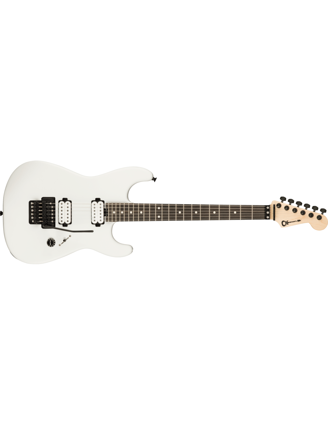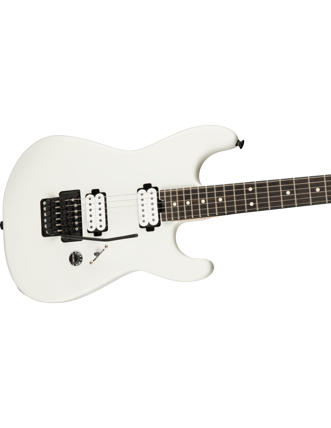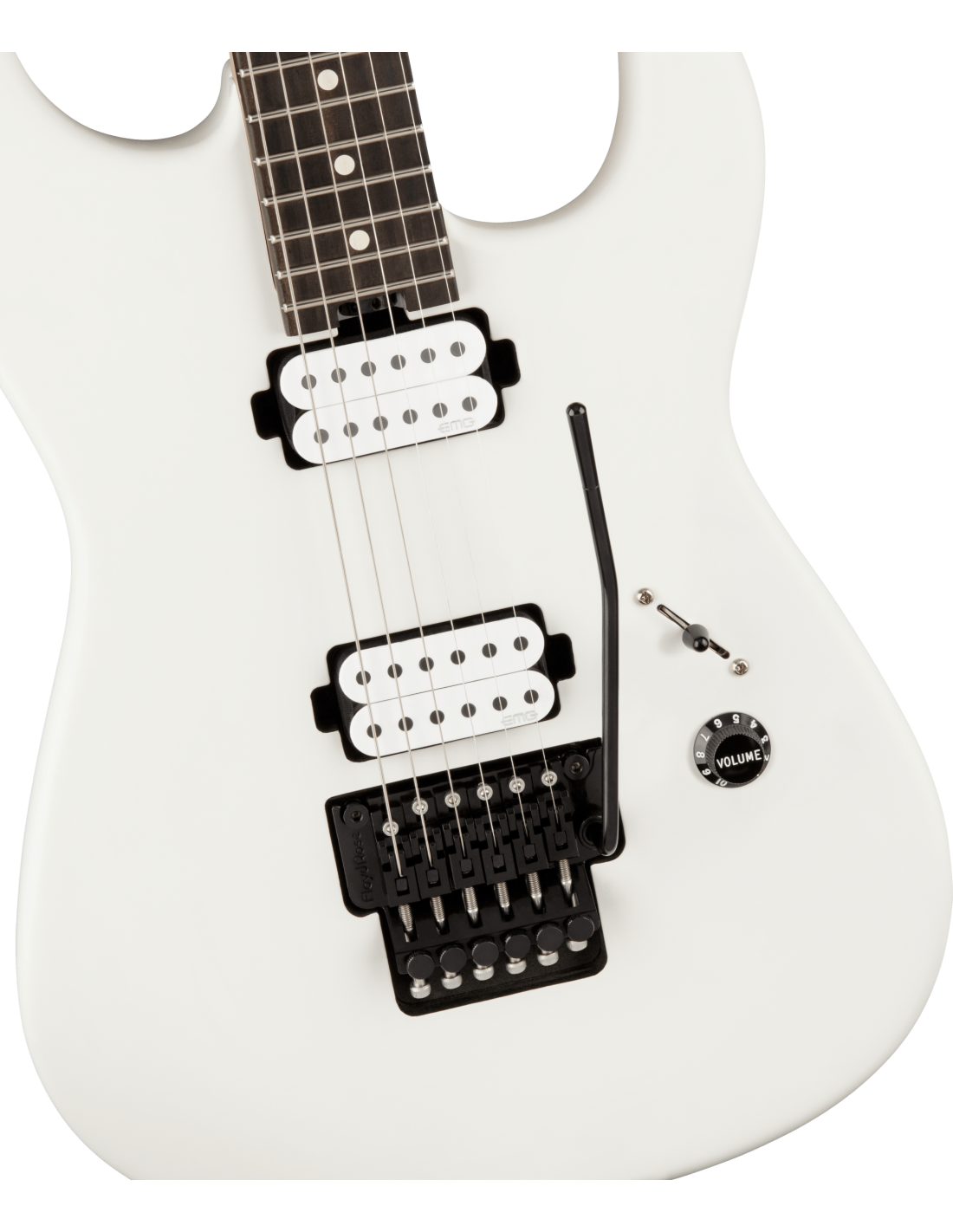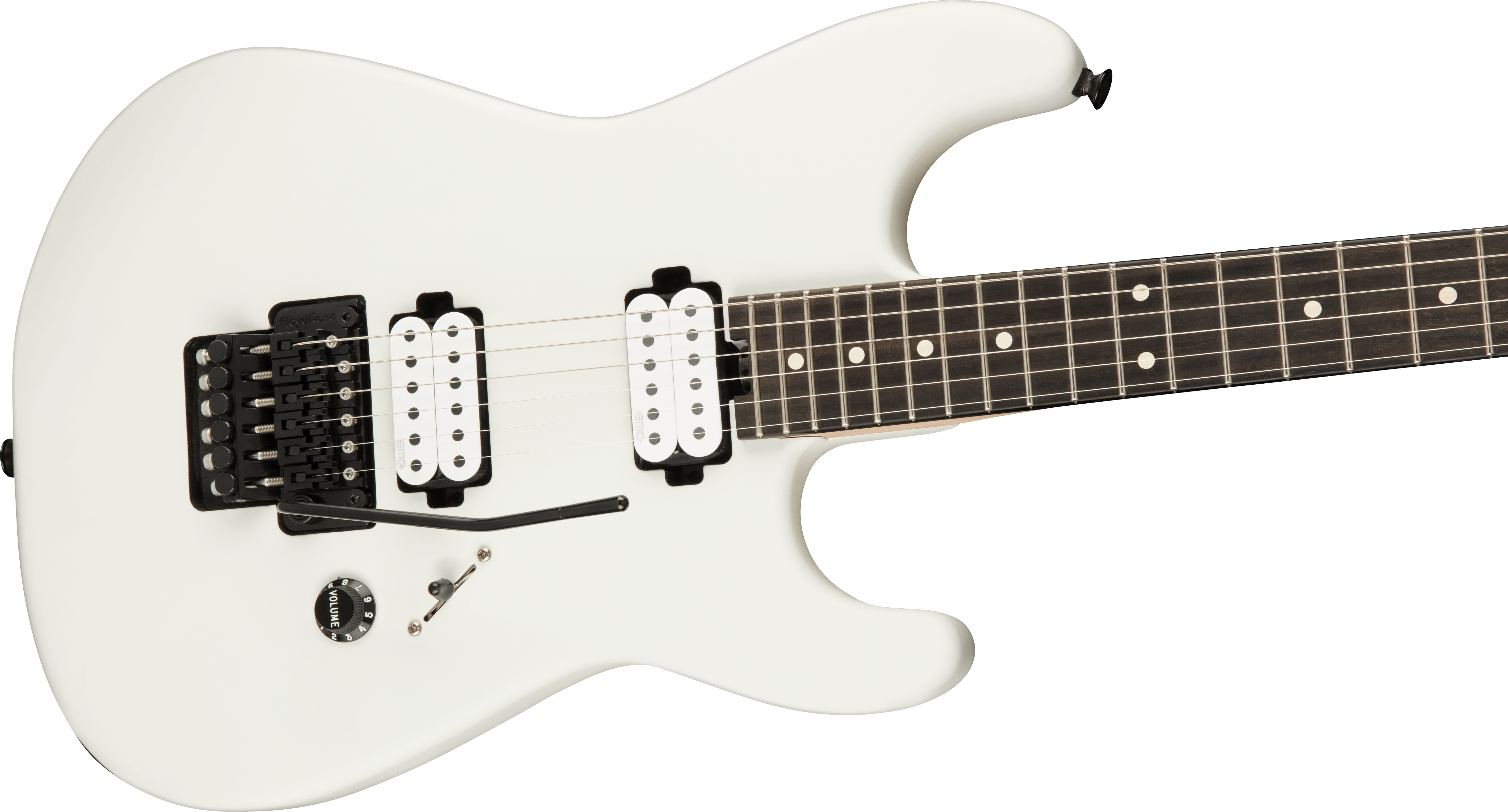 CHARVEL JIM ROOT SIGNATURE PRO MOD WHITE est une guitare électrique solid body, modèle Jim Root Signature Pro-Mod San Dimas Style 1 HH FR E, avec un corps en acajou à finition satinée, un manche en érable à profil Speed Neck avec des angles arrondis, un touche en ébène à rayon compound 12" / 16" avec 22 frettes jumbo, des incrustations White Dot et des repères latéraux Luminlay, Truss Rod Dual Action Wheel, un sillet Floyd Rose 1500 Series Locking, une tête Fender Stratocaster Licensed, un matériel noir, des mécaniques Charvel Locking pressofuse avec un abaisse-cordes Floyd Rose Retainer Bar et un pont Floyd Rose 1500 Series Double-Locking Tremolo. L'électronique active à configuration HH consiste en 2 micros Humbucker EMG Jim Root Signature Daemonum Open-Coil Active, avec un contrôle Master Volume et un sélecteur de micros à 3 positions. Inclut une Charvel Multi-Fit Hardshell Gig Bag.