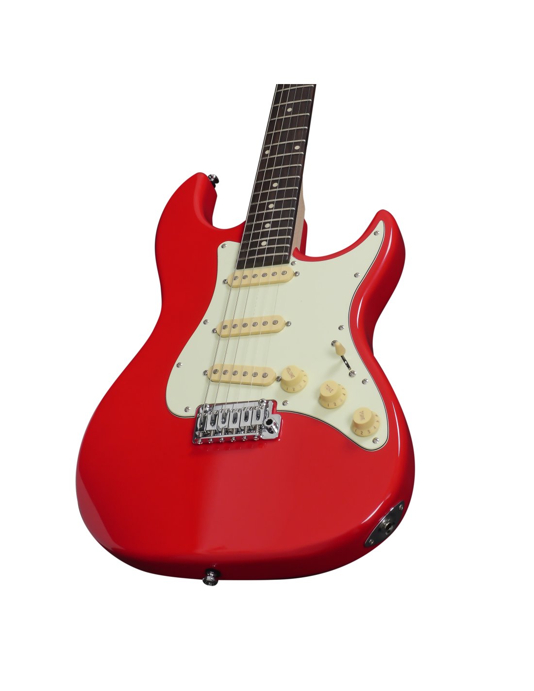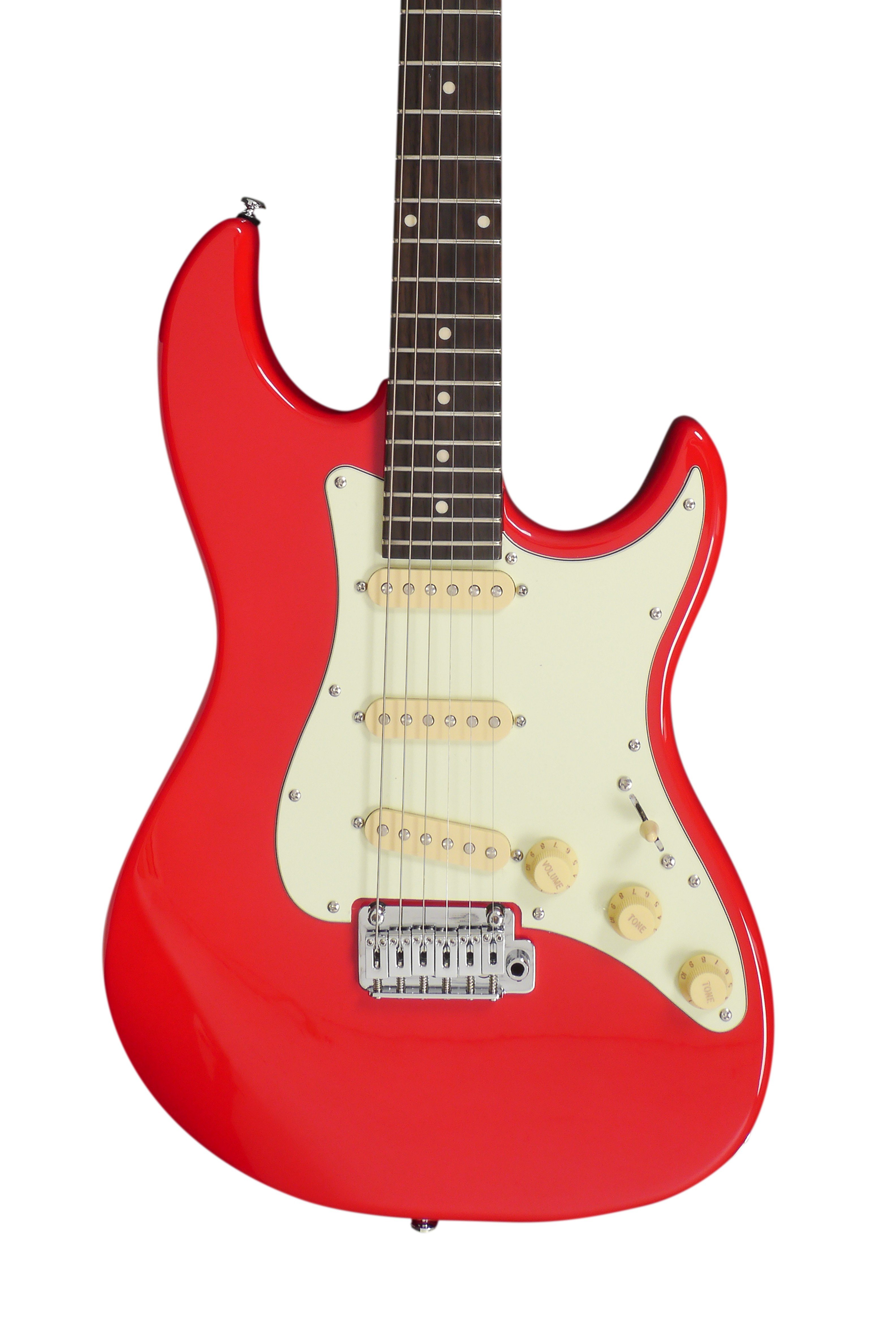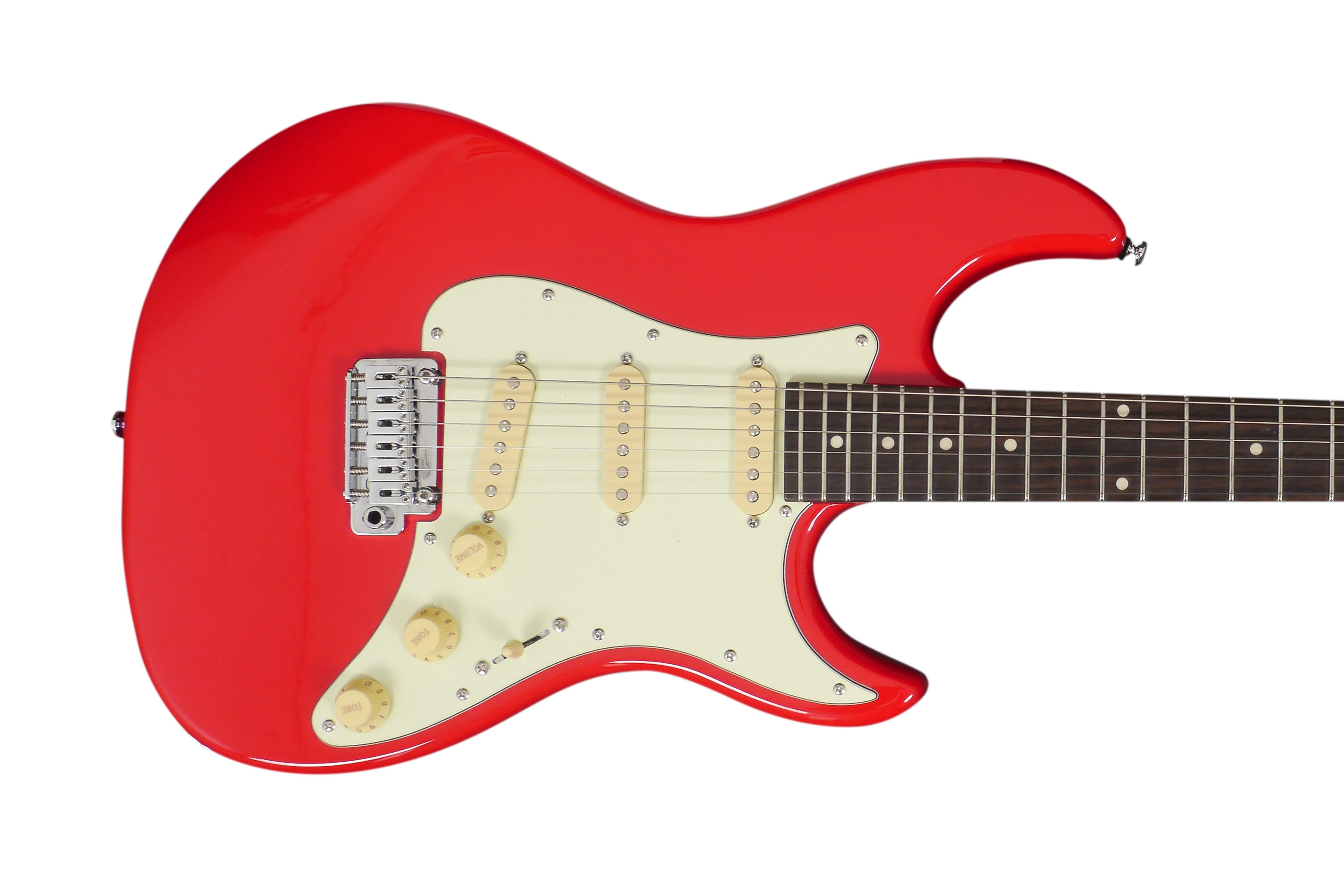 Guitare électrique Larry Carlton en forme de S. Corps en acajou. Manche en érable. Finition satinée du manche. Touche en palissandre. Bord arrondi pour plus de confort. Bolt-on. Échelle : 648 mm (25,5 ''). 22 frettes Medium Jumbo. Sillet : Bone Nut, Largeur 42 mm. Ensemble de micros SSS Sire Standard-ST. Contrôles Volume et Tone1 et Tone2. Interrupteur à 5 positions. Mécaniques Sire Standard. Pont Sire Standard Tremolo (type 2 postes). Finition des mécaniques : Chrome. Finition Dakota Red.