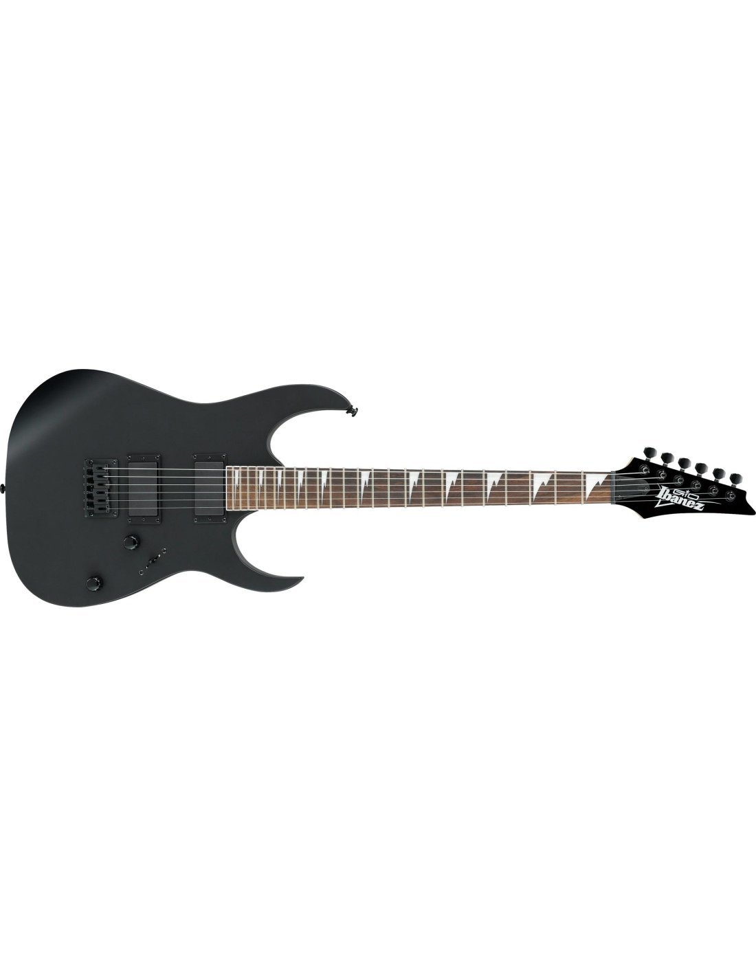 Guitare Électrique Ibanez GRG121DX-BKF couleur NOIR MAT. La Ibanez GRG121DX-BKF est une guitare électrique à 6 cordes. Les caractéristiques techniques incluent un corps en acajou, un manche GRG en érable, un touche en palissandre avec des incrustations en forme de dents de requin, un radius de 400 mm, 24 frettes jumbo, un pont fixe, des micros IBZ-6 (HH).