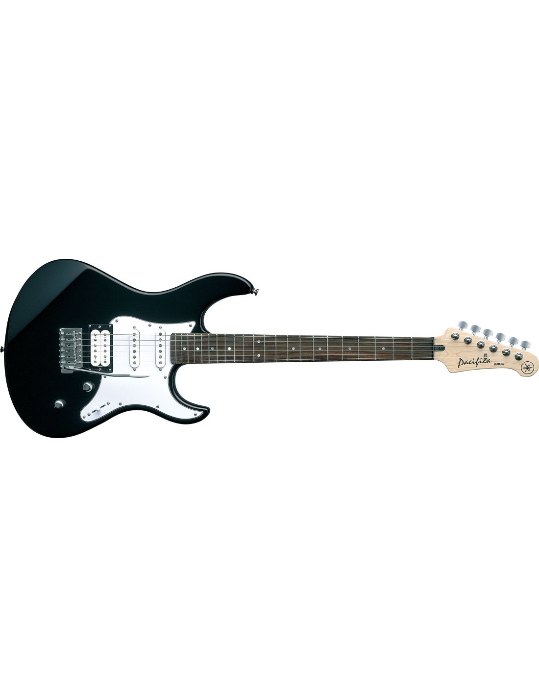 Guitare Électrique Yamaha Pacifica 112J couleur noire. La Yamaha Pacifica 112J est une guitare électrique à 6 cordes. Les caractéristiques techniques incluent : corps en tilleul, manche en érable, touche en palissandre, radius 13 3/4", 22 frettes, pont vintage avec tremolo, micros simple bobinage (manche/milieu) et humbucker (chevalet).