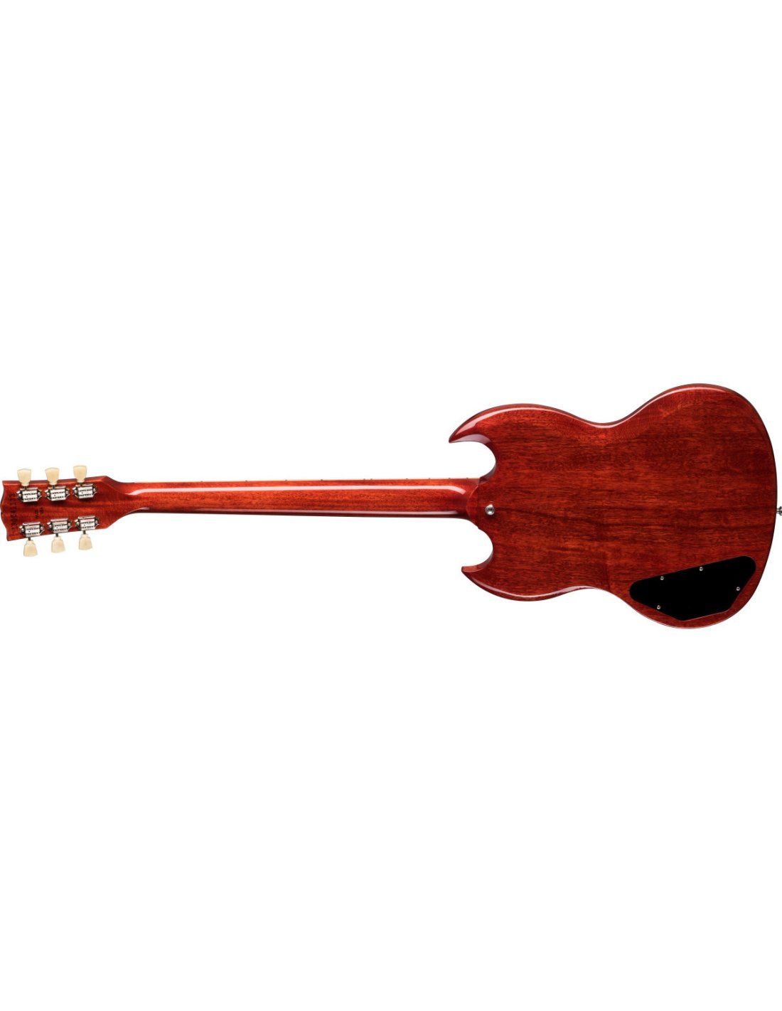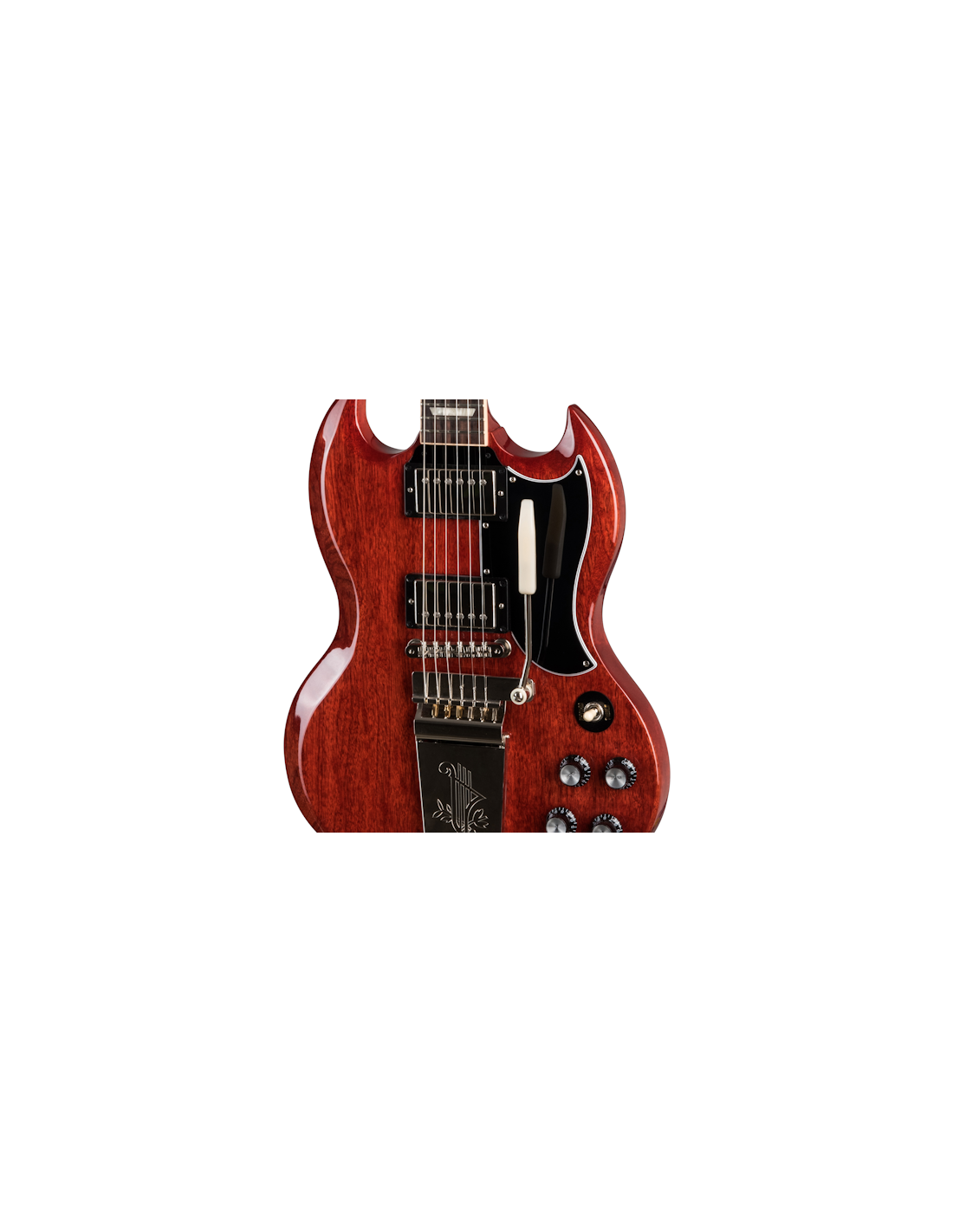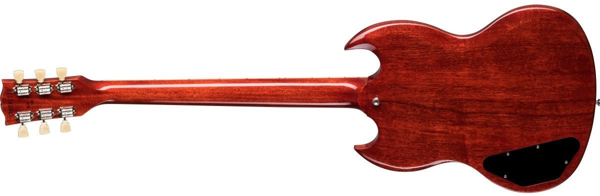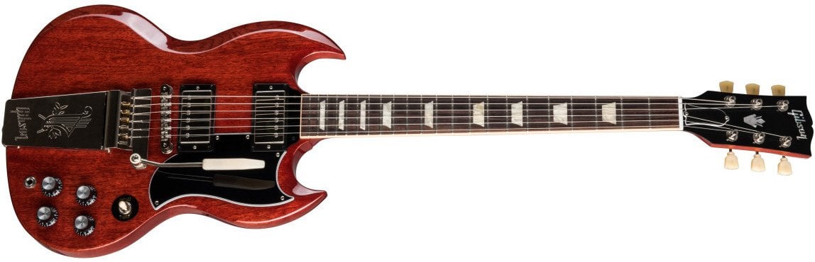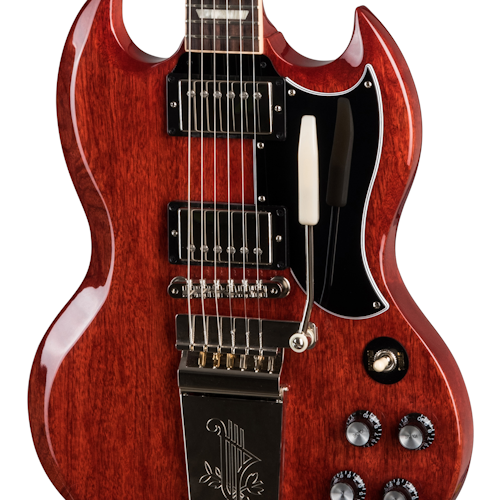 GIBSON SG STANDARD '61 MAESTRO VIBROLA VINTAGE CHERRY è una chitarra elettrica solid body, modello Gibson Original SG Standard '61 Maestro Vibrola, con corpo in Mogano a finitura Gloss Nitrocellulose Lacquer, manico in Mogano a profilo '60 SlimTaper, tastiera in Palissandro Indiano a raggio 12" con 22 tasti Medium-Jumbo e intarsi Acrylic Trapezoid, capotasto in Graph Tech, hardware nichelato, meccaniche Vintage Deluxe con chiavi Keystone e ponte Gibson ABR-1 Tune-O-Matic con cordiera Tremolo Maestro Vibrola. L'elettronica a configurazione HH, consiste in 2 pickup Gibson '60 BurstBucker 61 R/T cablati a mano con condensatori Orange Drop, 2 controlli Master Volume, 2 controlli Master Tone e selettore pickup a 3 vie. Include la custodia Gibson Hardshell case.