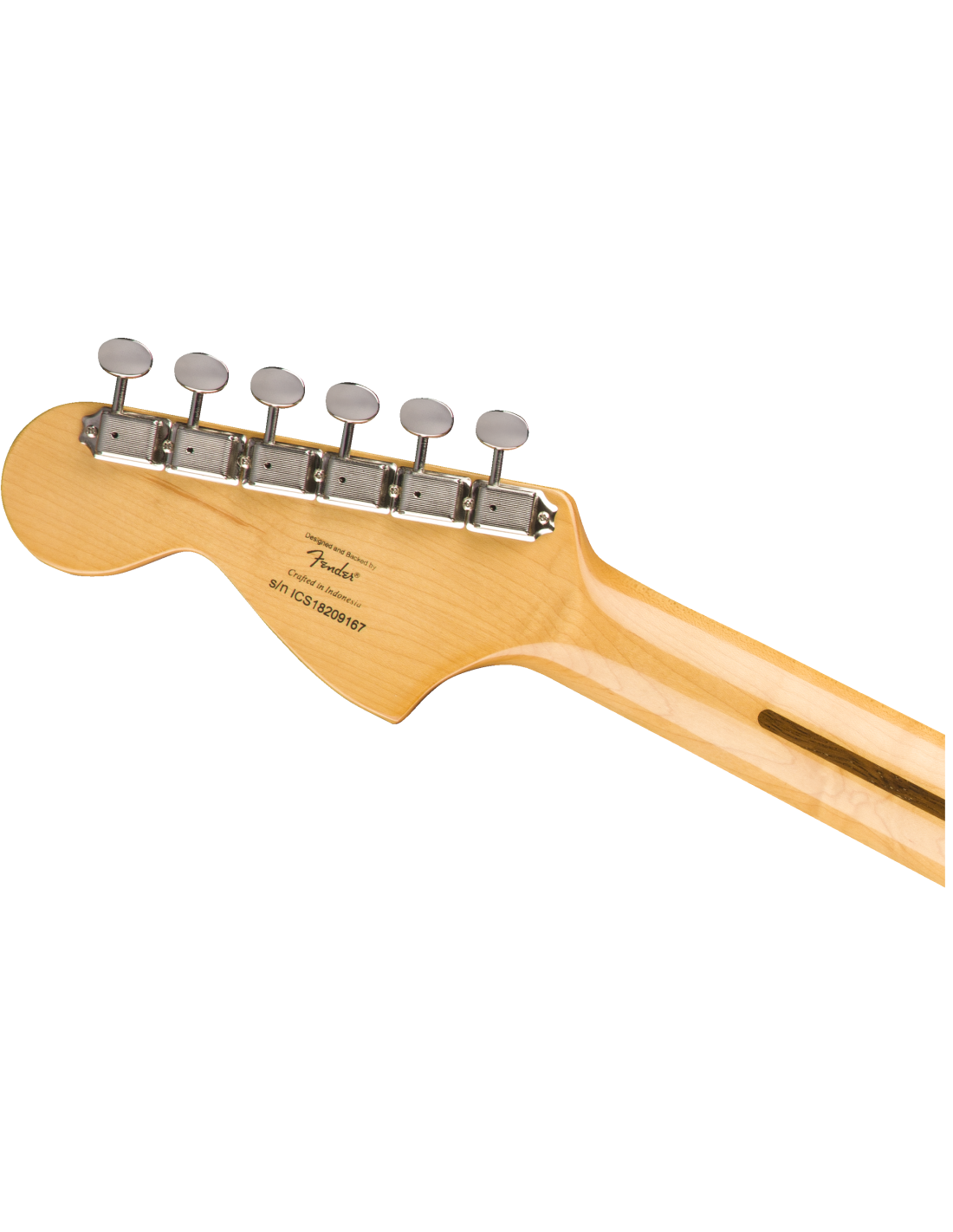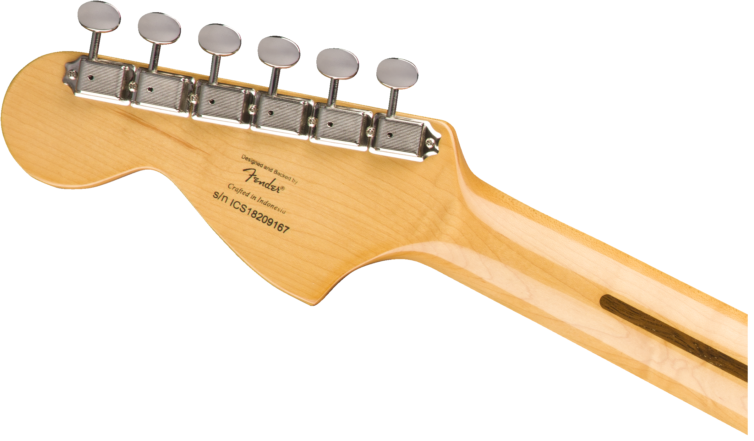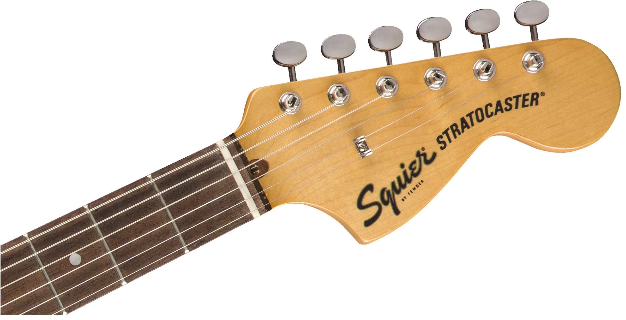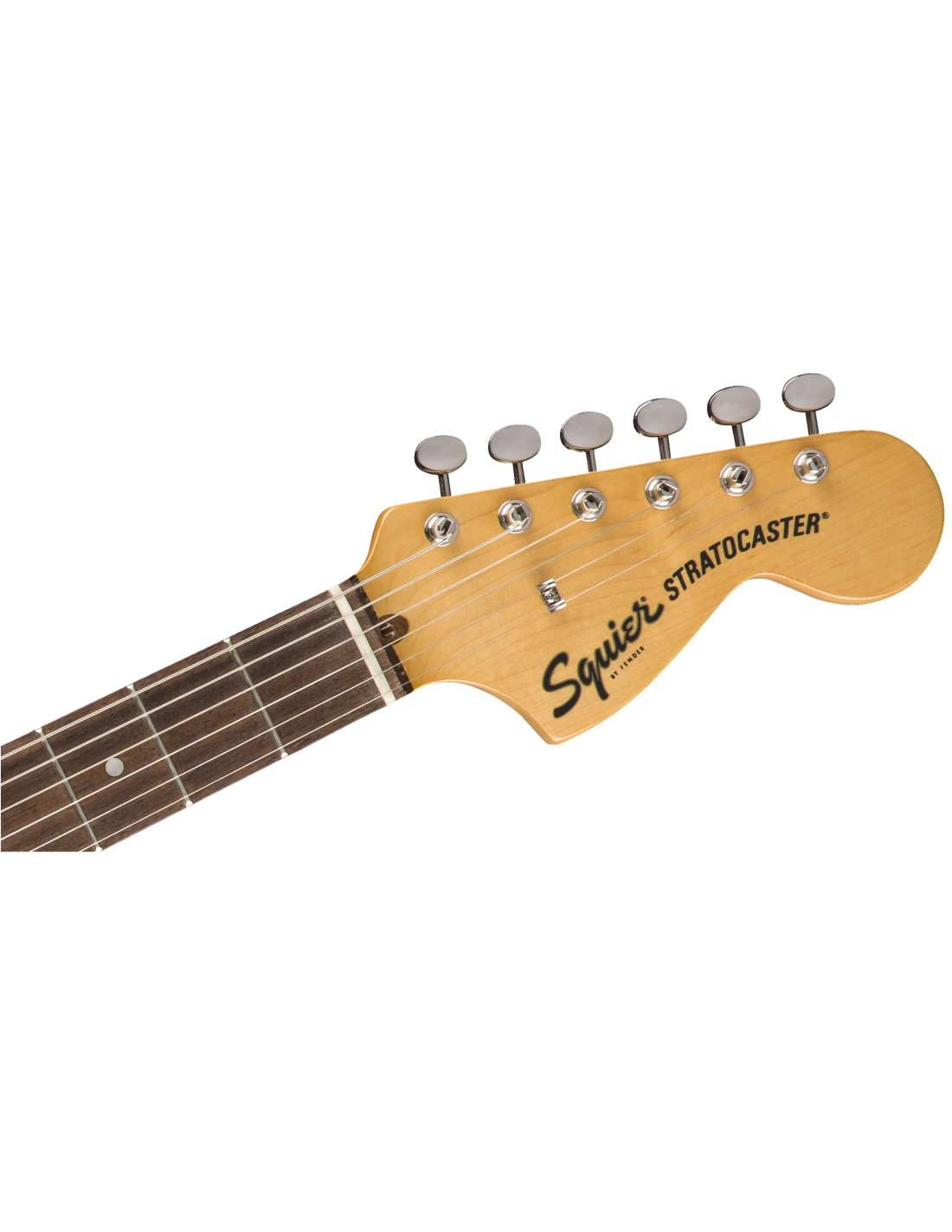 SQUIER CV STRAT 70S HSS LRL NOYER est une guitare électrique solid body, modèle Classic Vibe '70s Stratocaster HSS, avec un corps en peuplier et une finition en polyuréthane brillant, un manche en érable en profil "C", un doigté en laurier indien avec un rayon de 9,5" et 21 frettes Narrow Tall et des incrustations White Dot avec des points latéraux blancs, un pickguard 3-Ply Noir, une tête de guitare Large '70s Style, un truss rod à réglage standard, un sillet en os synthétique, un matériel nickelé, des mécaniques Vintage Style, un abaisse-cordes Dual Wing et un pont Vintage Style Synchronized Tremolo. L'électronique en configuration HSS se compose de 1 micro Fender Designed Alnico Humbucking au pont et de 2 micros Fender Designed Alnico Single-Coil au centre et au manche avec des contrôles Master Volume, 2 Master Tone et un sélecteur de micro à 5 voies.