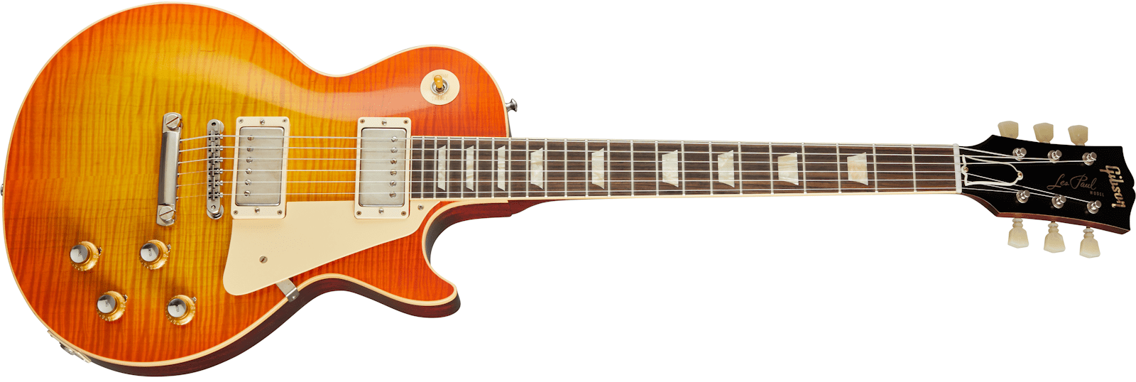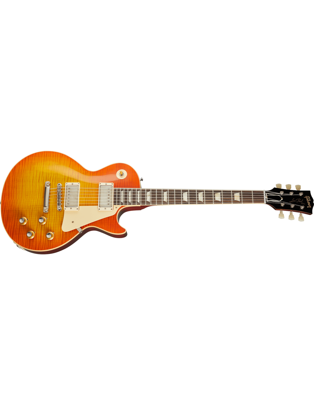 Chitarra elettrica Gibson Les Paul '60 60th Anniversary Orange Lemon Fade. La Gibson Les Paul '60 60th Anniversary è una chitarra elettrica 6 corde in edizione limitata che celebra la Les Paul Standard del 1960 con grande cura dei dettagli. Corpo e manico in mogano, top in acero fiammato, tastiera in palissandro indiano, pickups Custombucker Alnico III.
