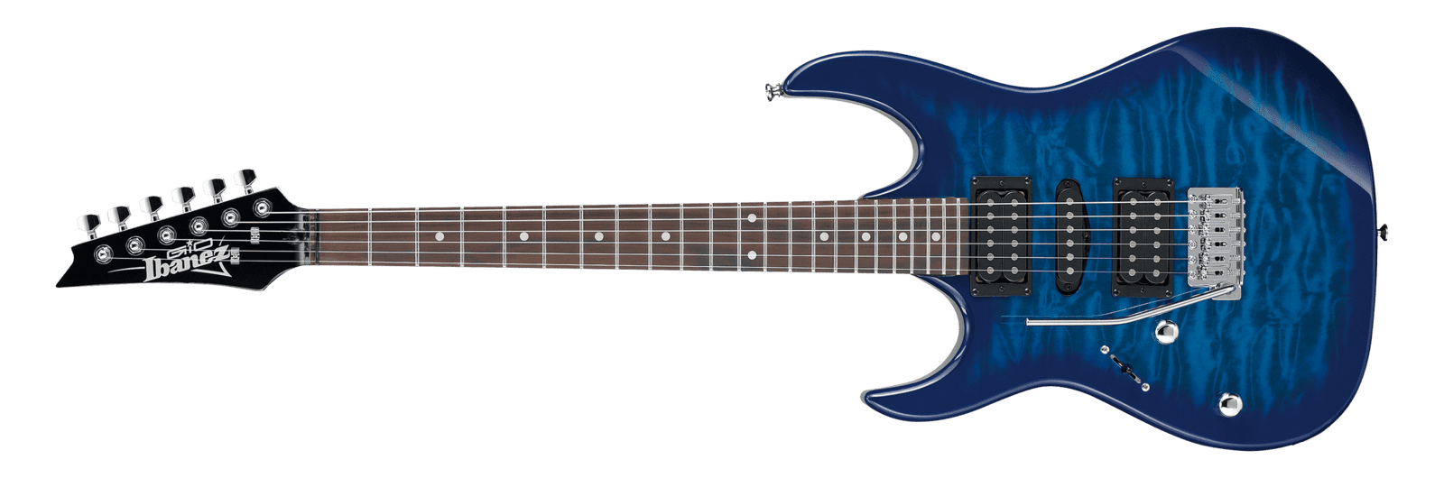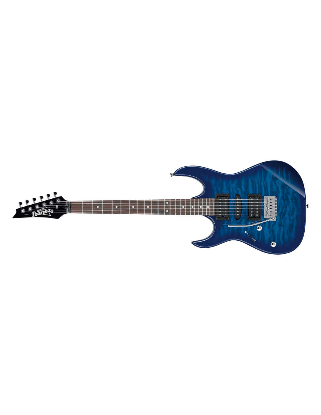 IBANEZ GRX70QAL-TBB GAUCHER. Guitare électrique gauchère série Ibanez GIO avec corps en peuplier, table en Acajou piqué Art Grain, manche en érable, touche en Purpleheart Bound avec 22 frettes Medium Jumbo, repères en point blanc et finition Transparent Blue Burst. L'électronique en configuration HSH est équipée de 2 micros Humbucker Infinity R au chevalet et au manche et d'1 micro Simple Bobinage Infinity S au centre avec contrôles Master Volume, Master Tone, sélecteur à 5 voies. Elle présente également un pont tremolo avec levier Ibanez T-106 et mécaniques chromées.