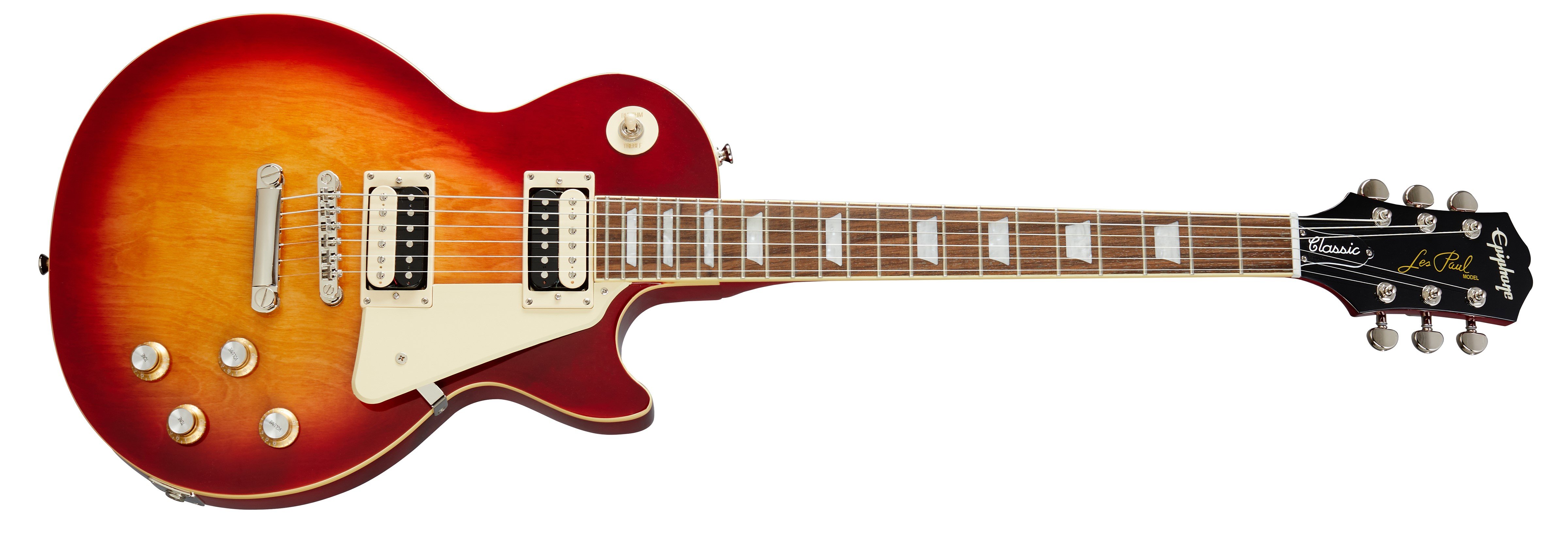 EPIPHONE LES PAUL CLASSIC WORN HS est une guitare électrique solid body, modèle Les Paul Classic Worn, avec un corps en acajou et une finition Worn "vécue", un top en érable, un manche en acajou au profil SlimTaper C-profile, un touche en laurier indien à rayon 12" avec 22 frettes Medium Jumbo et des incrustations trapézoïdales en nacre, un sillet en Graph Tech, un matériel nickelé, des mécaniques Grover Rotomatic avec des boutons Kidney 18:1 et un pont LockTone Tune-o-Matic avec une corde LockTone Stop Bar. L'électronique se compose de 2 micros humbucker Alnico Classic PRO avec 2 contrôles de volume, 2 pour le ton avec Split Coil et un sélecteur à 3 voies pour la sélection des micros.