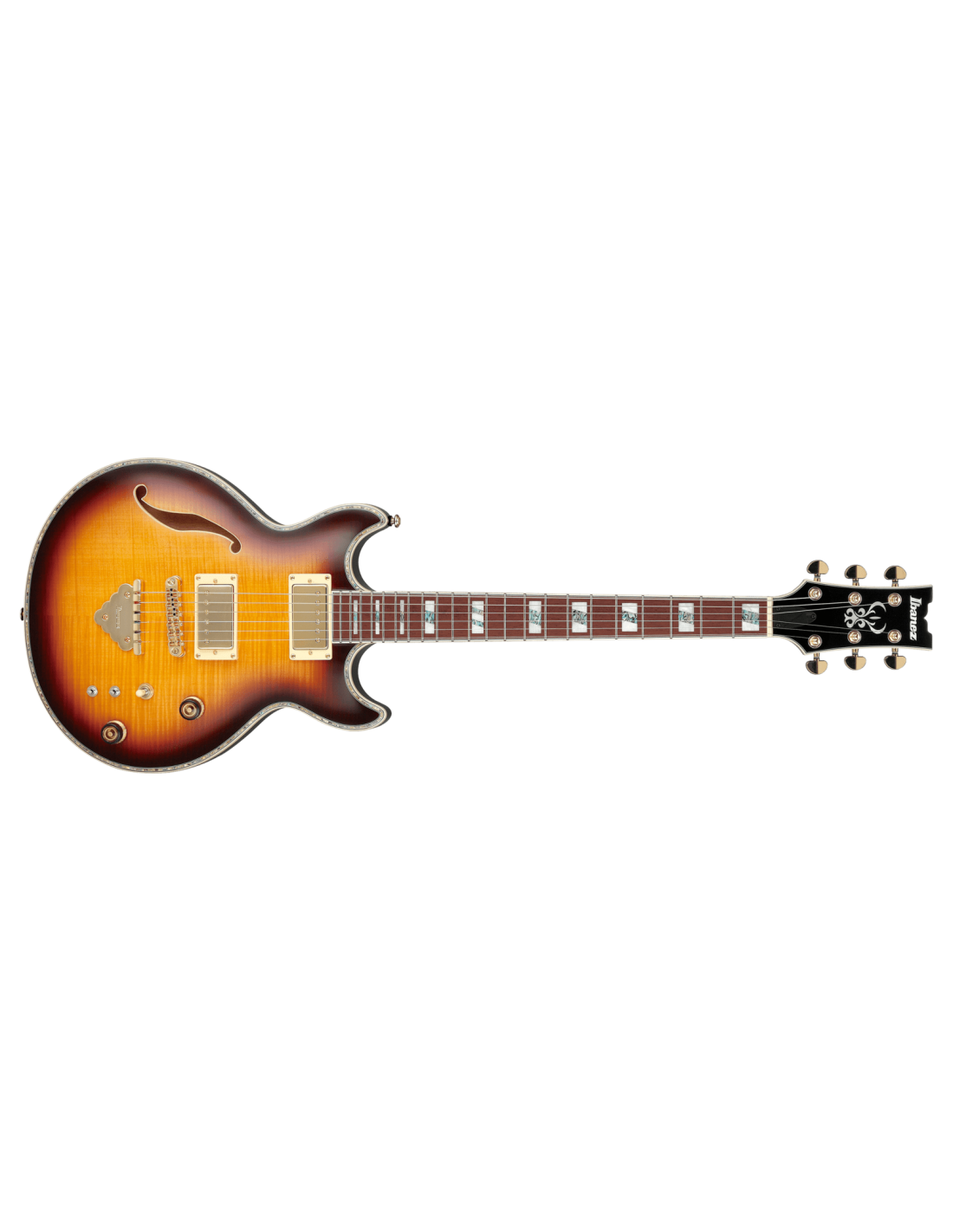 Guitare Électrique Ibanez AR520HFM, couleur Violin Sunburst. La Ibanez AR520HFM est une guitare électrique semi-acoustique à 6 cordes. Les caractéristiques techniques comprennent : un manche collé en 3 pièces d'érable. Touche bordée en Jatoba, avec repères en acrylique et en abalone. Rayon de 12", 22 frettes Medium. Corps avec table en érable flammé et une ouverture en F bordée, bloc central en érable et fond en Okoumé. L'électronique comprend deux micros Ibanez Super 58 Alnico, avec sélecteur à trois positions, contrôles de Volume et de Tonalité et deux Micro-Switch pour sélectionner trois voix différentes pour chaque micro. Quincaillerie dorée, avec chevilles Gibraltar Performer et attache-cordes Quik Change Classic.