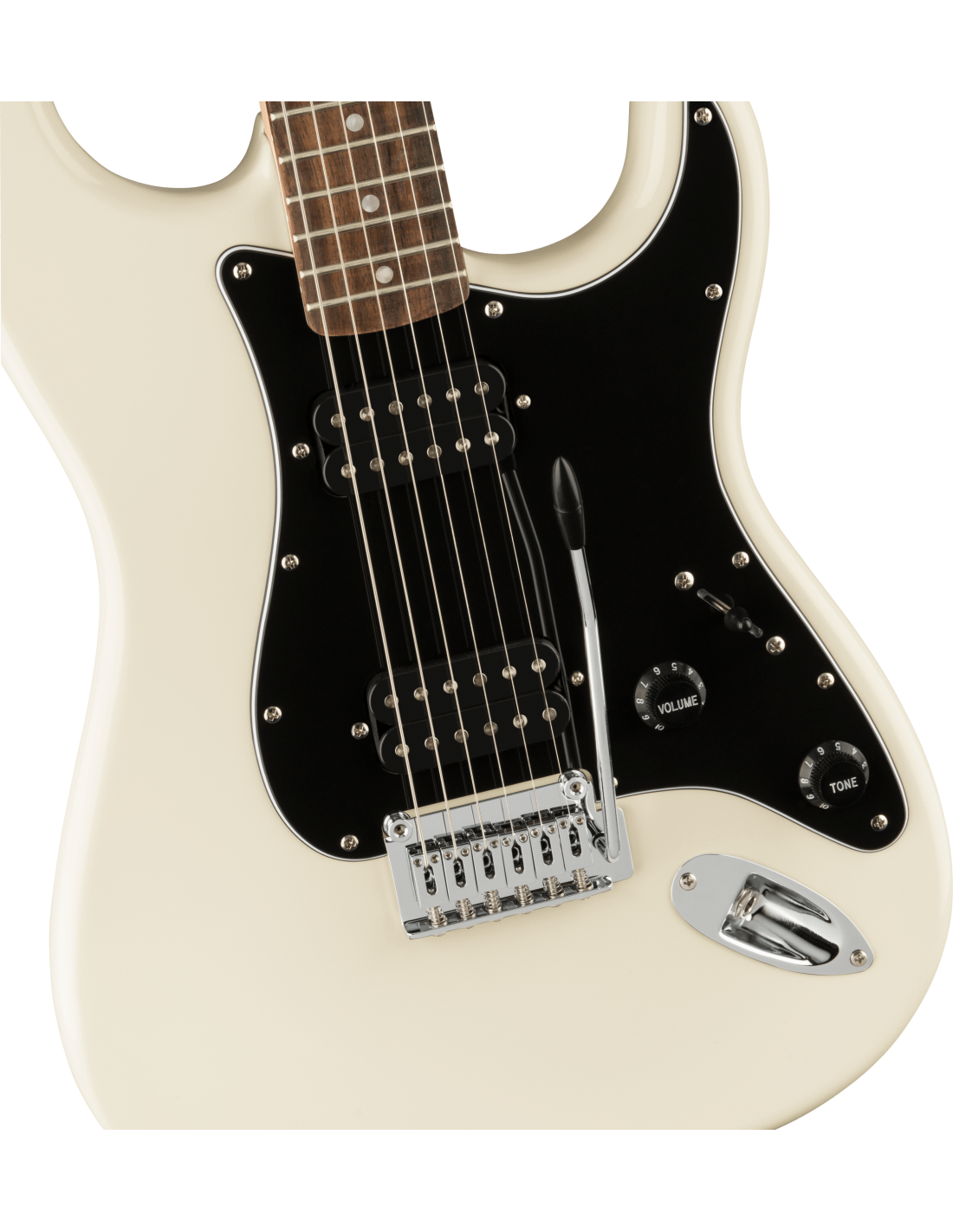 SQUIER AFFINITY STRAT HH LRL BPG OLW est une guitare électrique solid body, modèle Affinity Series Stratocaster HH, avec un corps en peuplier et une finition en polyuréthane brillant, un manche en érable en forme de profil "C", un doigté en laurier indien avec un rayon de 9,5" avec 21 frettes Medium Jumbo et des incrustations Pearloid Dot avec des points latéraux blancs, un pickguard noir, un truss rod à réglage standard, un sillet en os synthétique, du matériel nickelé, des mécaniques Sealed Die-Cast avec des arbres divisés, un abaisse-cordes Dual Wing et un pont à tremolo synchronisé 2-Point avec des selles Block. L'électronique à configuration HH consiste en 2 micros Ceramic Humbucker avec des contrôles Master Volume, Master Tone et un sélecteur de micros à 3 voies.