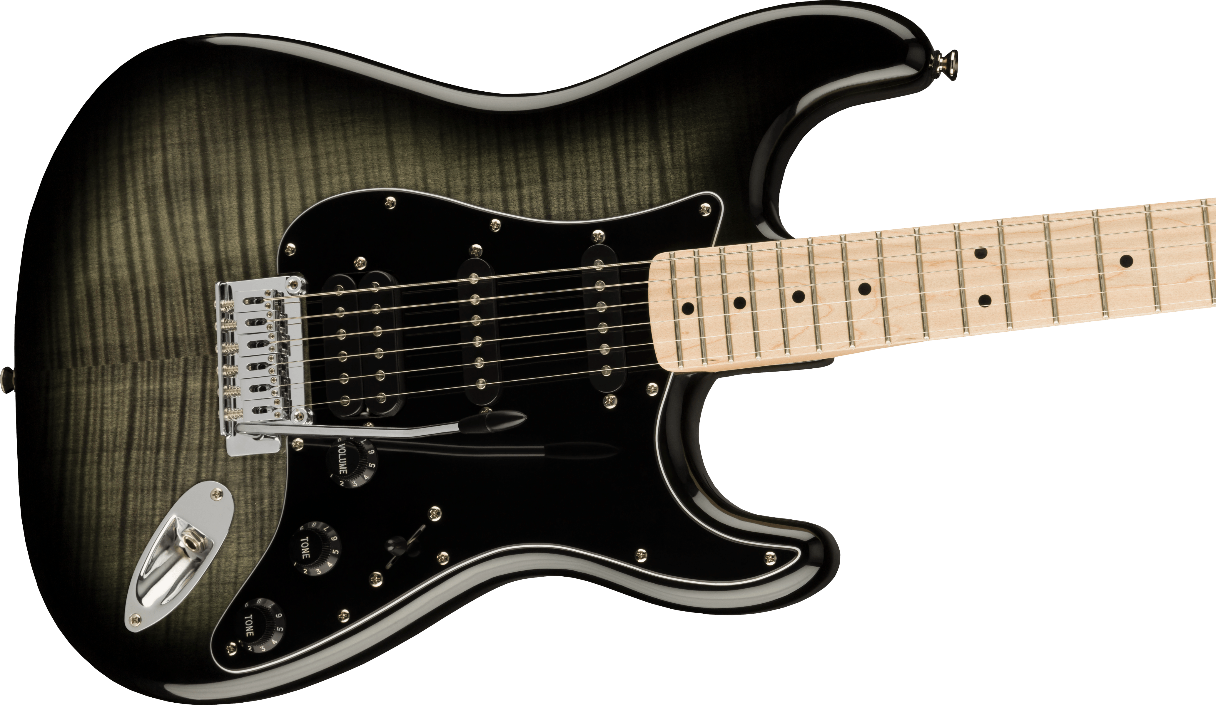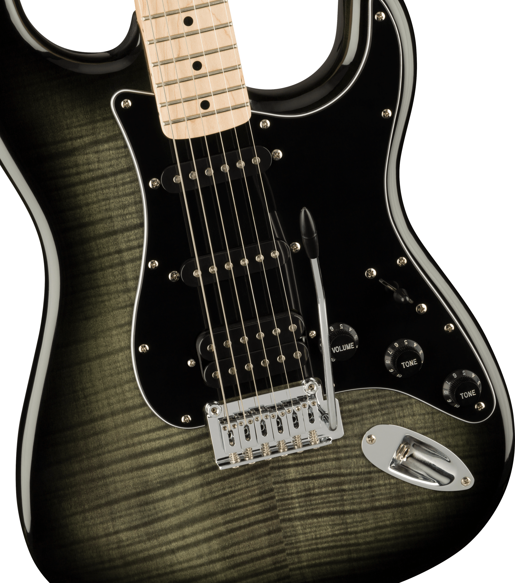 SQUIER AFFINITY STRAT FMT HSS MN BPG BBST est une guitare électrique solid body, modèle Affinity Series Stratocaster FMT HS, avec un corps en peuplier et une finition en polyuréthane brillant, un dessus en érable flammé FMT, un manche en érable en profil "C", un doigté en érable avec un rayon de 9,5" avec 21 frettes Medium Jumbo et des incrustations Black Dots avec des points latéraux noirs, un pickguard noir, un truss rod à réglage standard, un sillet en os synthétique, un matériel nickelé, des mécaniques Sealed Die-Cast avec des arbres divisés, un abaisse-cordes Dual Wing et un pont à tremolo synchronisé 2-Point avec des selles Block. L'électronique à configuration HSS consiste en 1 micro Ceramic Humbucker au pont et 2 micros Ceramic Single-Coil au centre et au manche avec un contrôle de volume principal, 2 contrôles de tonalité principale et un sélecteur de micro à 5 voies.