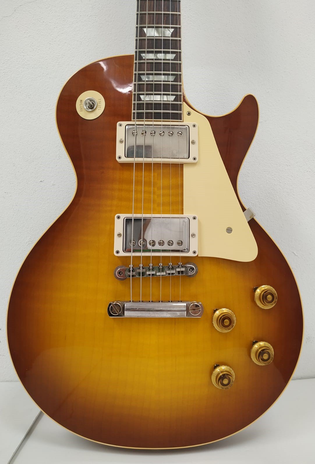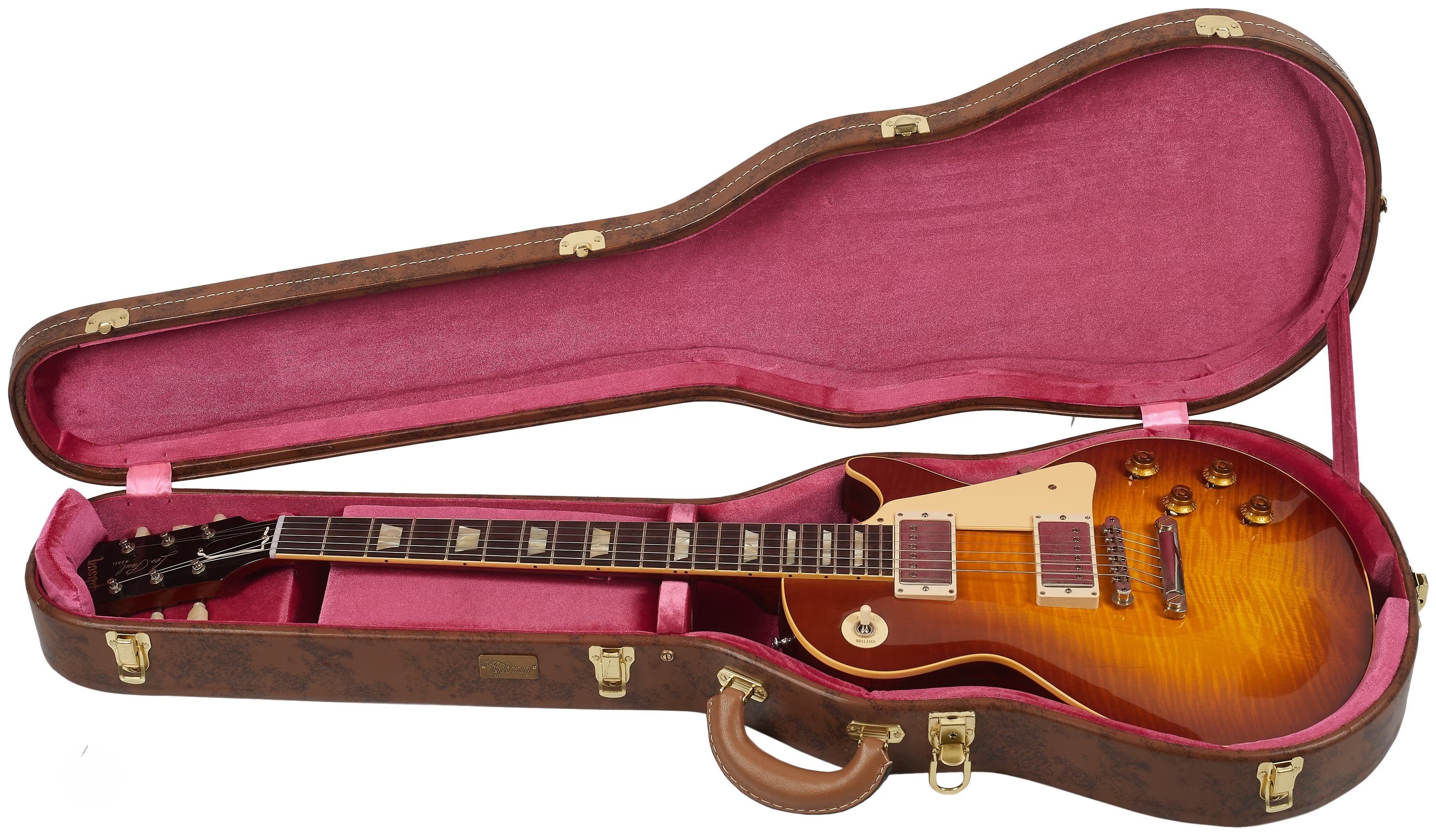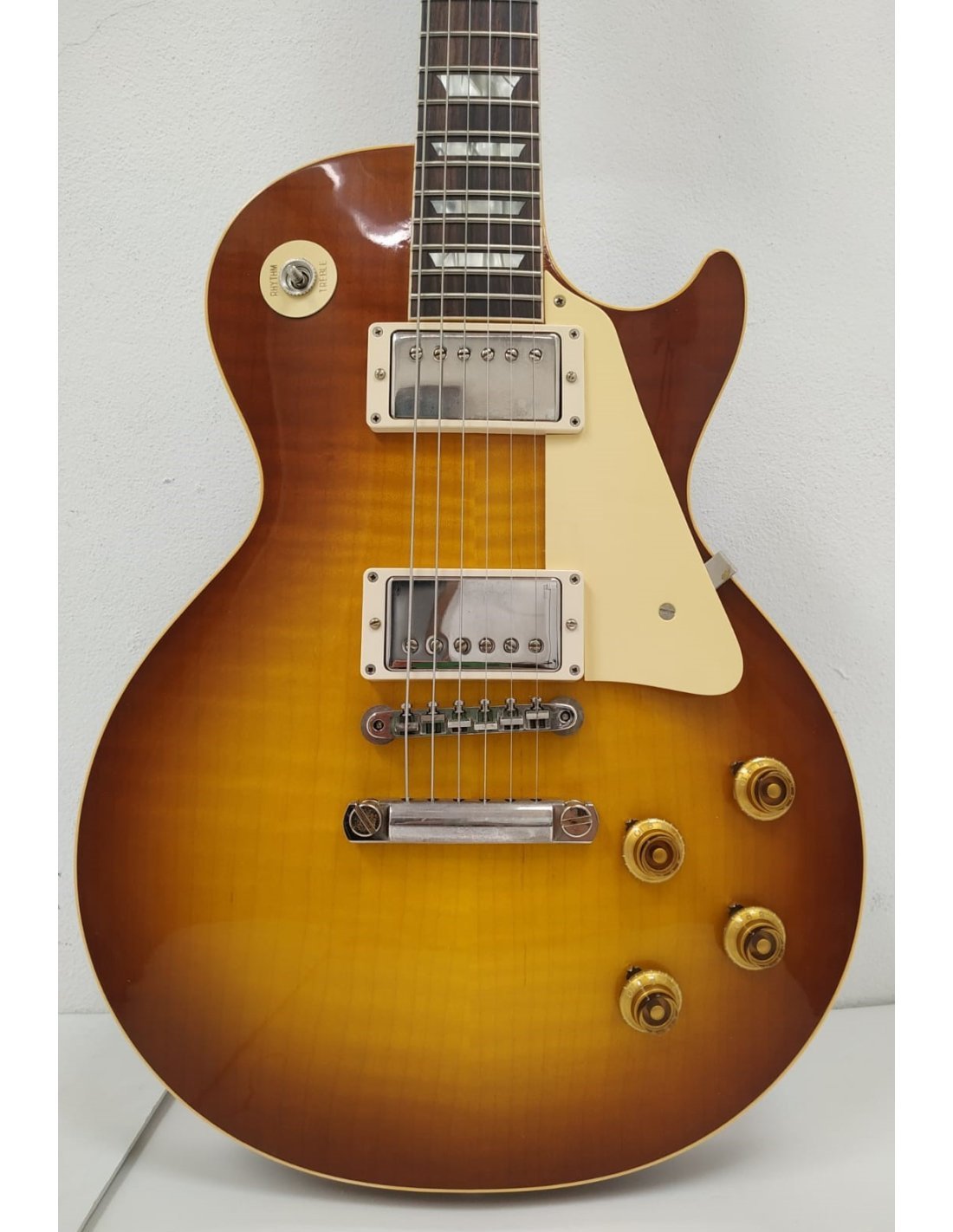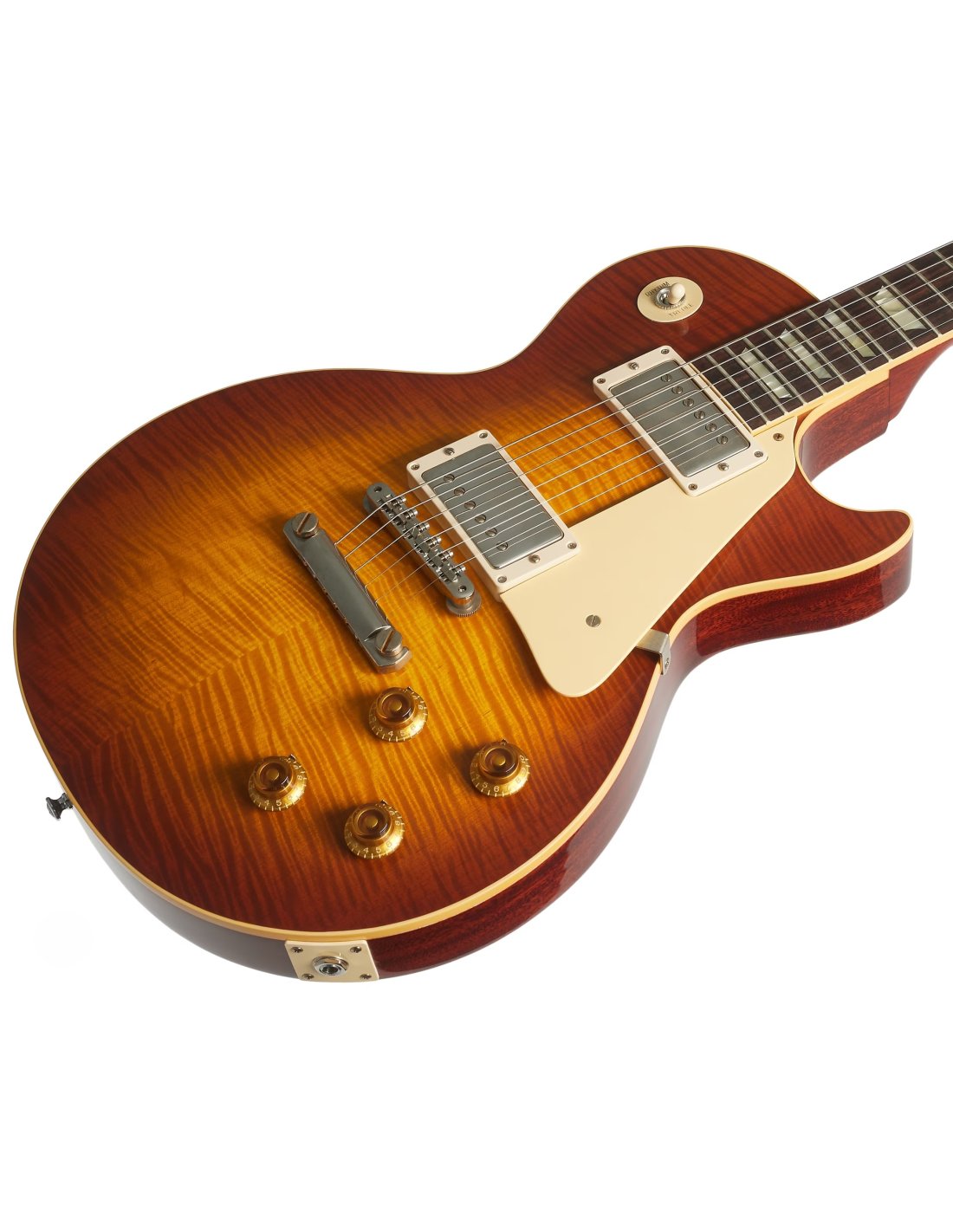 GIBSON LES PAUL '59 ICED TEA BURST VOS NH S/N 912515 è una chitarra elettrica solid body, modello Gibson Custom 1959 Les Paul Standard Reissue, con corpo in Mogano alleggerito e Top in Acero Figurato 2 pezzi a finitura Nitrocellulose VOS (Vintage Patina), manico in Mogano a profilo 50s Rounded Medium C, tastiera in Palissandro Indiano a raggio 12" con 22 tasti Historic Medium Jumbo e intarsi Cellulose Nitrate Trapezoid, capotasto in Nylon, hardware nichelato, meccaniche Kluson Single Line-Single Ring e ponte Gibson ABR-1 Tune-O-Matic con sellette in ottone e cordiera Lightweight Aluminum Stop Bar. L'elettronica a configurazione HH, consiste in 2 pickup Gibson CustomBucker Alnico III con potenziometri CTS 500K Audio Taper, condensatori carta-olio, 2 controlli Master Volume, 2 controlli Master Tone e selettore pickup a 3 vie. Include la custodia Gibson Brown Lifton 5-Latch Case e certificato di autenticità Gibson.