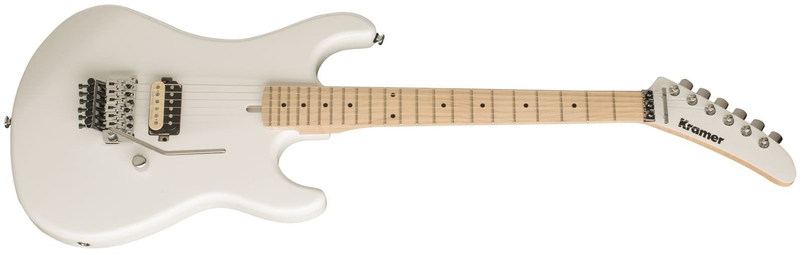 Guitare électrique Kramer "The 84" couleur Matte White. La Kramer "The 84" est une guitare électrique à 6 cordes. Les caractéristiques techniques incluent : corps en aulne, manche en érable avec profil K-Speed SlimTaper C, touche en érable, rayon 12”, 22 frettes Medium Jumbo, pont Tremolo Floyd Rose Série 1000, Pickup Seymour Duncan JB, contrôles de volume avec interrupteur Push/Pull pour la connexion série/parallèle du pickup.