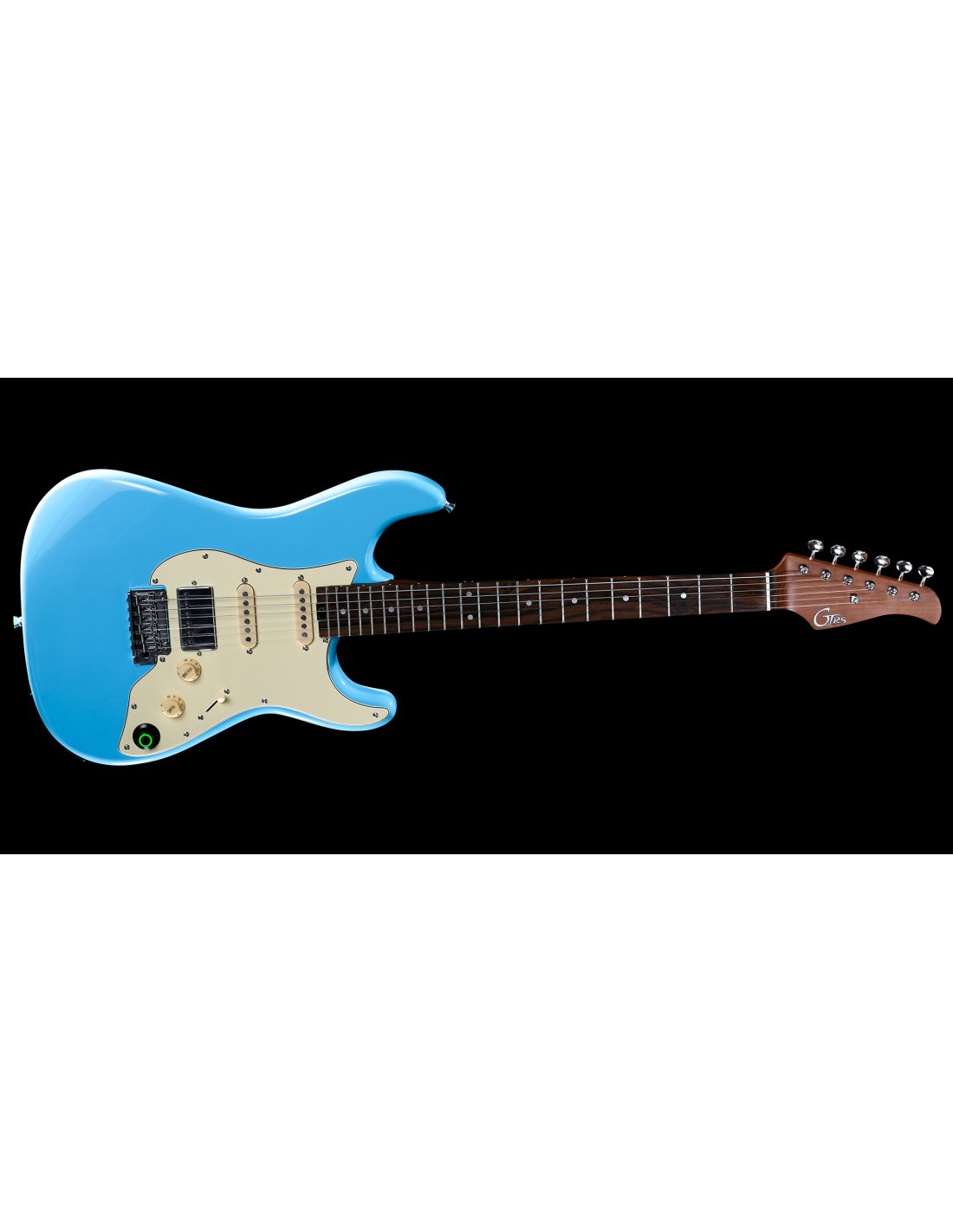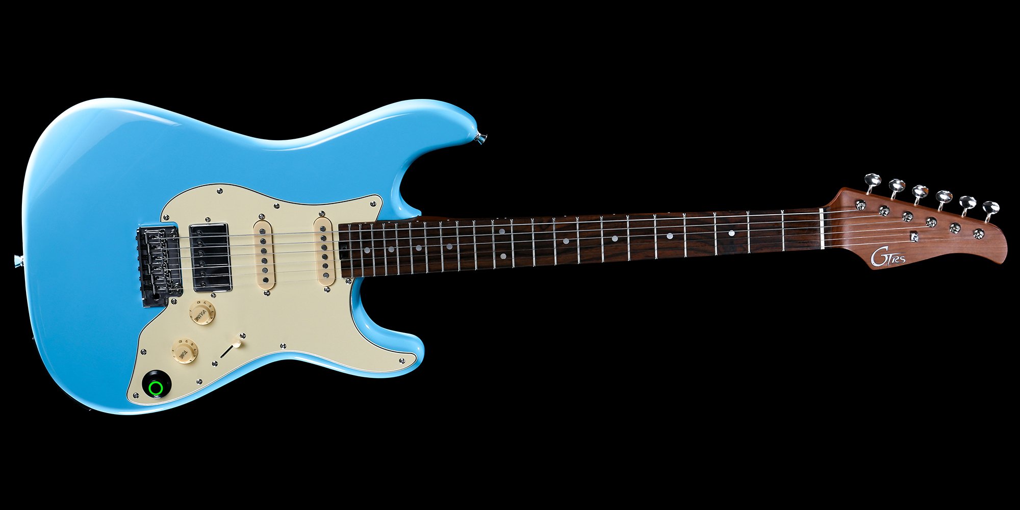 Guitare électrique solid-body avec processeur numérique. Construction : Bolt-on. Échelle : 25-1/2. Manche : Érable torréfié. Finition du manche : Naturel satiné. Mécaniques : Style vintage chrome. Sillet : 1 5/8, Os. Profil : Standard C. Touche : Palissandre. Rayon de la touche : 12. Frettes : 22 Nickel Silver, Jumbo. Truss Rod : Dual Action Steel. Corps : Tilleul américain. Finition du corps : Poly. Couleur : Sonic Blue. Matériel : Chrome. Pont : GTRS 2-Point Tremolo. Micro : GTRS SC-1N Alnico V, SC-1M Alnico V, HM-1B Alnico V. Processeur : Système de traitement intelligent GTRS. Contrôles : Volume, Ton, Super-Knob (Sortie principale/Contrôle des préréglages), Interrupteur à 5 positions. Échelle des cordes : 009-042. Accessoires inclus : GTRS gig bag, bras de tremolo, clés de réglage, câble USB-C magnétique, manuel. Prend en charge le footswitch de contrôle GWF4 (vendu séparément). Processeur GTRS. 9 simulations de guitare - 126 effets - 40 batteries - 10 métronome - Looper de 80 secondes. Bluetooth : 5.0 - APP : iOS / Android. Prend en charge le partage via le cloud. Alimentation : Batterie lithium rechargeable GLB-P1 Li-ion 4000mA. Durée : Jusqu'à 10 heures d'utilisation continue. USB-C : Prend en charge l'enregistrement et la recharge de la batterie.