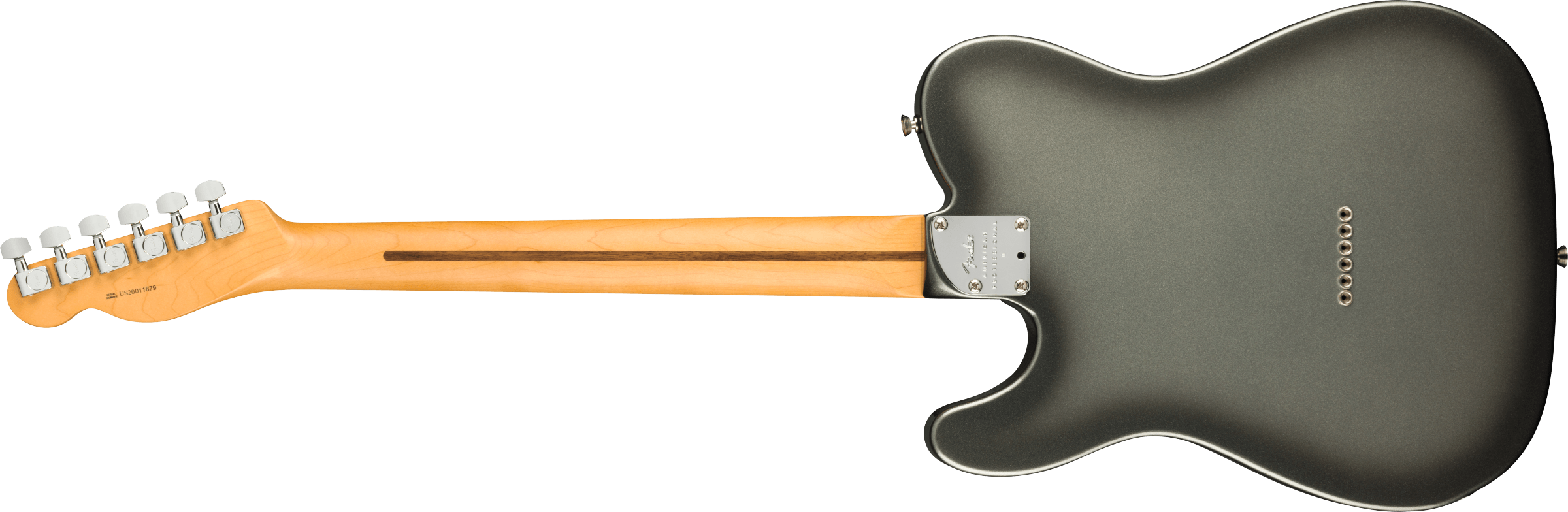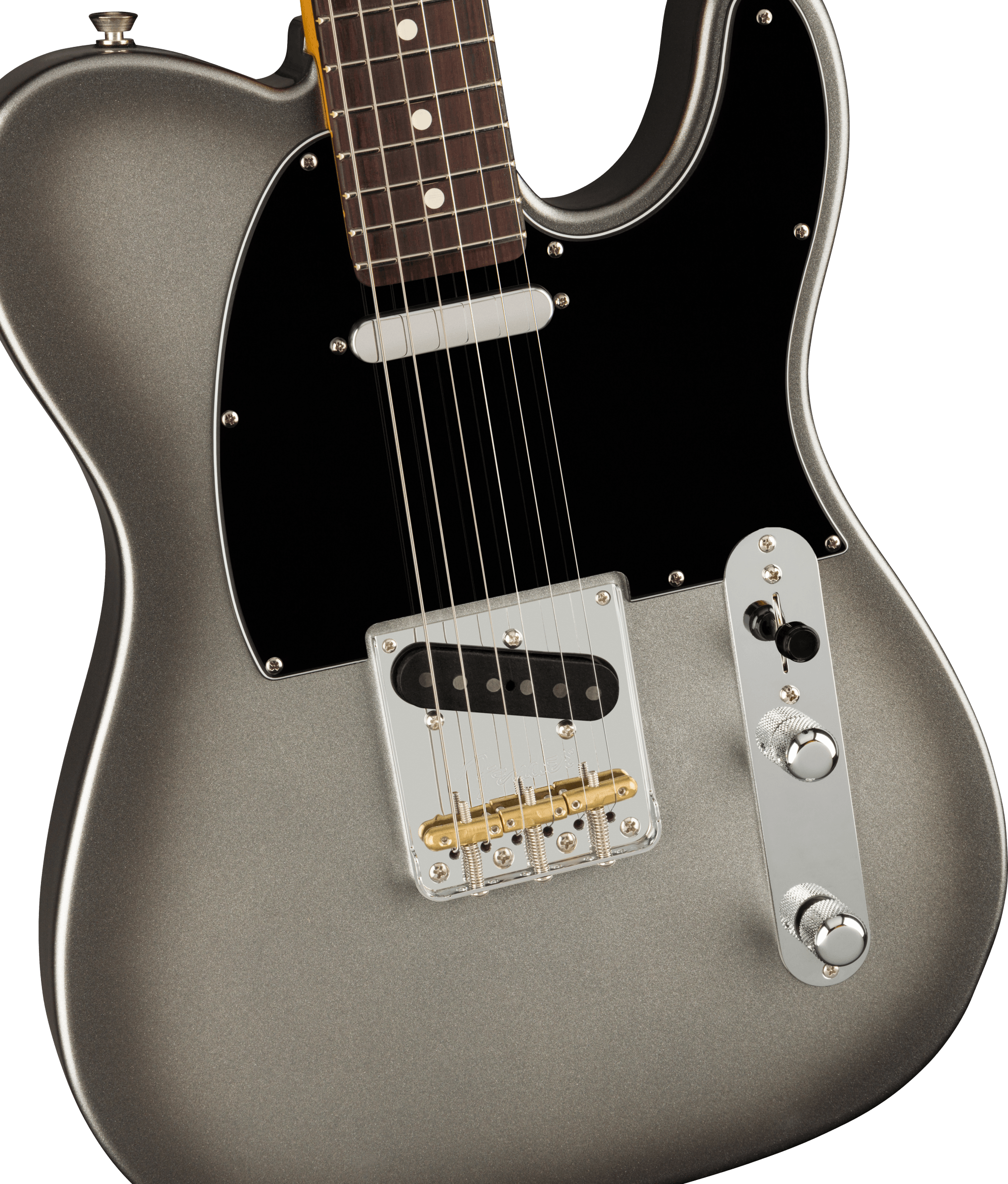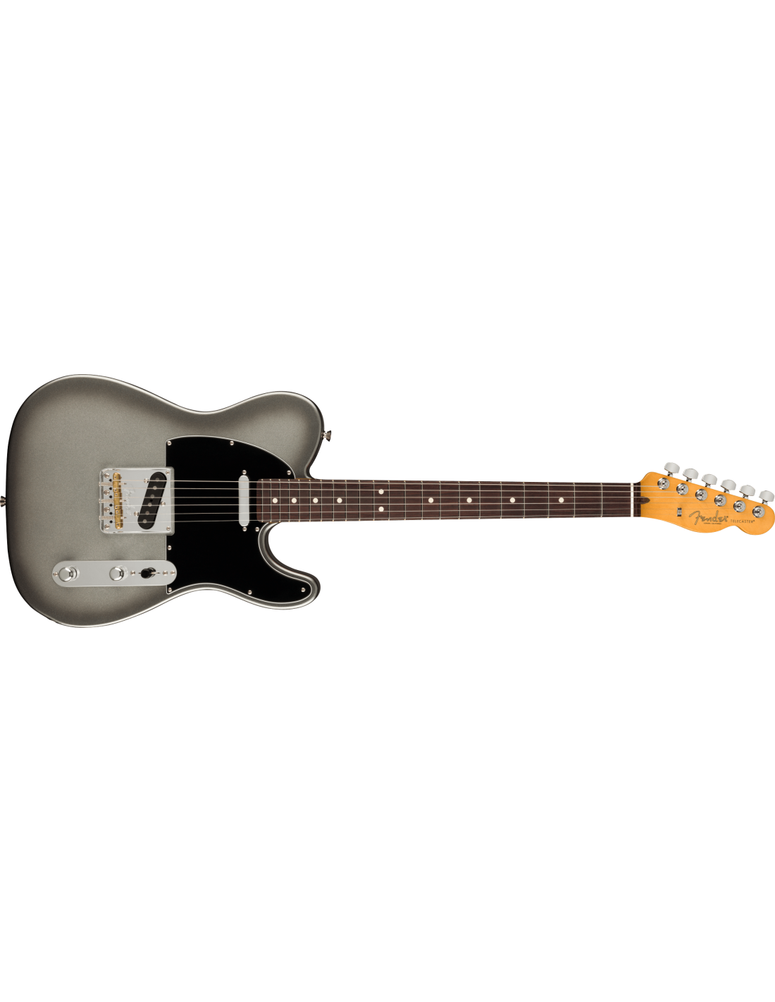 FENDER AM PRO II TELE RW MERCURY est une guitare électrique solid body, modèle American Professional II Telecaster, avec un corps en aulne et une finition en vernis uréthane, un manche en érable au profil Deep "C", un doigté en palissandre à rayon 9,5" avec 22 frettes Narrow Tall et des incrustations White Dot, un sillet en os, un matériel nickelé, des mécaniques Fender Standard Cast/Sealed Staggered avec un abaisse-cordes Single-Wing et un pont Top-Load/String-Through Tele à 3 sellets en laiton "Bullet". L'électronique à configuration SS consiste en 2 micros V-Mod II Single-Coil Tele, avec un contrôle Master Volume, un contrôle Master Tone, un sélecteur de micros à 3 voies, un circuit Treble Bleed qui préserve les fréquences aiguës en abaissant le volume, et un Push-Push sur le contrôle de Ton pour la configuration des micros en série. Inclut un étui moulé Fender Deluxe