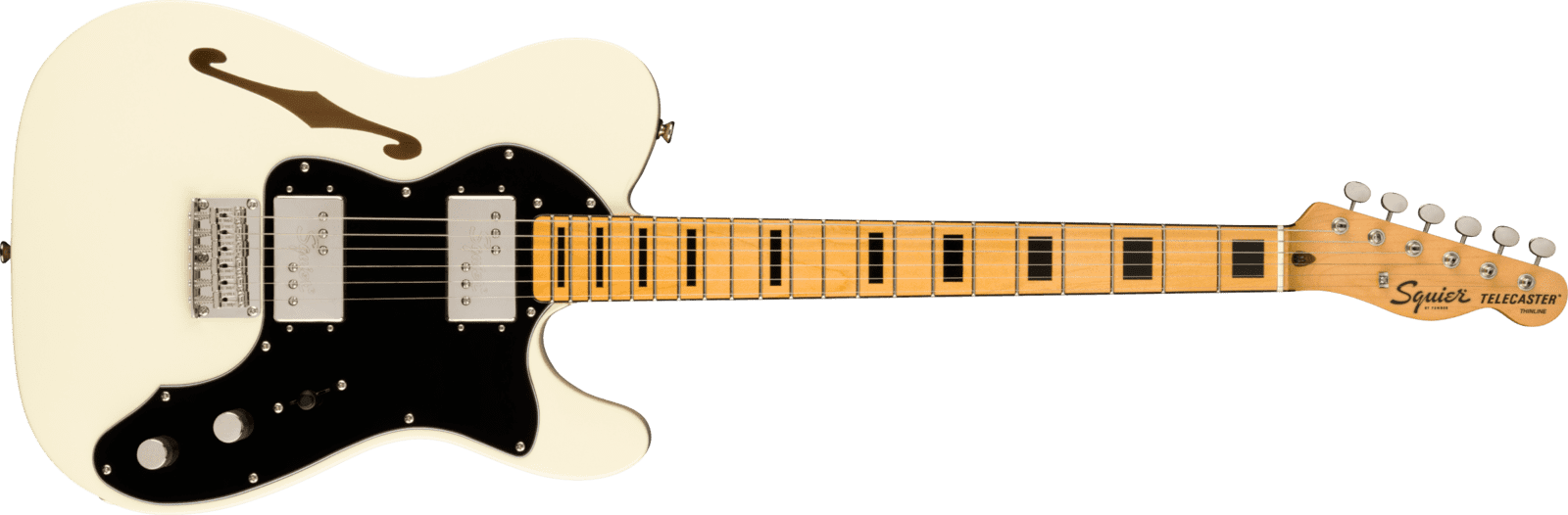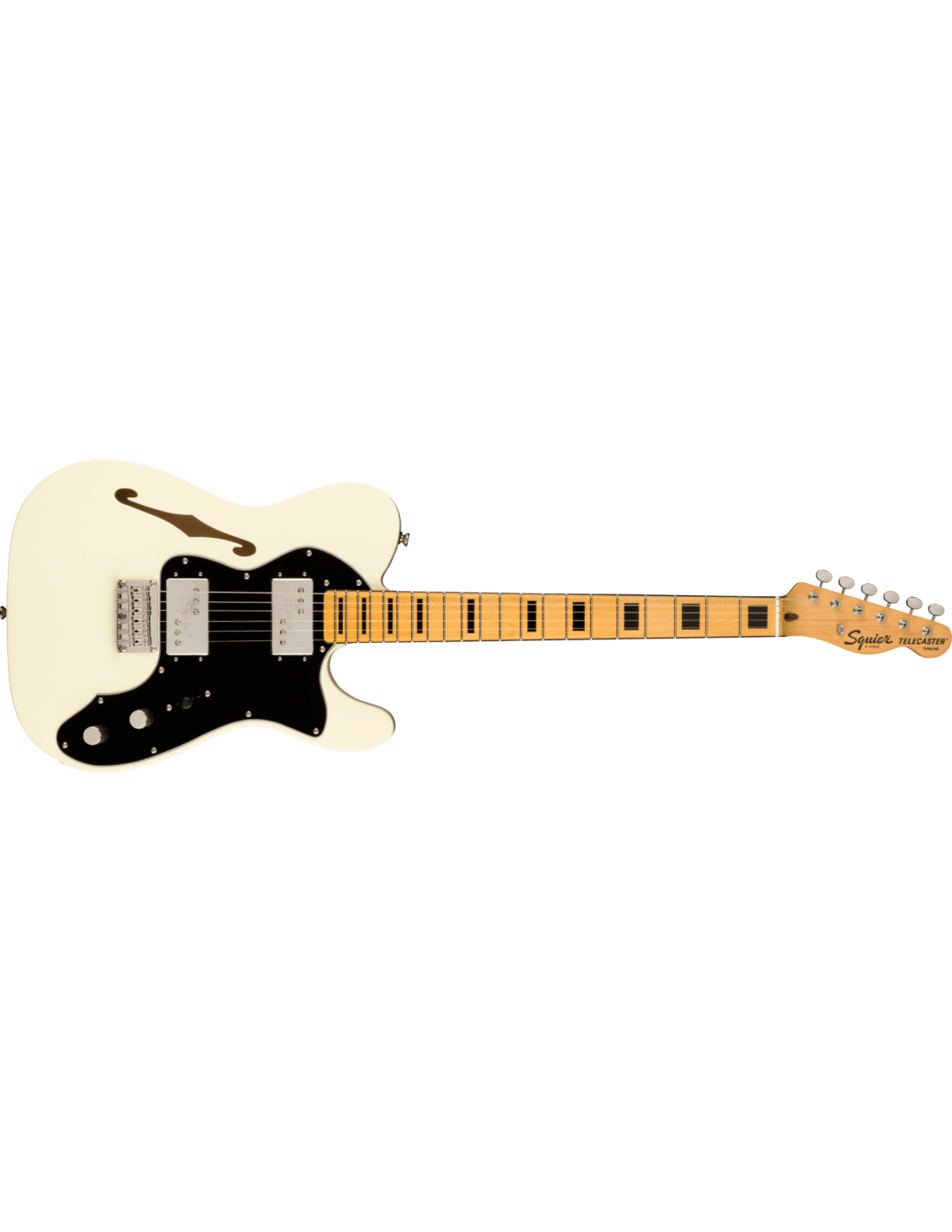 Guitare Électrique Squier FSR Classic Vibe Tele 70s couleur Olympic White. La Squier FSR Classic Vibe Tele 70s est une guitare électrique à 6 cordes. Les caractéristiques techniques comprennent : manche et touche en érable, profil C, rayon 9,5", 21 frettes Narrow Tall et repères de touche en bloc, noirs. Le corps est en érable, de type Telecaster Thinline avec une découpe en F. L'électronique se compose de deux micros Fender Designed Wide Range Humbucking. Contrôles de Volume/Volume/Ton/Ton et sélecteur à 3 positions. Le matériel est chromé, avec un pont fixe à 6 sillets.