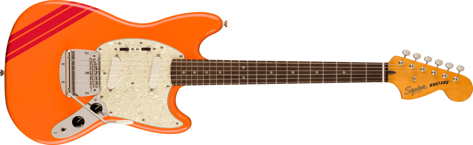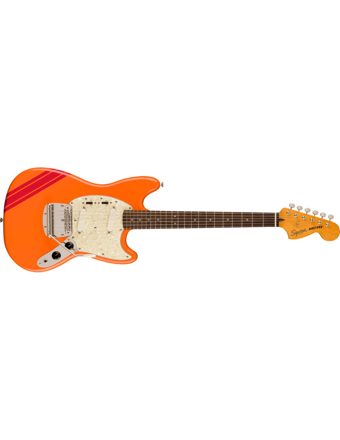 Guitare Électrique Squier FSR Classic Vibe 60S Competition Mustang couleur Capri Orange. La Squier FSR Classic Vibe 60S Competition Mustang est une guitare électrique à 6 cordes. Les caractéristiques techniques comprennent un manche en érable avec profil C, un touche en laurier indien avec un rayon de 12", 22 frettes Narrow Tall. Corps en peuplier, avec un pickguard en pearloid. L'électronique se compose de deux micros Alnico Single Coil, de contrôles de Volume et de Ton, d'un sélecteur à 3 positions et de deux interrupteurs pour On/Off et inversion de phase. Le matériel est chromé, avec un pont vibrato Vintage Mustang.