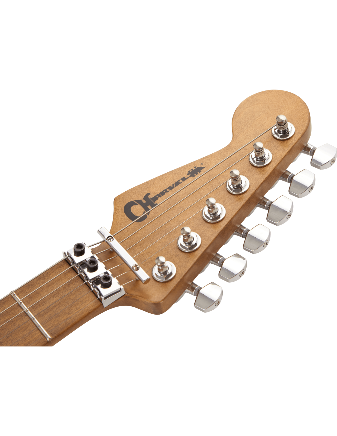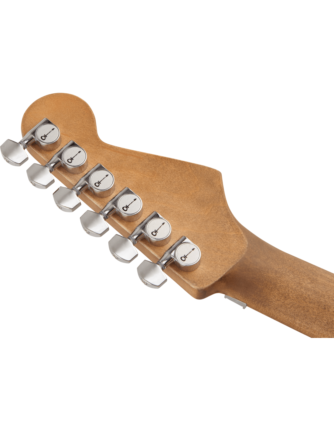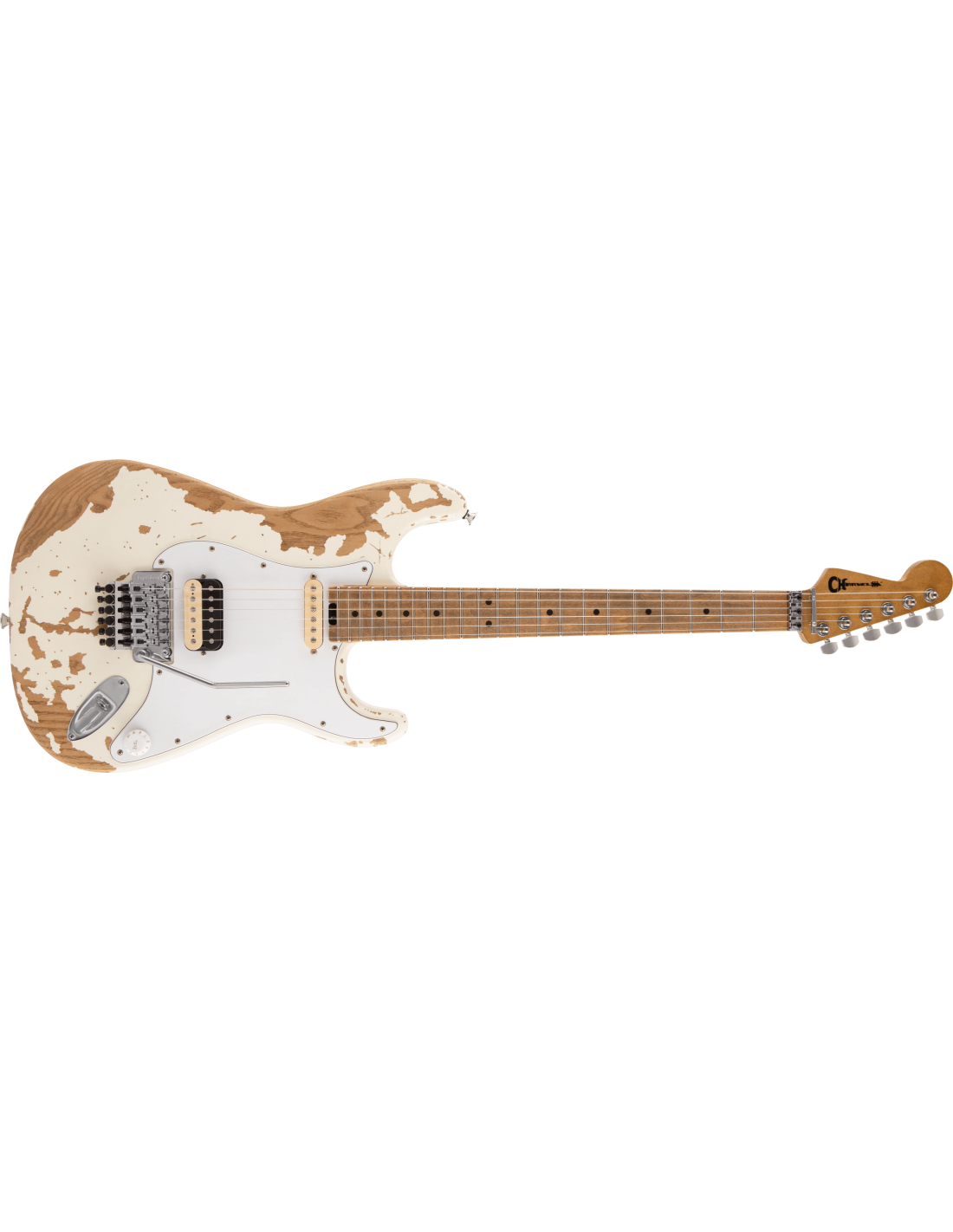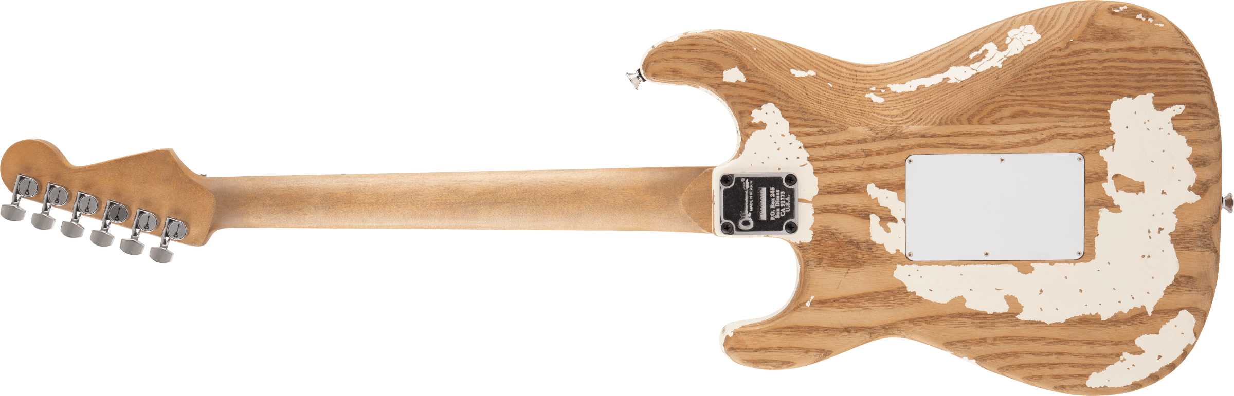 CHARVEL PRO MOD HENRIK DANHAGE LTD HEAVY RELIC HS est une guitare électrique solid body So-Cal 1 style, modèle Henrik Danhage Limited Edition Signature Pro-Mod avec un corps en frêne relic, un manche en érable relic au profil Speed Neck avec bords arrondis et renfort en graphite, un doigté en érable à rayon composite 12"-16" avec 22 frettes Jumbo et des incrustations Black Dots avec des points latéraux noirs, un sillet Floyd Rose 1000 Series Locking, une tête Reverse Strat Style, un matériel chromé relic, des mécaniques Charvel-Branded pressofuse, un abaisse-cordes Floyd Rose Retainer Bar et un pont Floyd Rose 1000 Series Double-Locking Tremolo (Top-Mount). L'électronique à configuration HS consiste en 1 micro humbucker Seymour Duncan JB TB-4 au pont et 1 micro simple bobinage DiMarzio Area 67 DP419CR au manche et un contrôle de volume de style Strat avec push/pull pour la sélection des micros.