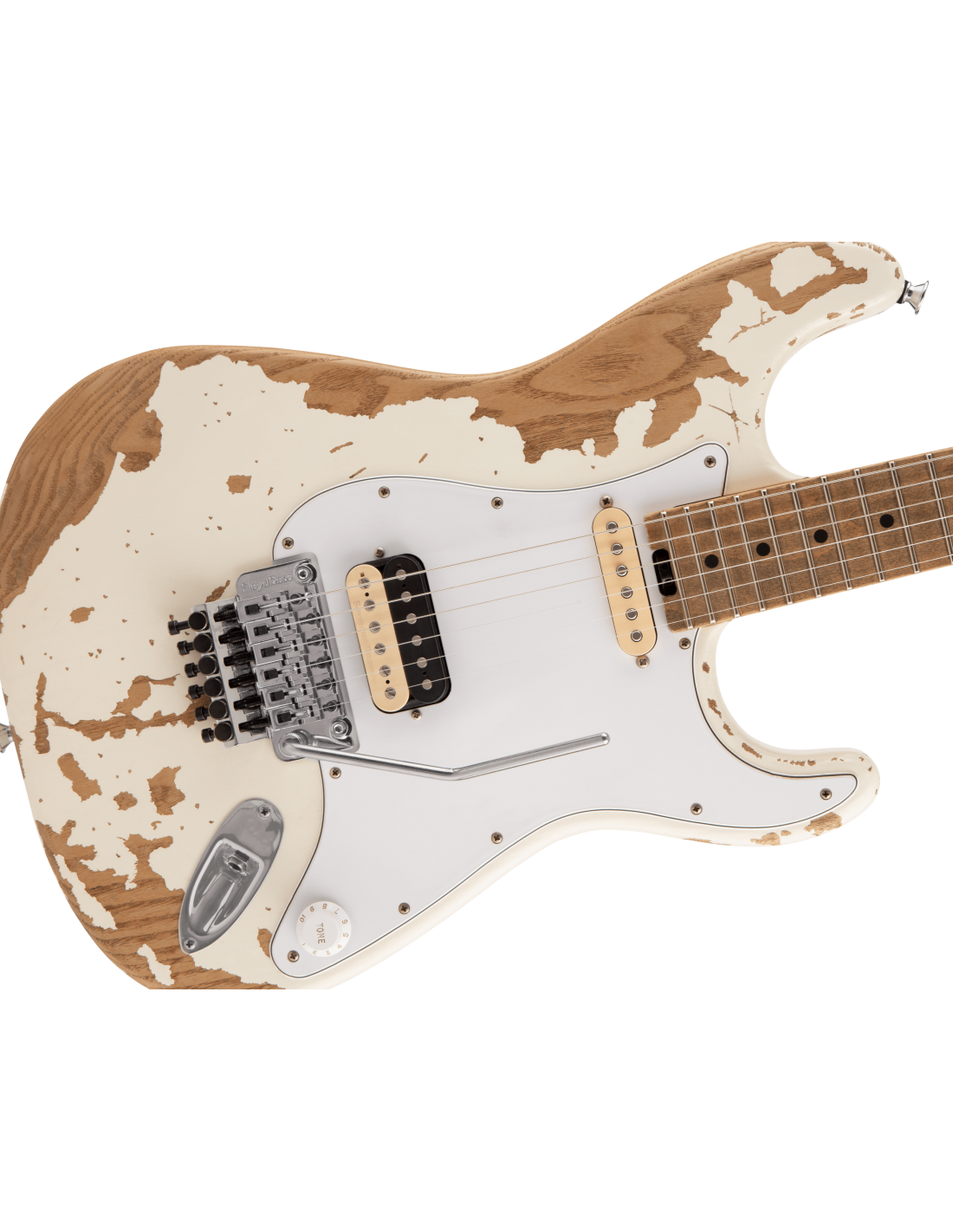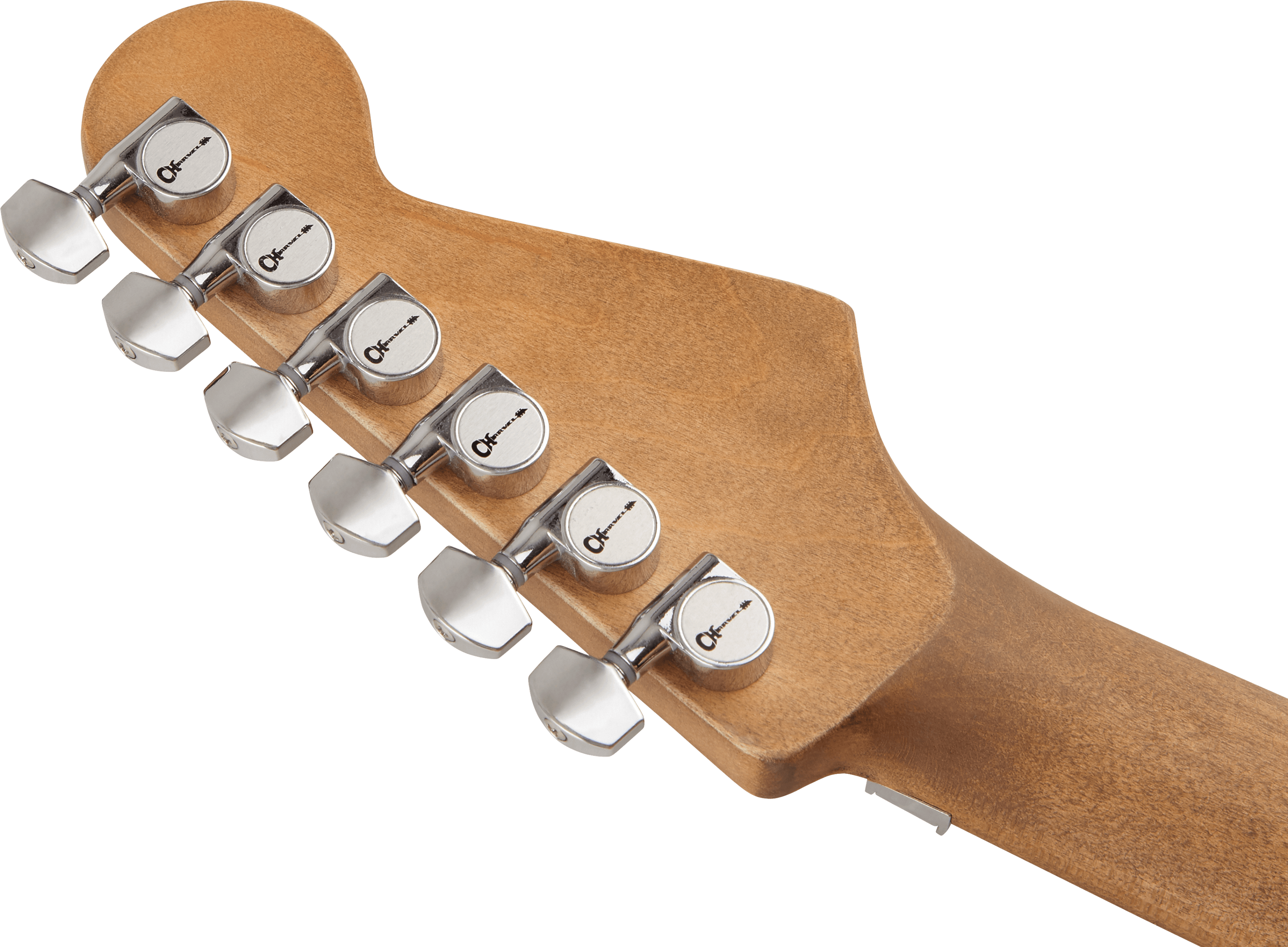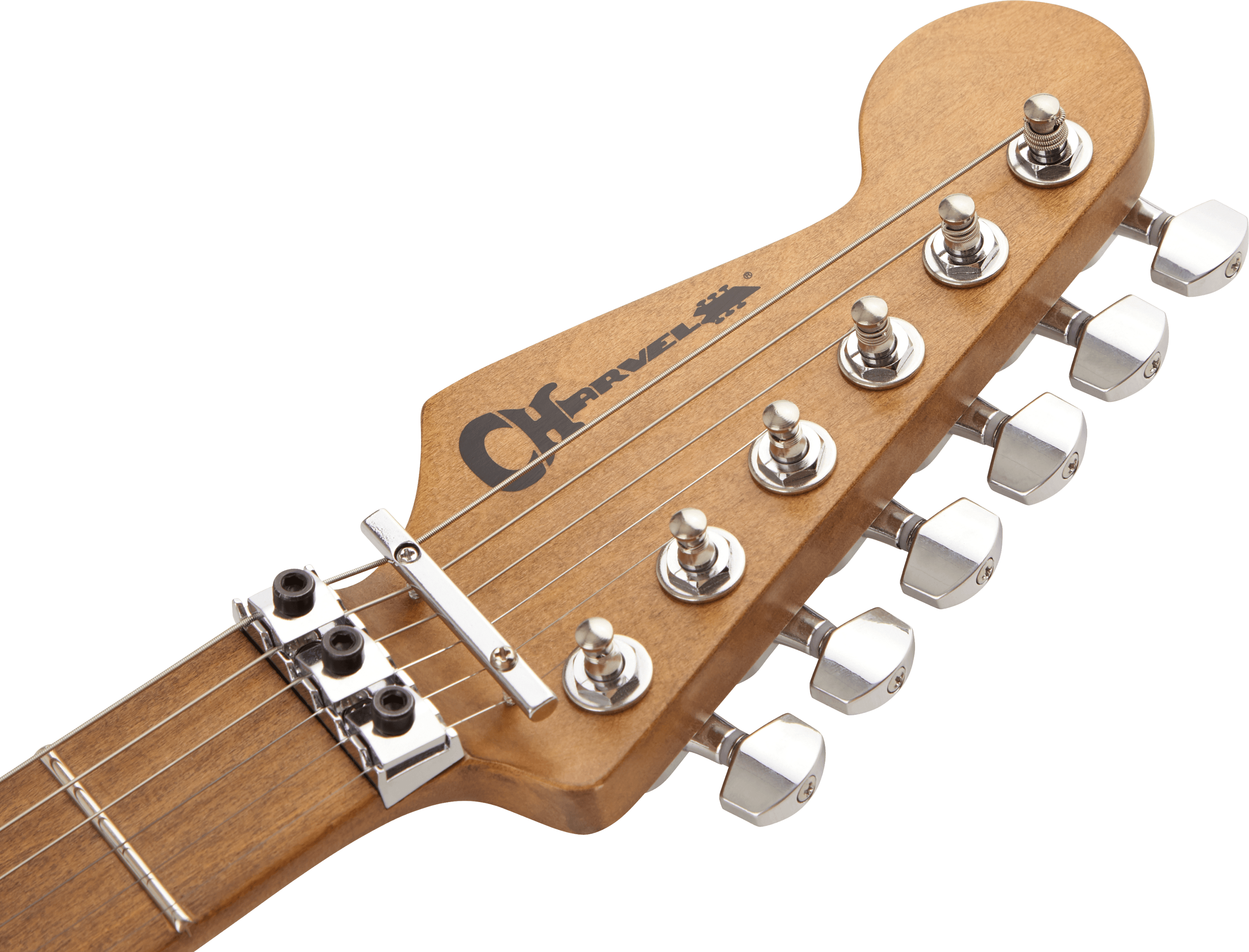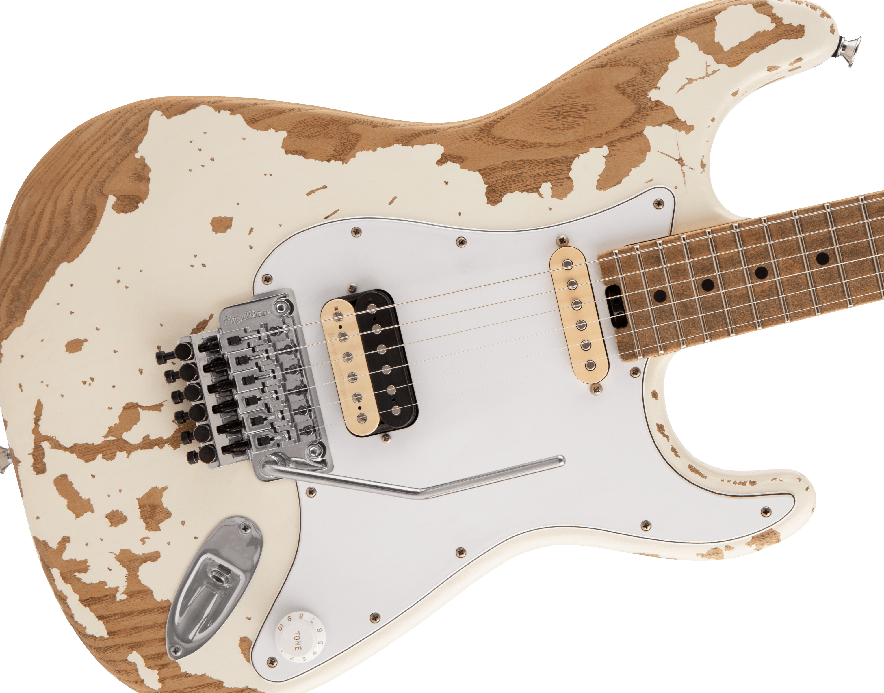 CHARVEL PRO MOD HENRIK DANHAGE LTD HEAVY RELIC HS est une guitare électrique solid body So-Cal 1 style, modèle Henrik Danhage Limited Edition Signature Pro-Mod avec un corps en frêne relic, un manche en érable relic au profil Speed Neck avec bords arrondis et renfort en graphite, un doigté en érable à rayon composite 12"-16" avec 22 frettes Jumbo et des incrustations Black Dots avec des points latéraux noirs, un sillet Floyd Rose 1000 Series Locking, une tête Reverse Strat Style, un matériel chromé relic, des mécaniques Charvel-Branded pressofuse, un abaisse-cordes Floyd Rose Retainer Bar et un pont Floyd Rose 1000 Series Double-Locking Tremolo (Top-Mount). L'électronique à configuration HS consiste en 1 micro humbucker Seymour Duncan JB TB-4 au pont et 1 micro simple bobinage DiMarzio Area 67 DP419CR au manche et un contrôle de volume de style Strat avec push/pull pour la sélection des micros.