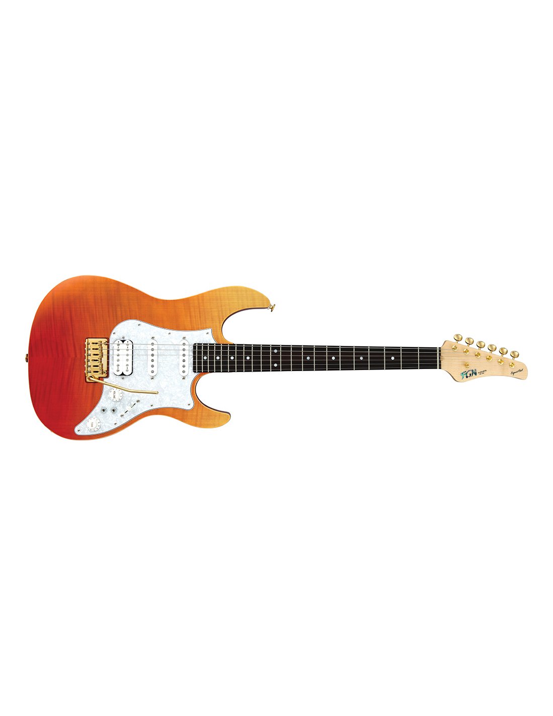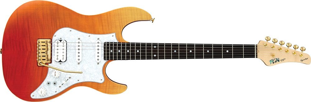 Guitare électrique solid body - Construite au Japon par Fujigen Inc. - Échelle 25.5'' - Corps en frêne avec table en érable flammé et finition à catalyseur semi-brillante - Manche bolt-on en érable en une seule pièce quarter-sawn avec profil en U - ''Z-Axis Deep Joint'': logement du manche plus profond de 1 millimètre par rapport à la norme pour minimiser la distance entre les cordes et le corps de l'instrument - ''Moonsault Heel Cutaway Joint'': talon plus fin de 5 millimètres pour garantir un accès facilité à la partie supérieure du manche - Touche en palissandre à rayon composé 10''-14'' - 22 frettes jumbo posées avec ''Circle Fretting System'': les frettes présentent une courbure progressive pour garantir une intersection à 90° constante entre les cordes et la frette sur toute la longueur de la touche - Profil de frettes Expert fini à la main - Repères de touche latéraux luminescents - Tremolo Gotoh 510TS-FE1 doré - Mécaniques locking Gotoh SD91-05M MG-T dorées - Pickup simple bobinage FGN OS-1n au manche - Pickup simple bobinage FGN OS-1c au centre - Pickup humbucking FGN OS-1b au pont - Contrôles principaux : volume master, tonalité master et sélecteur de pickup à 5 positions - ''Double Tricky Switch'': sélecteurs coil tap et bypass des contrôles (pickup du pont) - Cordes D'Addario EXL110 Nickel Wound Regular Light 10-46 - Étui rigide inclus