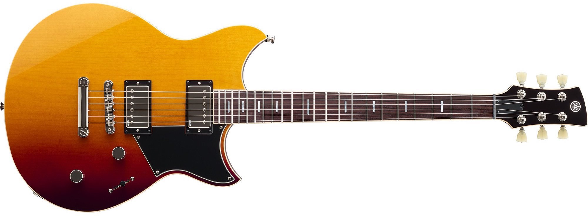 Guitare Électrique Yamaha Revstar RSS20SSB couleur SUNSET BURST. La Yamaha Revstar RSS20SSB est une guitare électrique à 6 cordes. Les caractéristiques techniques incluent un corps en acajou creusé, un manche en acajou à 3 pièces, un touche en palissandre, avec 22 frettes jumbo, un rayon de 12", un pont Tune-O-Matic et deux micros P90 Single Coil / Alnico V VP5b.