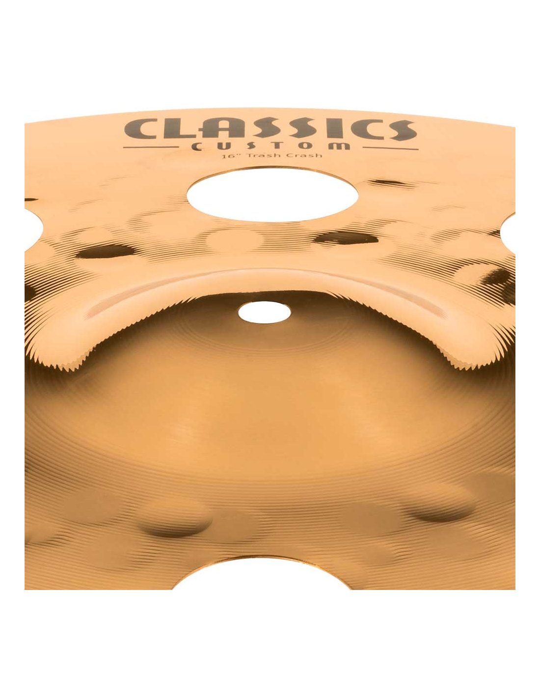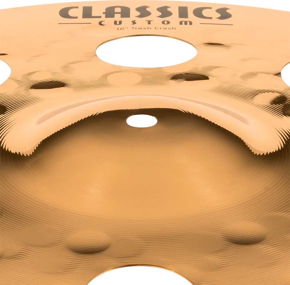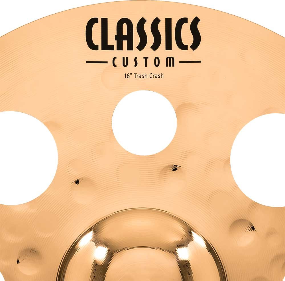 'Trash Crash 16'''' Série Classics Custom. Les cymbales de la série Classics Custom sont produites mécaniquement en Allemagne avec un alliage B10. Le processus implique diverses techniques, tant de pressage que de battage informatisé. En plus de cela, elles reçoivent un vernis brillant qui leur donne une finition brillante spectaculaire.