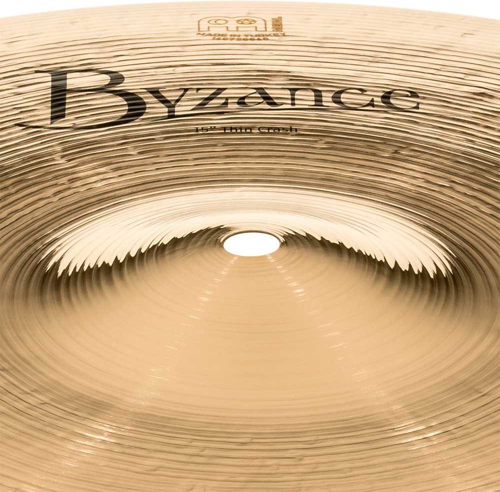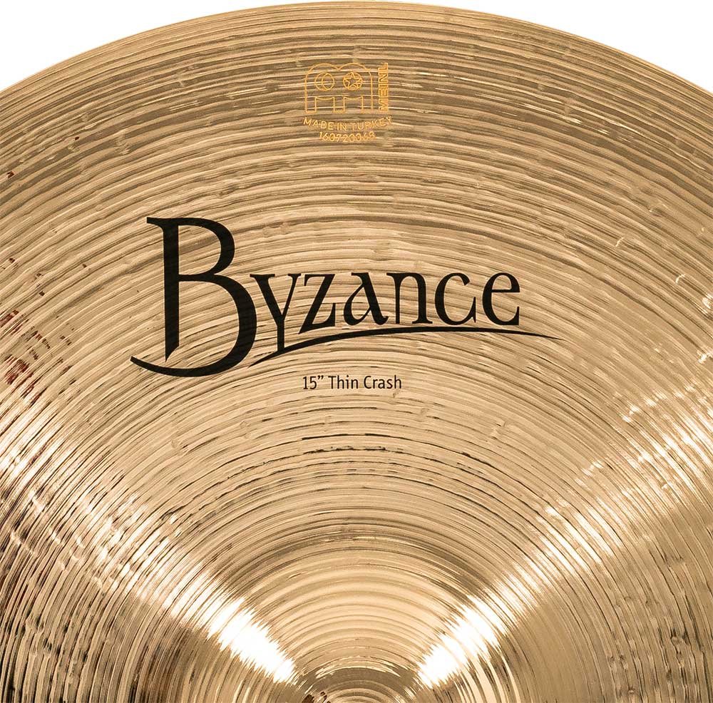 'Crash 15'' Thin, Série Byzance Brilliant. Les cymbales de la série Byzance Brilliant sont fabriquées artisanalement dans notre usine en Turquie par des spécialistes et en respectant la tradition tout au long du processus. Toutes les cymbales sont réalisées avec des disques en alliage de bronze B20. Plusieurs techniques sont impliquées dans le processus, tant le martelage que le tournage. En plus de cela, elles reçoivent un vernis brillant qui leur confère un son plus explosif et une finition brillante spectaculaire.