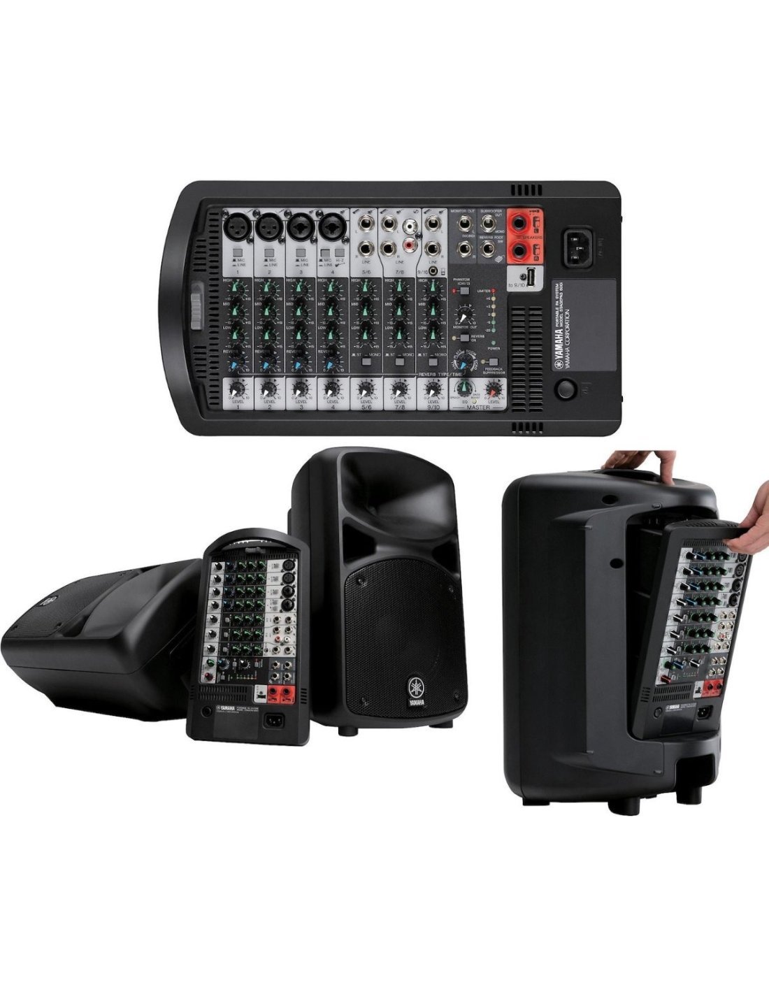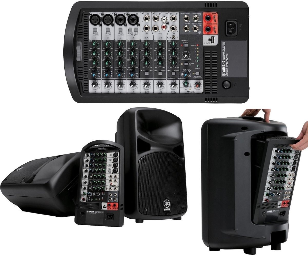 YAMAHA STAGEPAS 600BT. Système PA tout-en-un portable composé de 2 haut-parleurs de 10" avec un mixeur intégré à 8 canaux amovible. Les caractéristiques techniques incluent une puissance de 680W en classe D, un woofer de 10" et un tweeter à compression de 1", un mixeur 8 canaux amovible avec 4 canaux mono/ligne (2 XLR, 2 combo) et 4 canaux stéréo via des connexions TRS et RCA sur les canaux 7/8, un égaliseur à 3 bandes sur chaque canal et des réverbérations numériques SPX à un bouton sur les 4 premières entrées. Il présente des sorties pour moniteur et subwoofer via TRS.