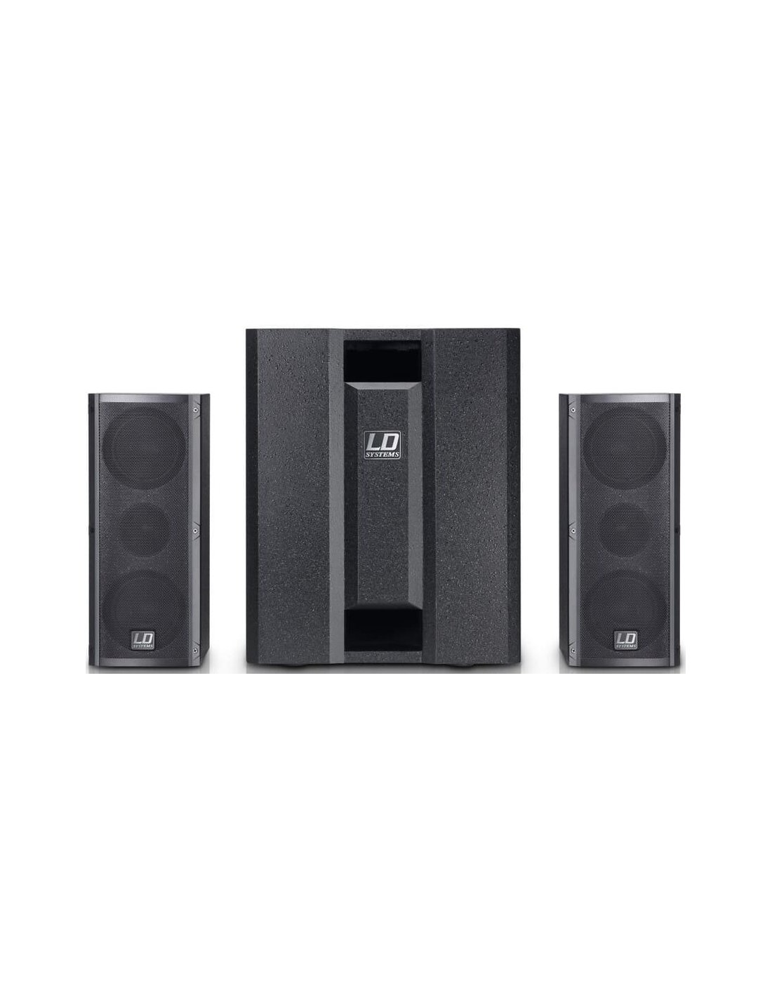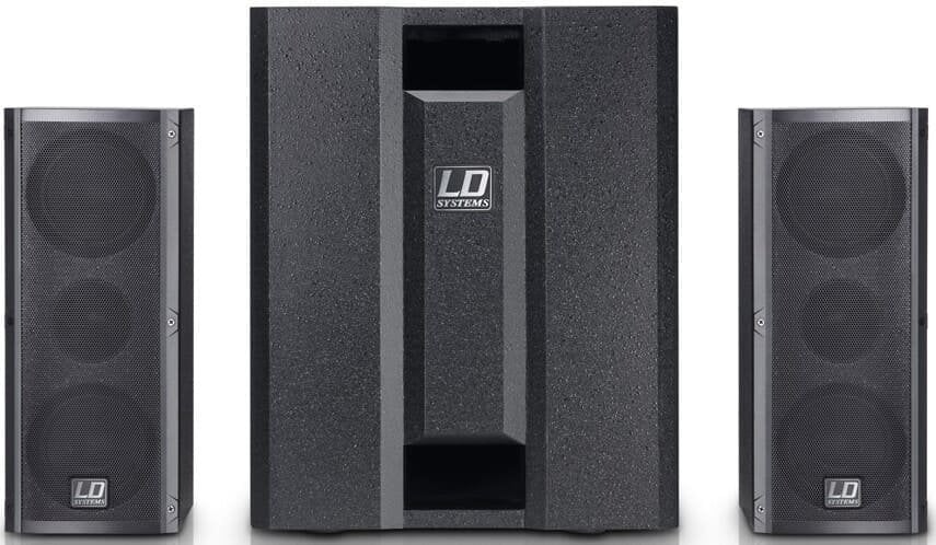 LD SYSTEMS DAVE8 ROADIE. Système audio portable composé d'un subwoofer de 8" et de 2 satellites avec des haut-parleurs midrange doubles de 4" et 1400W de puissance de crête. Les caractéristiques techniques incluent 2 haut-parleurs de 4" sur chaque satellite avec un tweeter de 1" avec un aimant en ferrite et 120Db de SPL maximum, Woofer de 8" avec un aimant en ferrite, structure avec bass reflex. Mixeur intégré à 3 canaux avec contrôle du volume, Entrée jack 6,3mm instrument et minijack aux sur ch1, Entrée micro combo XLR/TRS sur ch2, Entrée stéréo L/R via Combo et RCA sur ch3.
