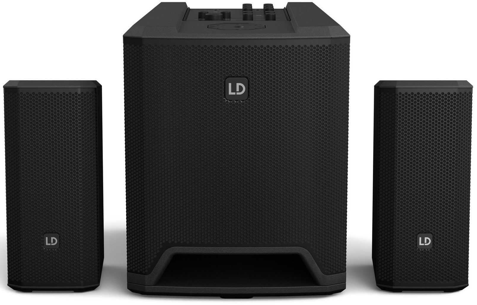 LD SYSTEMS DAVE 10 G4X. Système audio 2.1 actif composé d'un subwoofer de 10" et de 2 satellites avec doubles haut-parleurs de 4" et 680W de puissance. Les caractéristiques techniques incluent 2 haut-parleurs de 4" sur chaque satellite avec tweeter de 1" en néodyme et 120Db de SPL maximum, Woofer de 10" avec aimant en ferrite, structure avec bass reflex. Mixeur intégré à 6 canaux avec égaliseur et réverbération, Entrées sélectionnables pour dispositifs microphoniques, hi-Z ou de niveau de ligne, entrée stéréo SPDIF TOSLINK numérique. Il présente des fonctionnalités de streaming sans fil via Bluetooth, DynX DSP pour une reproduction sonore sans distorsion et préréglages sélectionnables selon la configuration (mode stéréo / cluster)