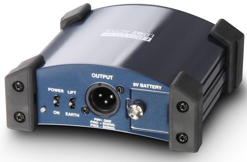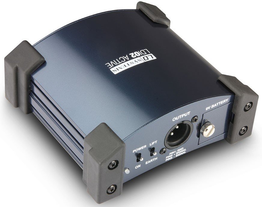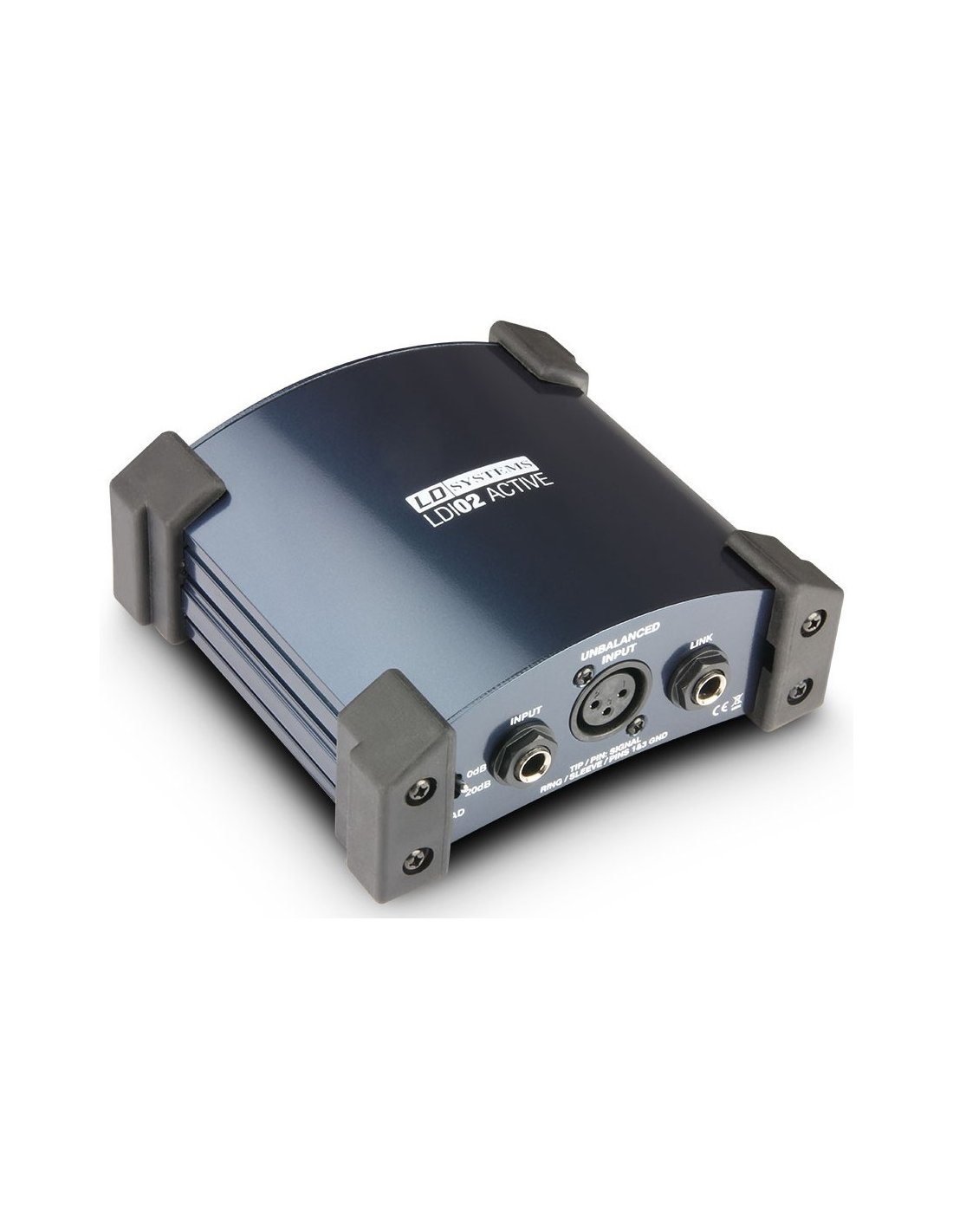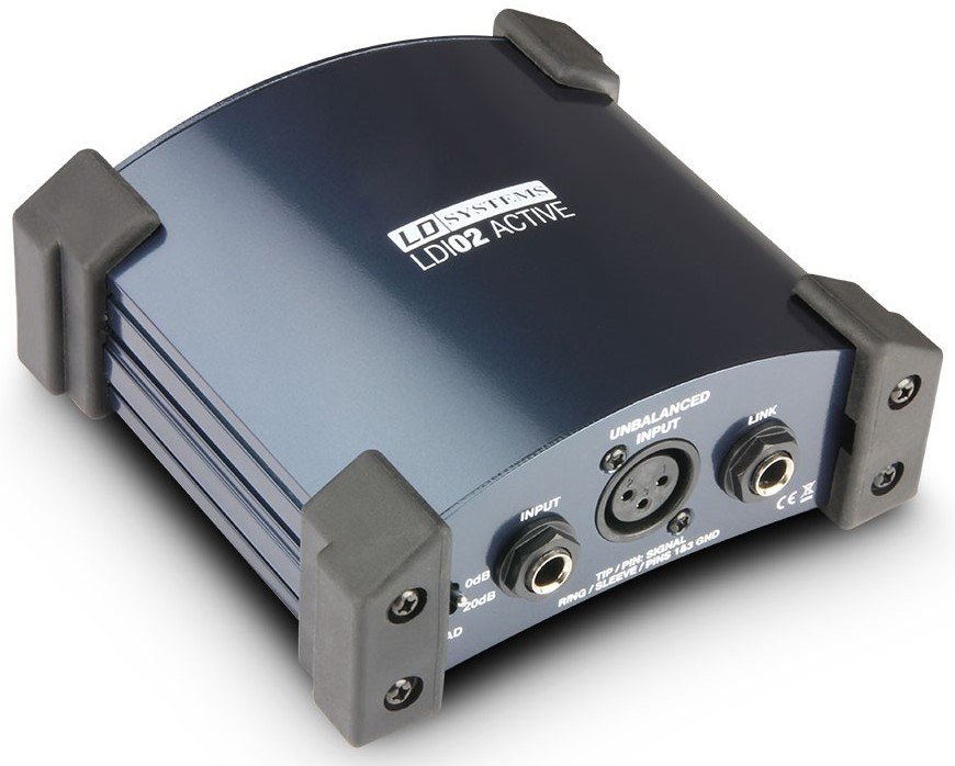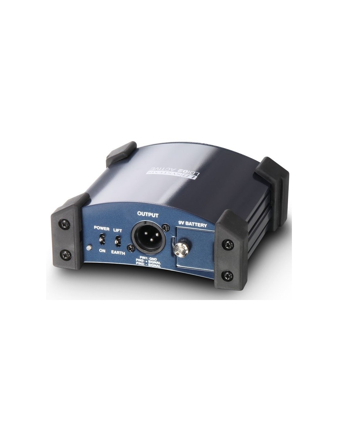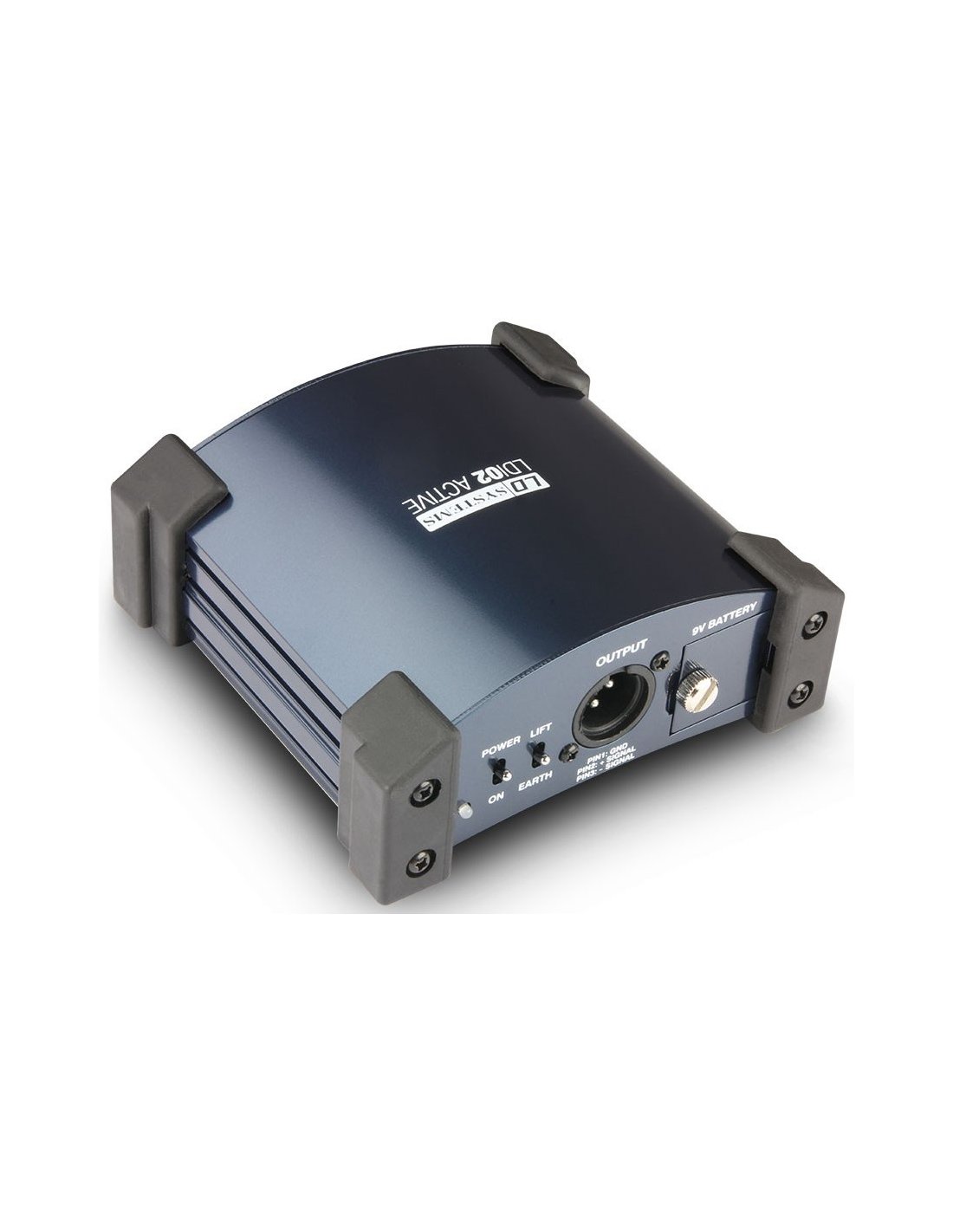 LD SYSTEMS LDI02. Boîte DI active avec 2 entrées via jack 6,3 mm TRS et XLR déséquilibré, interrupteur pour Pad 0/20 Db, 1 sortie via XLR, interrupteur pour Ground Lift. Fonctionnement avec batterie 9V ou Phantom +48V