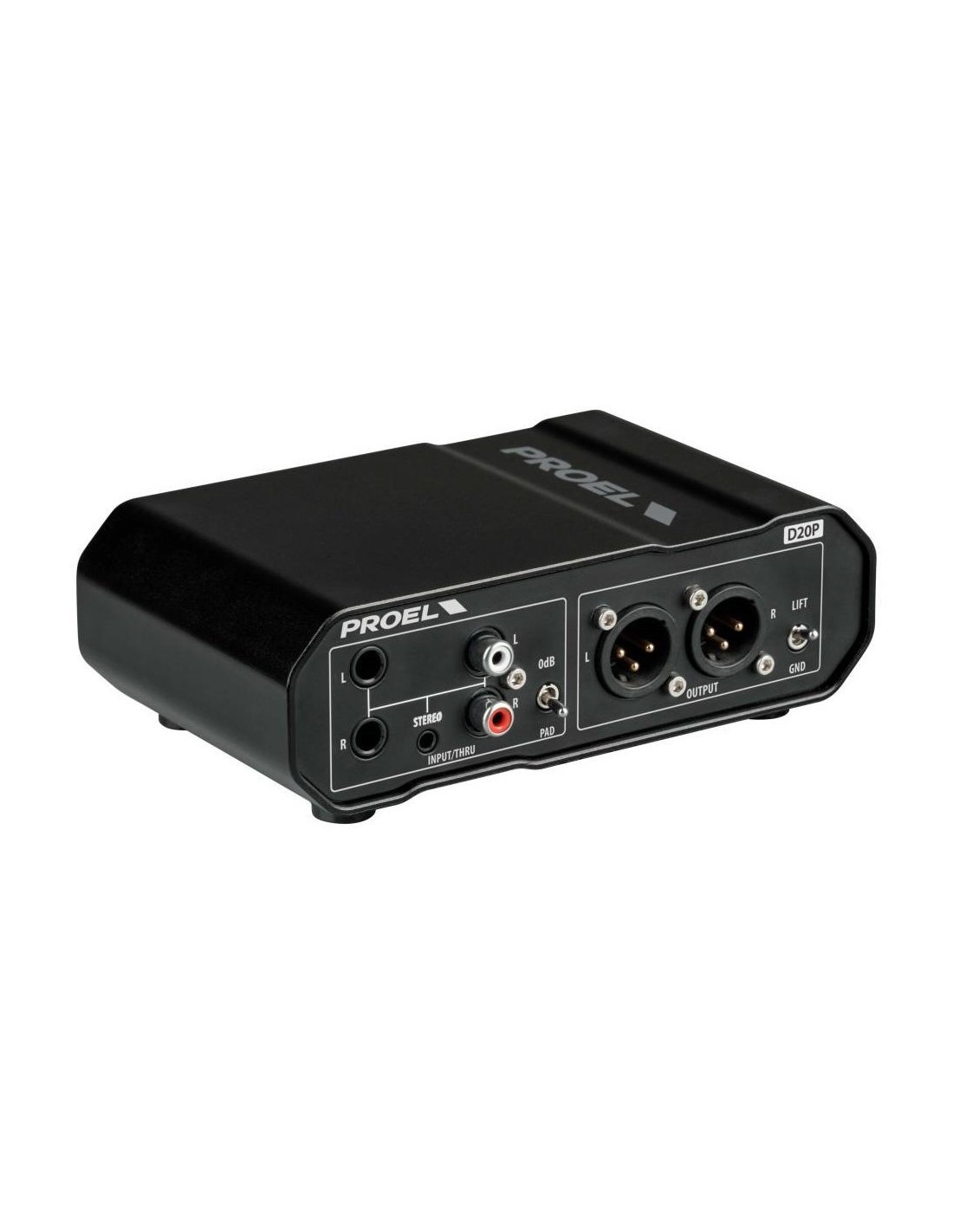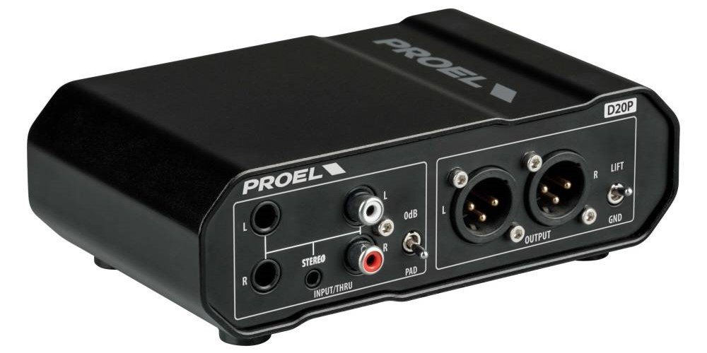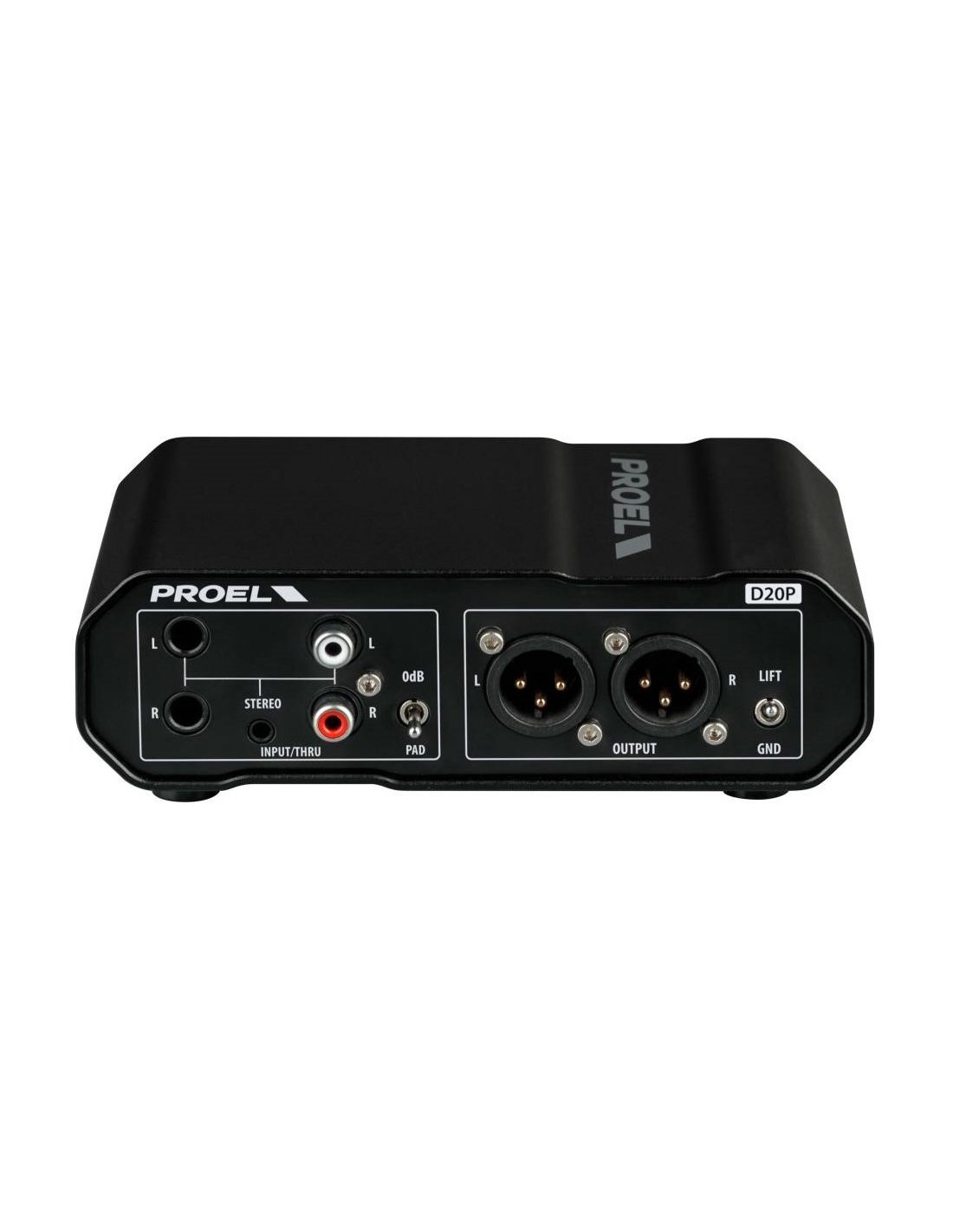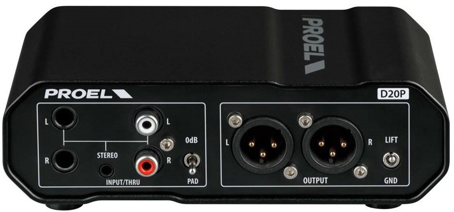 PROEL D20P DI PASSIVA 2CH est une boîte D.I. passive stéréo à 2 canaux avec transformateur, entrée via 2 connecteurs Jack 6,3 mm L/R non équilibrés, 2 connecteurs RCA L/R non équilibrés et connecteur mini jack 3,5 mm TRS avec Pad d'atténuation 0 dB, -20 dB, 2 sorties XLR-M L/R équilibrées avec transformateur blindé et Ground Lift