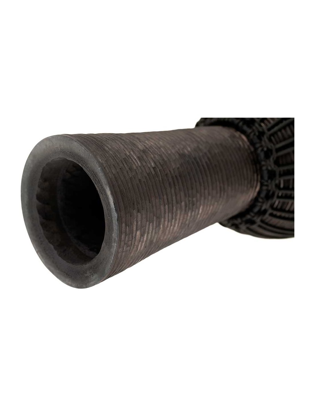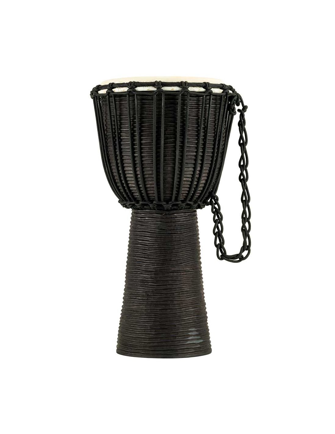 'Djembe en bois de 10''''. Ces Djembes sont fabriqués à partir d'un solide morceau de bois de mahogany cultivé en plantation, et sont sculptés à la main avec un motif de ondulation horizontale qui suggère une rivière qui coule. Cela rend également le djembe facile à maintenir entre les genoux. La tête du tambour en cuir de chèvre sélectionné à la main est accordée avec le système traditionnel de cordes du Mali.