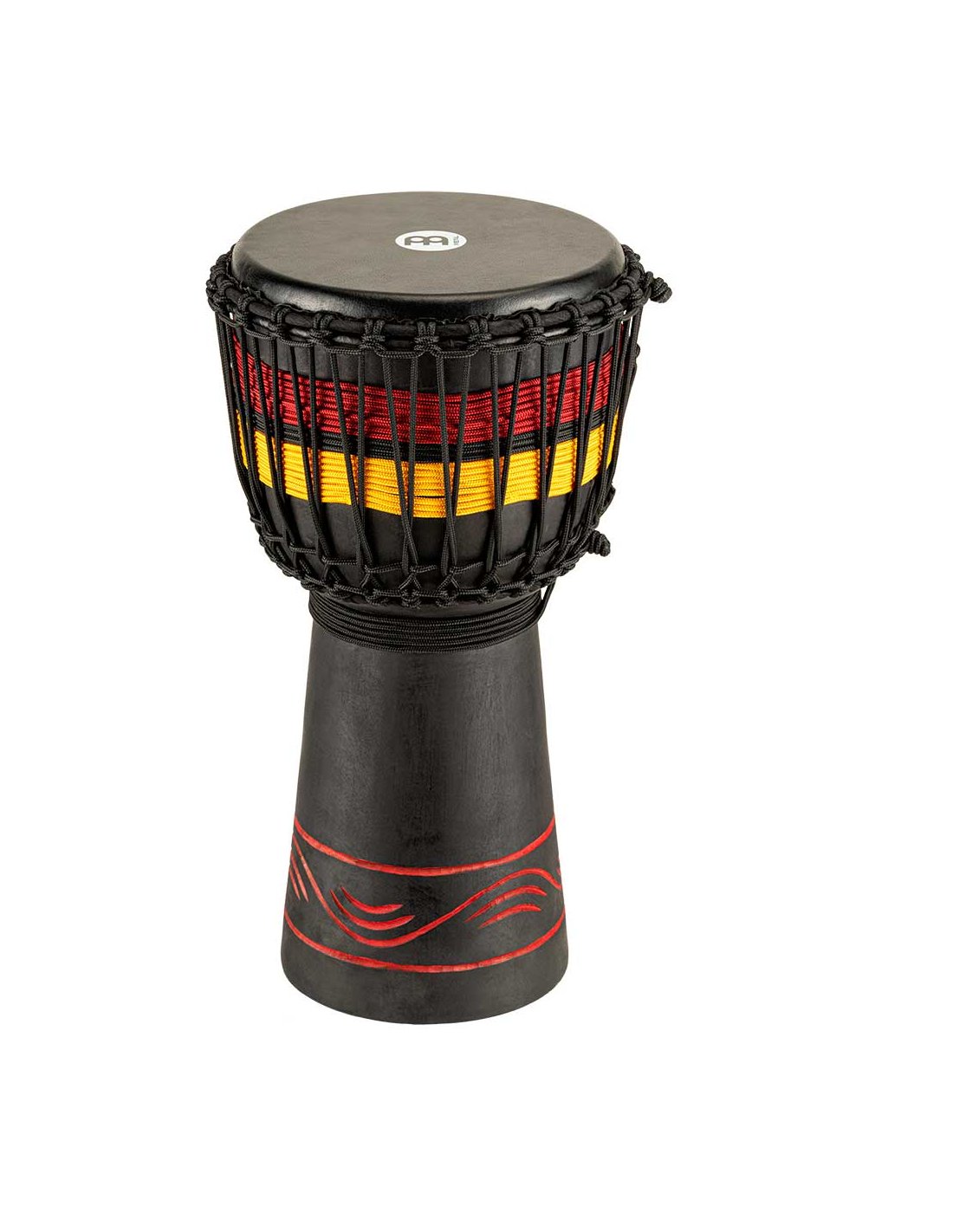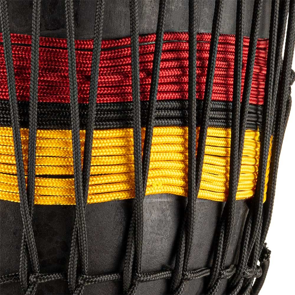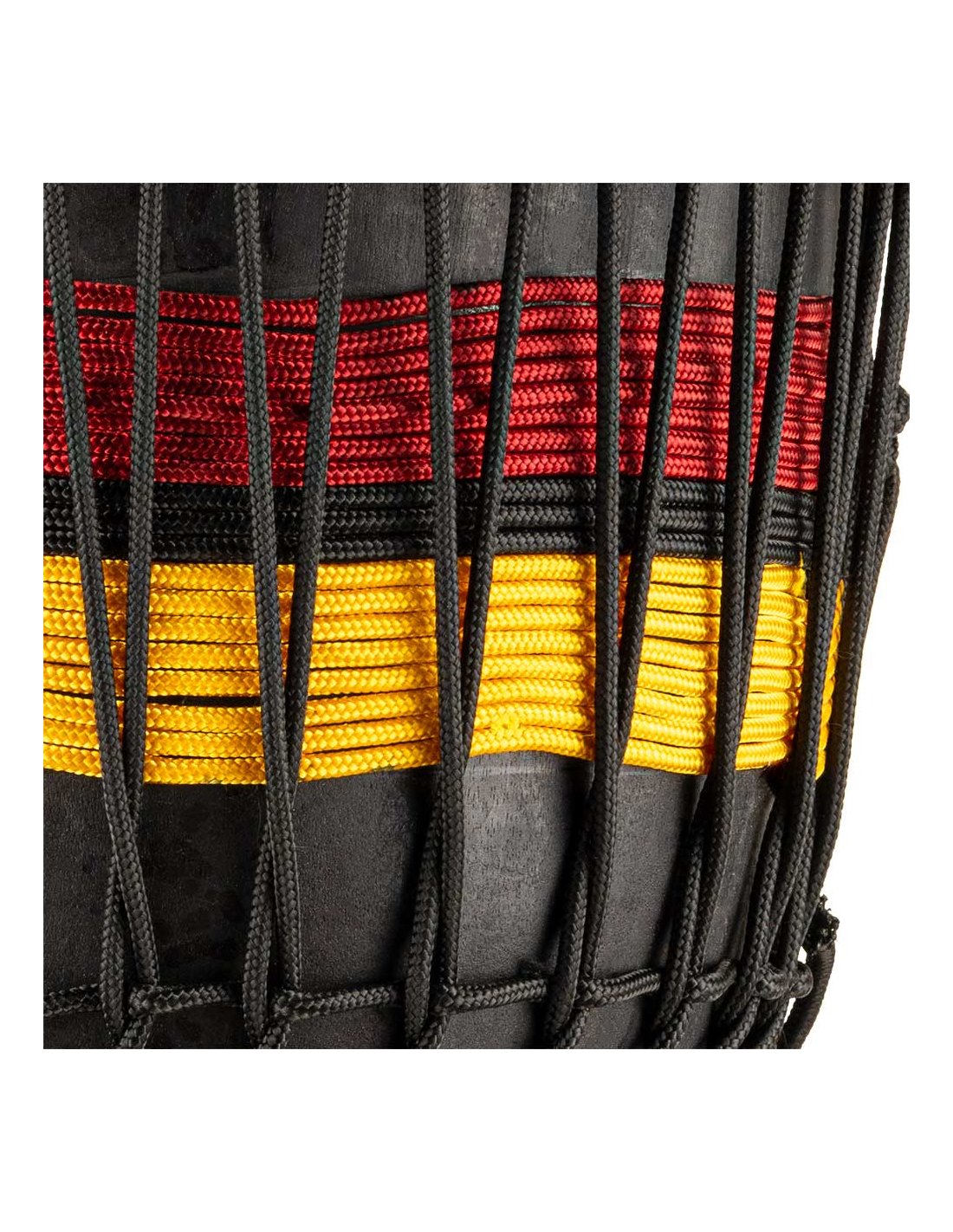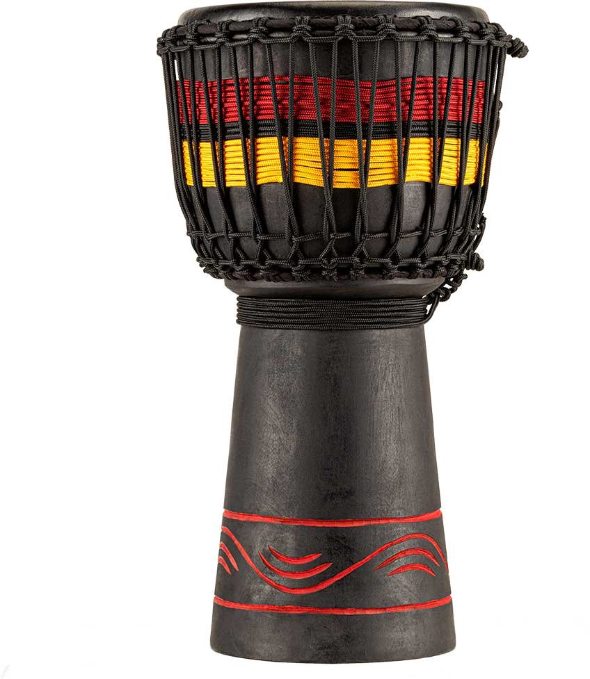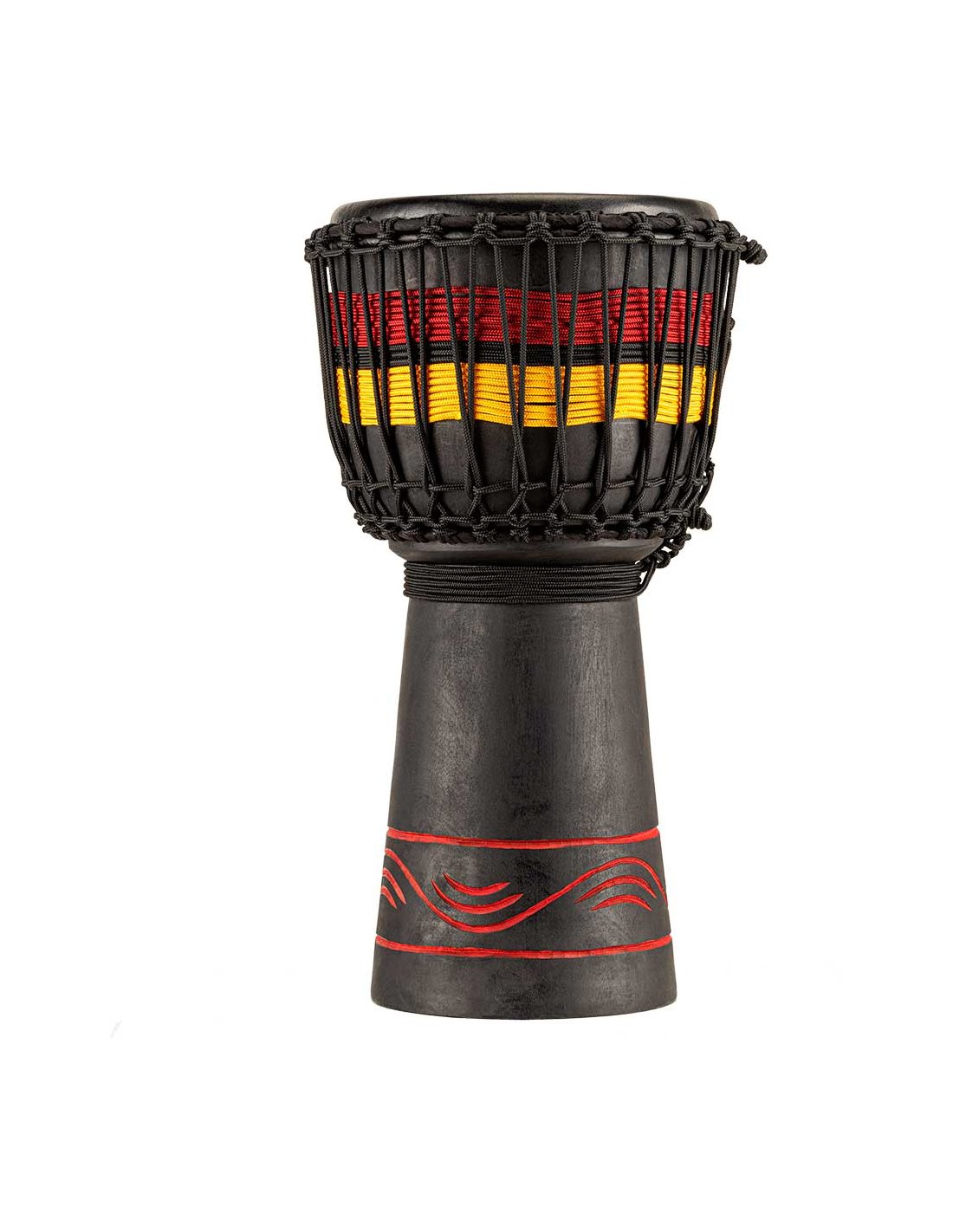 'Djembe en bois 10'' ADJ7-M. Sculpté à partir d'un solide morceau de mahogany cultivé en plantation. Corps noir en mahogany (swietenia macrophylla) décoré à la main avec des ornements noirs sculptés. Accordé avec une corde en nylon de 4 mm. Section centrale enroulée avec des cordes de la série fire rhythm jaunes et rouges.