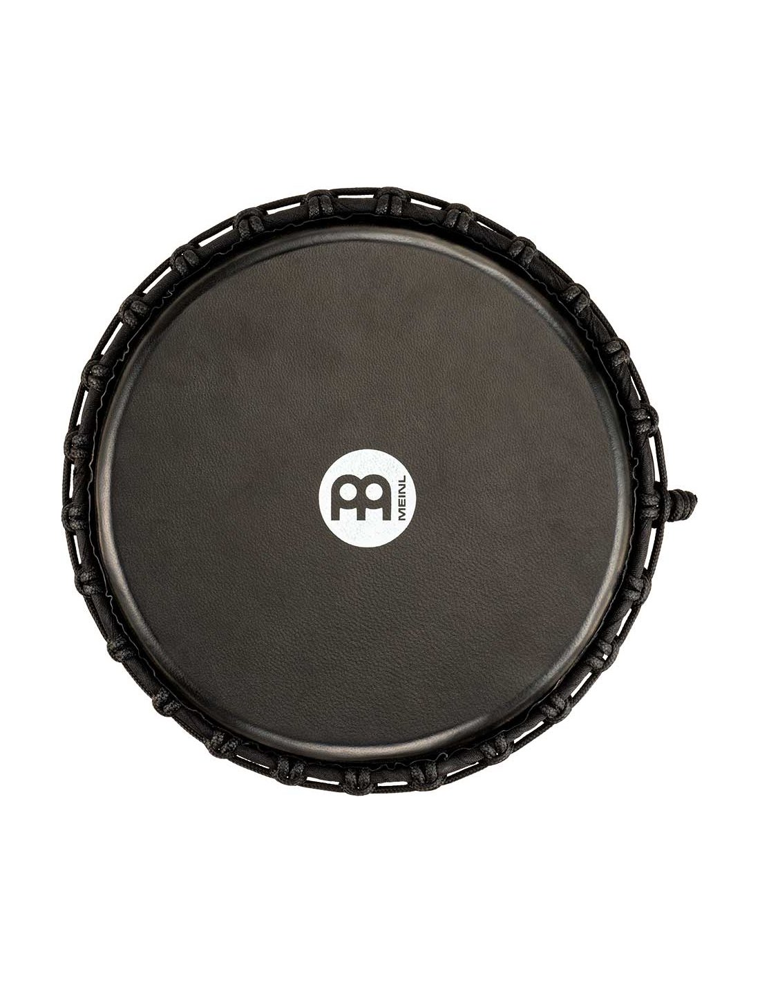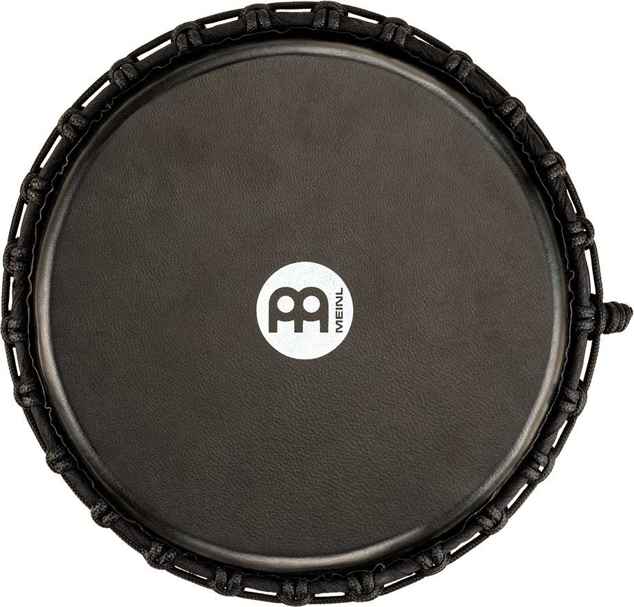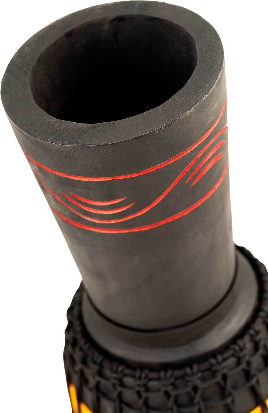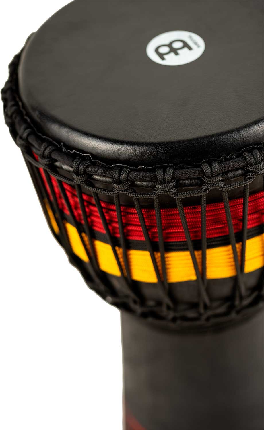 'Djembe en bois 10'' ADJ7-M. Sculpté à partir d'un solide morceau de mahogany cultivé en plantation. Corps noir en mahogany (swietenia macrophylla) décoré à la main avec des ornements noirs sculptés. Accordé avec une corde en nylon de 4 mm. Section centrale enroulée avec des cordes de la série fire rhythm jaunes et rouges.