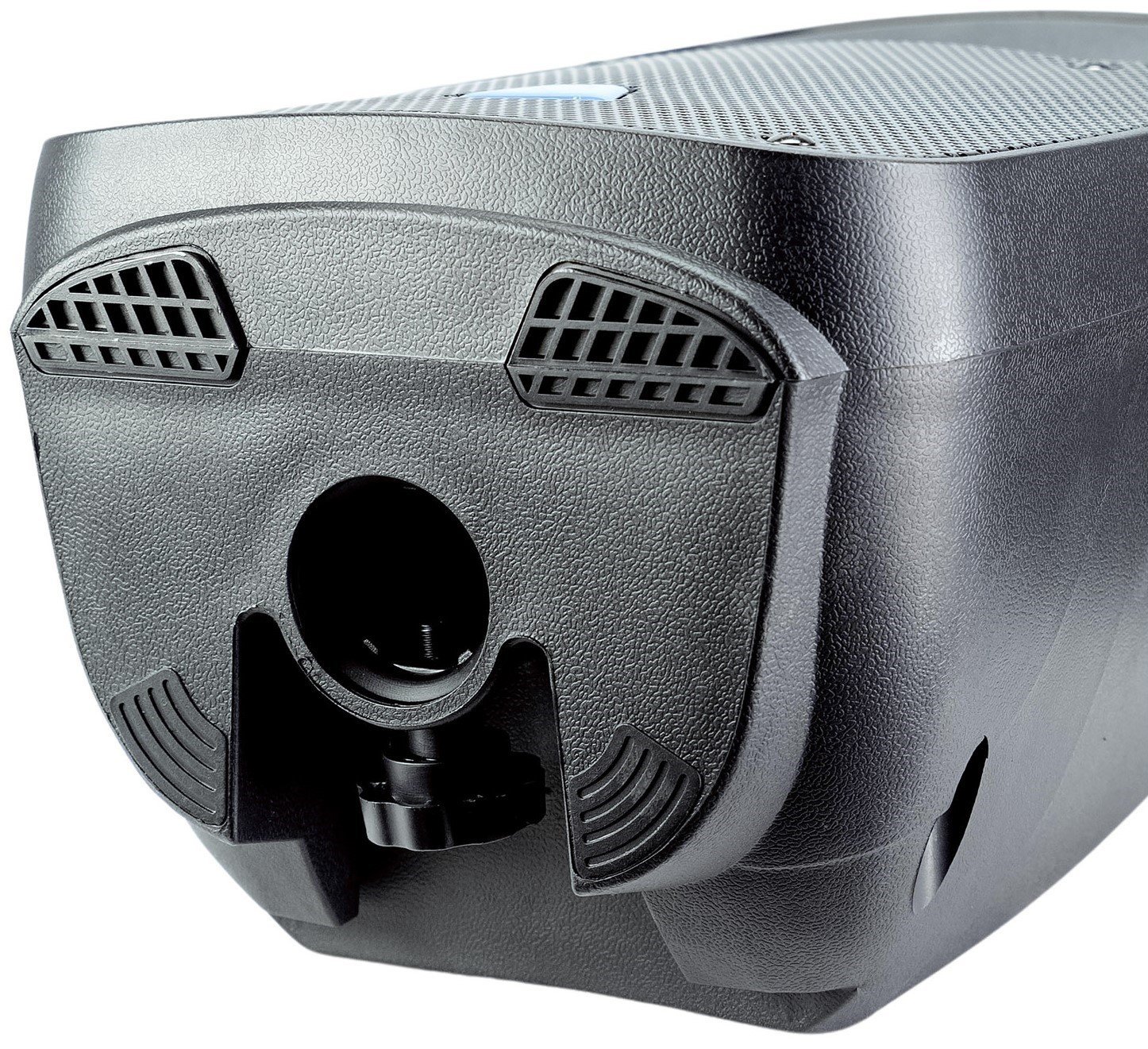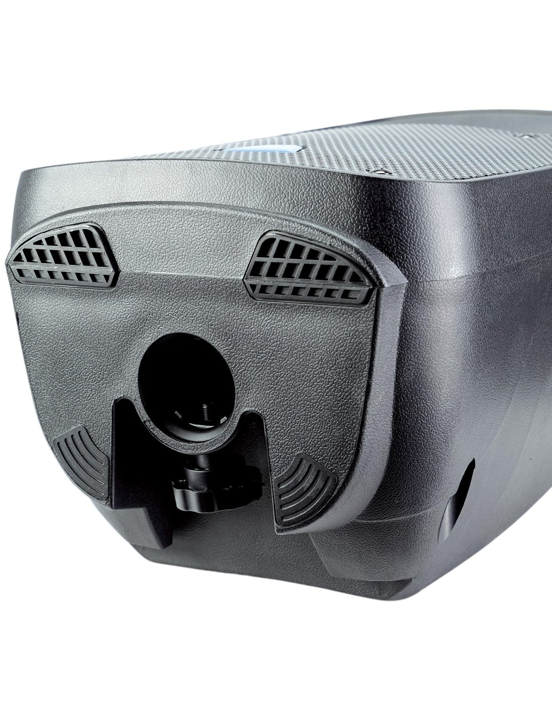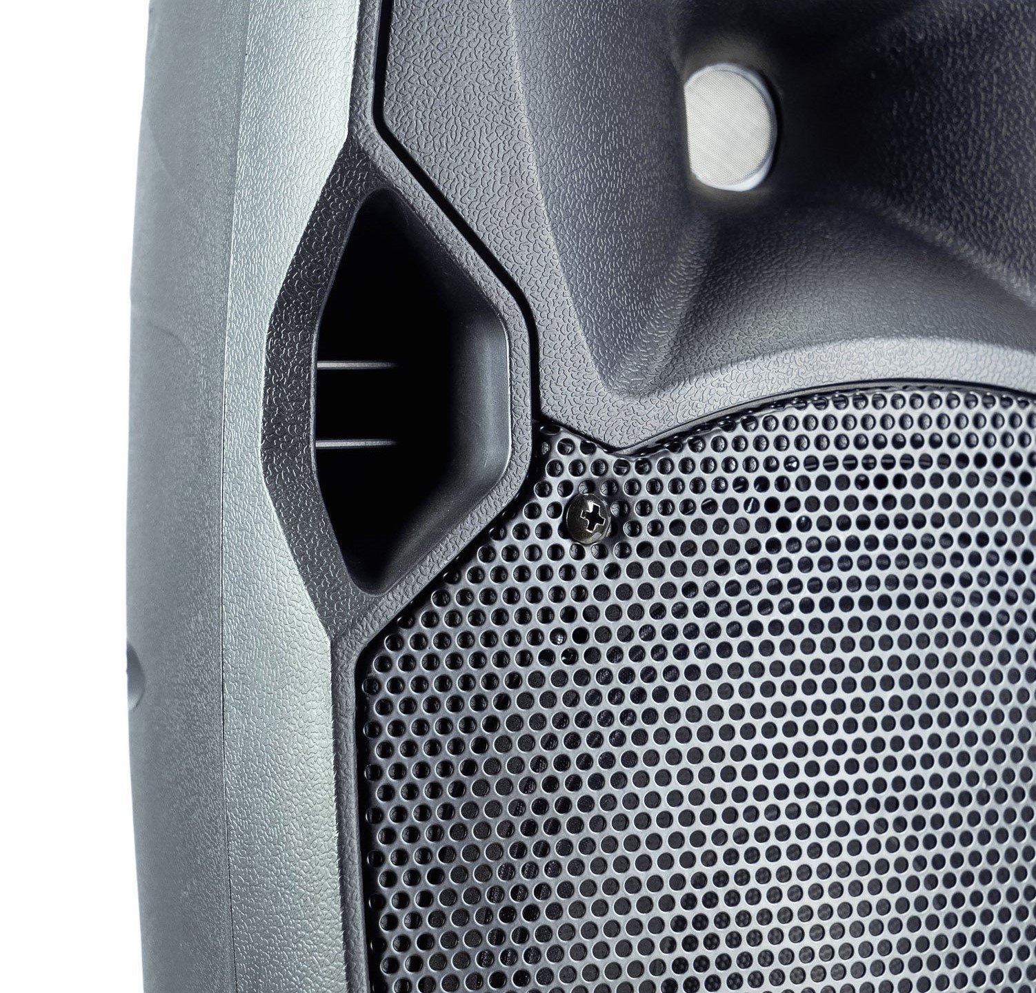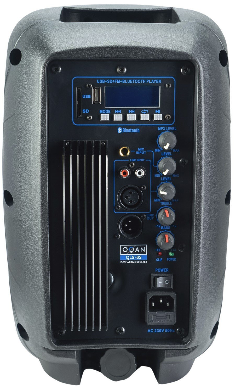 Cassa active 8 pouces. 200 Watts. 150 Watts Basses Classe D. 50 Watts Aigus. 2 bandes d'égalisation. Mic In. Aux in. Contrôle de volume pour chaque In. Bluetooth, SD, lecteur MP3 USB. Radio FM. Télécommande infrarouge.