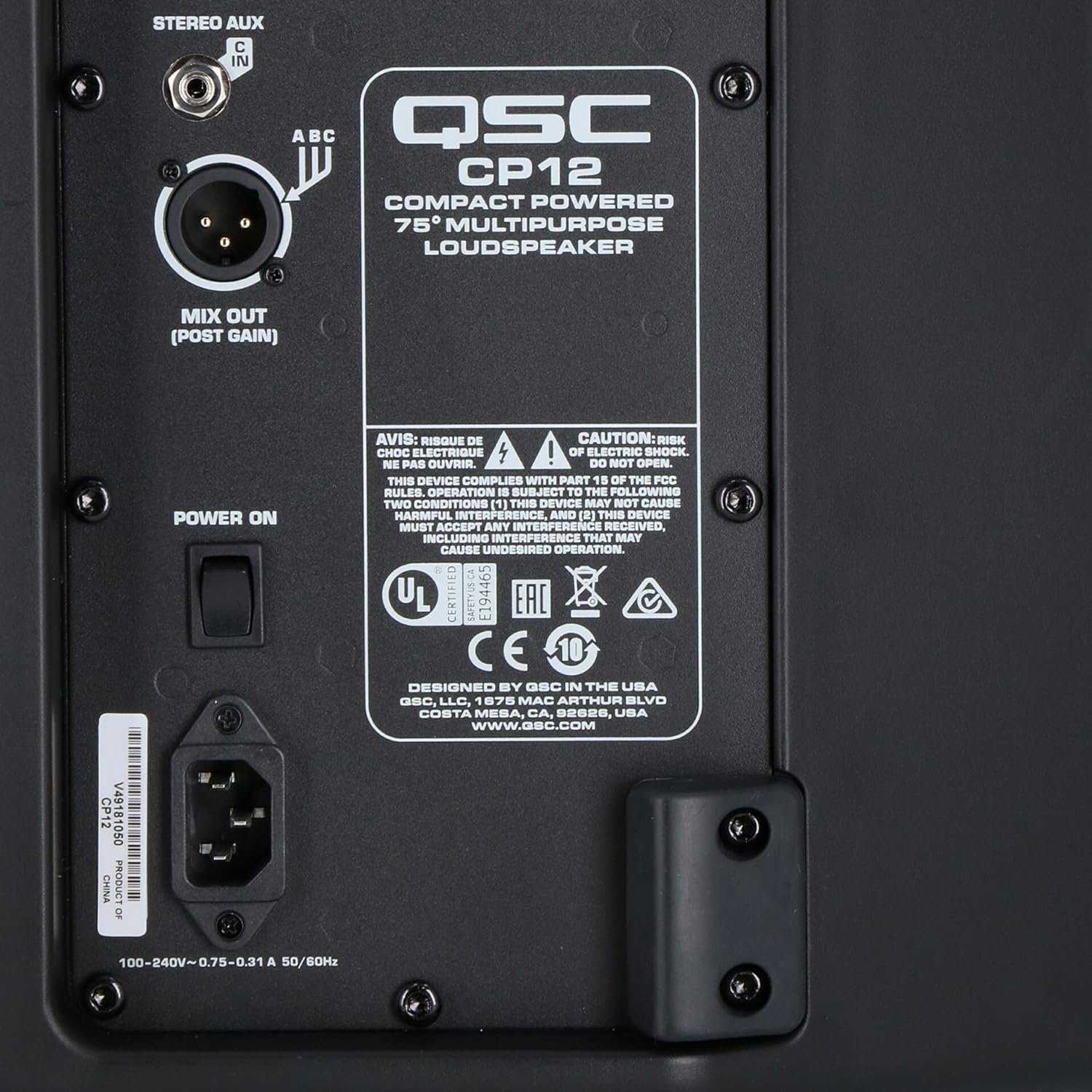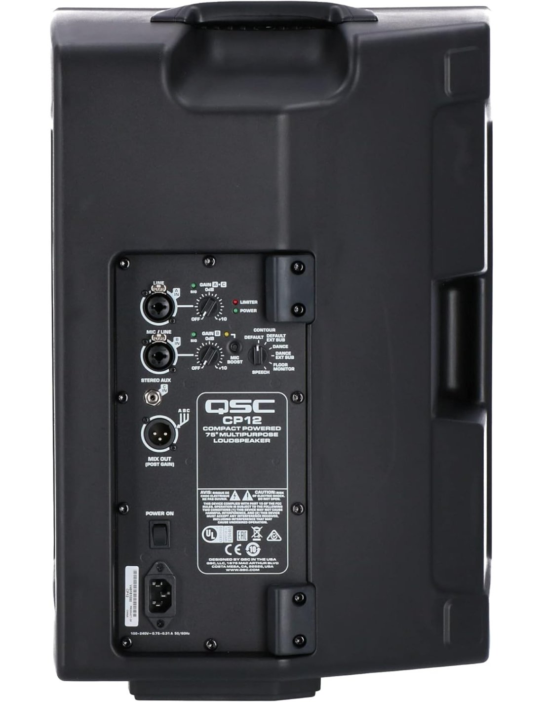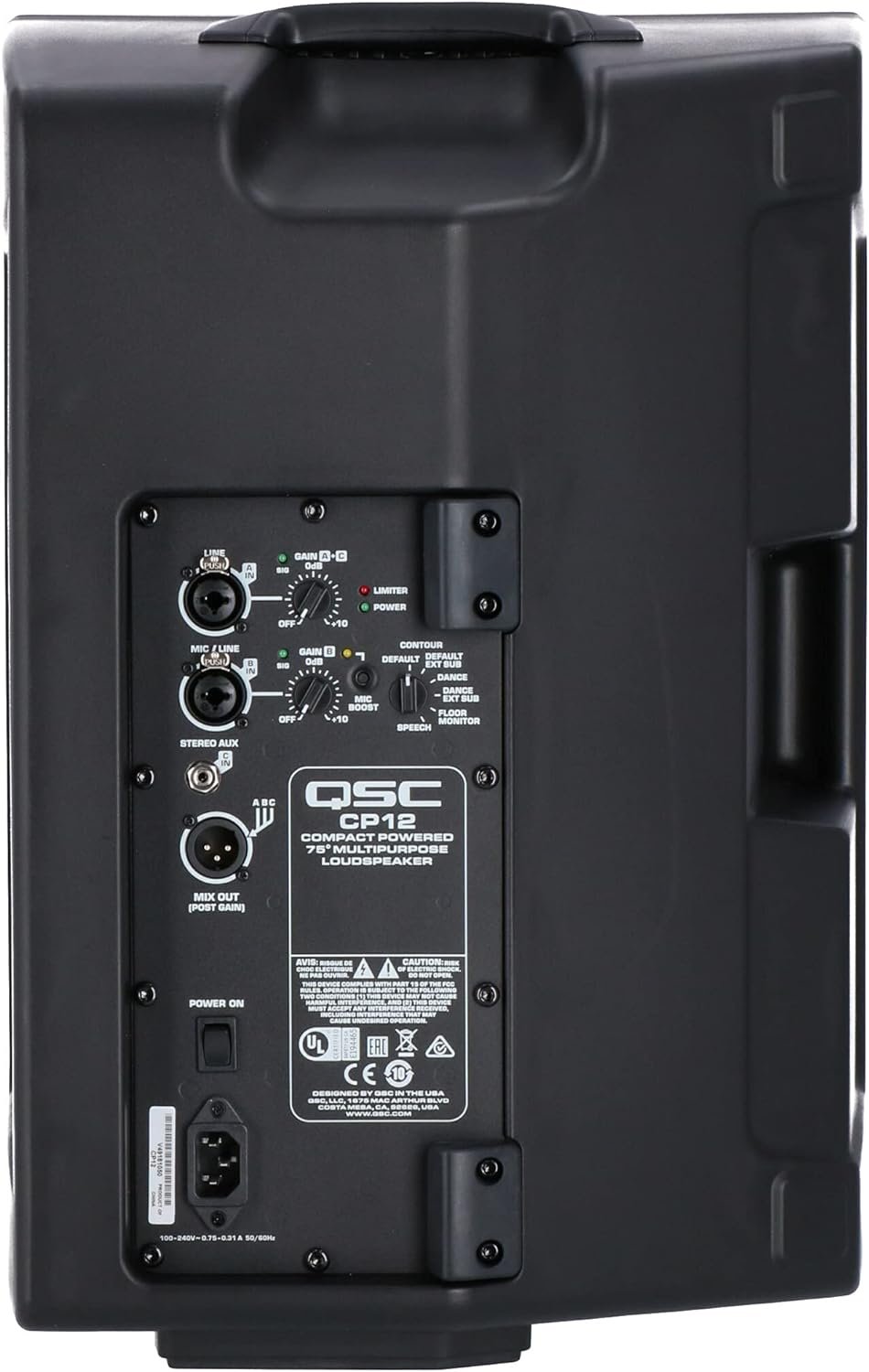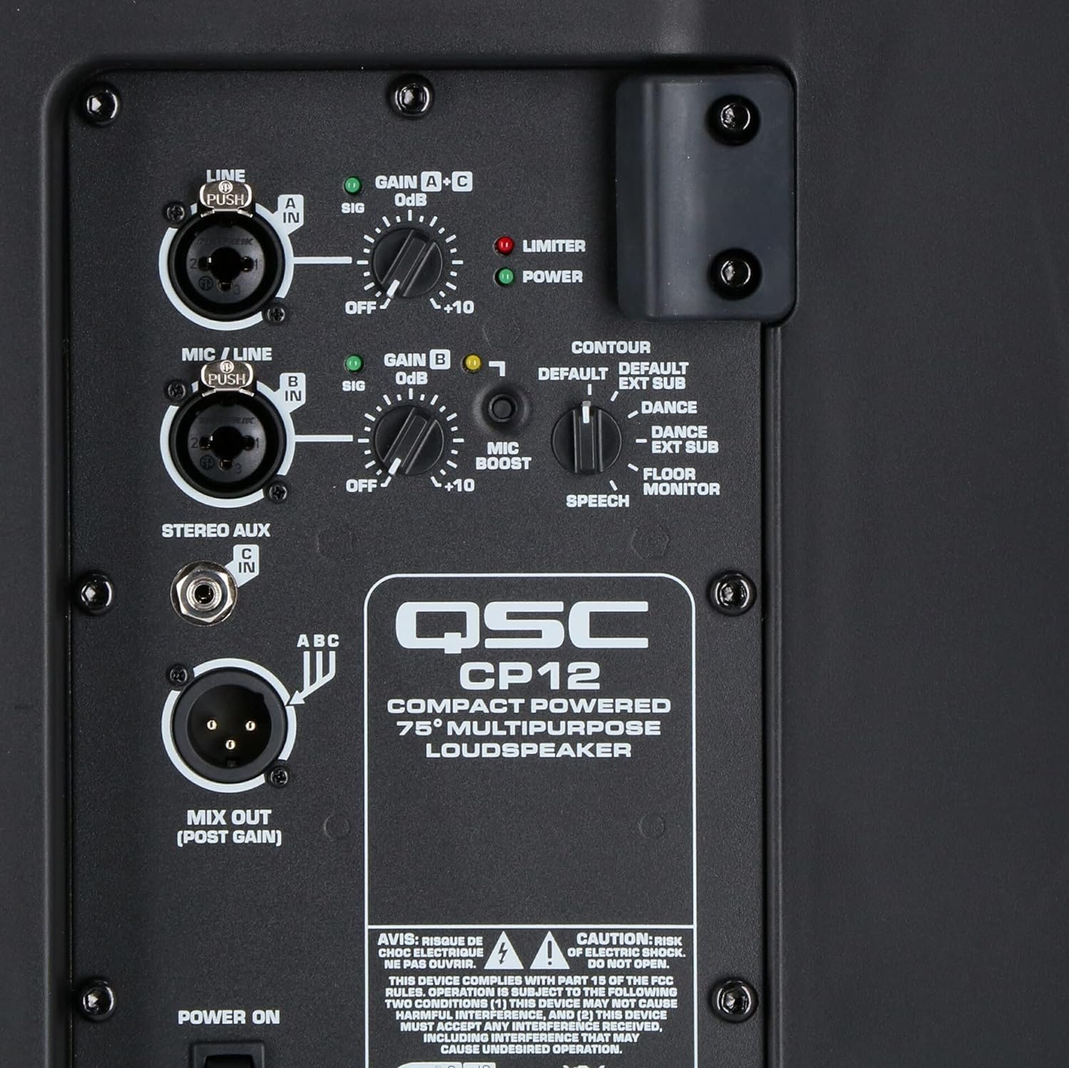 QSC CP12. Caisse active à 2 voies avec haut-parleur de 12" à large excursion, tweeter de 1,4" à compression, 1000W de puissance de crête en classe D, mixeur à 3 canaux intégré avec DSP EQ contrôlable via un encodeur de sélection de 6 préréglages Contour optimisés pour diverses situations d'utilisation, entrée stéréo sur le Ch C via Minijack 3,5mm TRS avec contrôle du volume, Ch B Mic/Line via entrée combo XLR/TRS avec contrôle du Gain et Boost sélectionnable pour l'entrée Mic, Ch A Line avec entrée combo XLR/TRS et contrôle du gain, limiteur intégré avec led d'état.