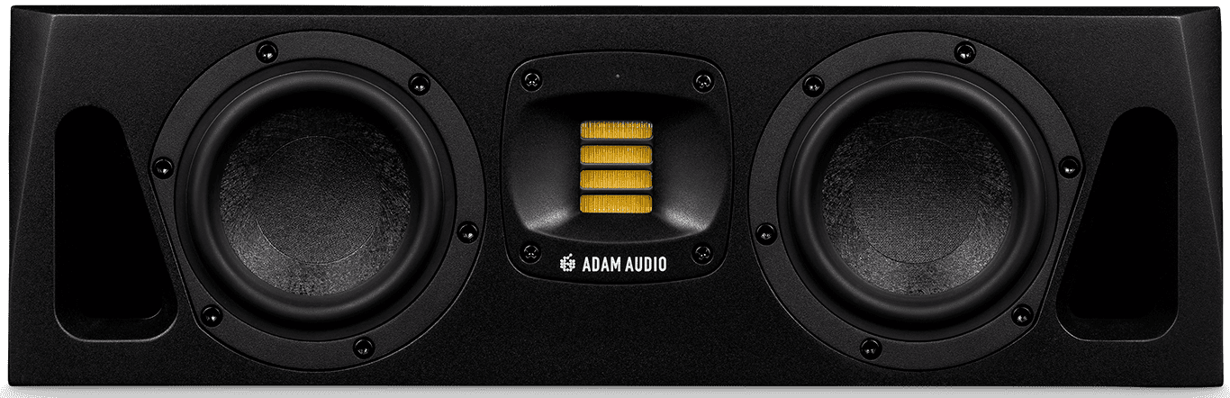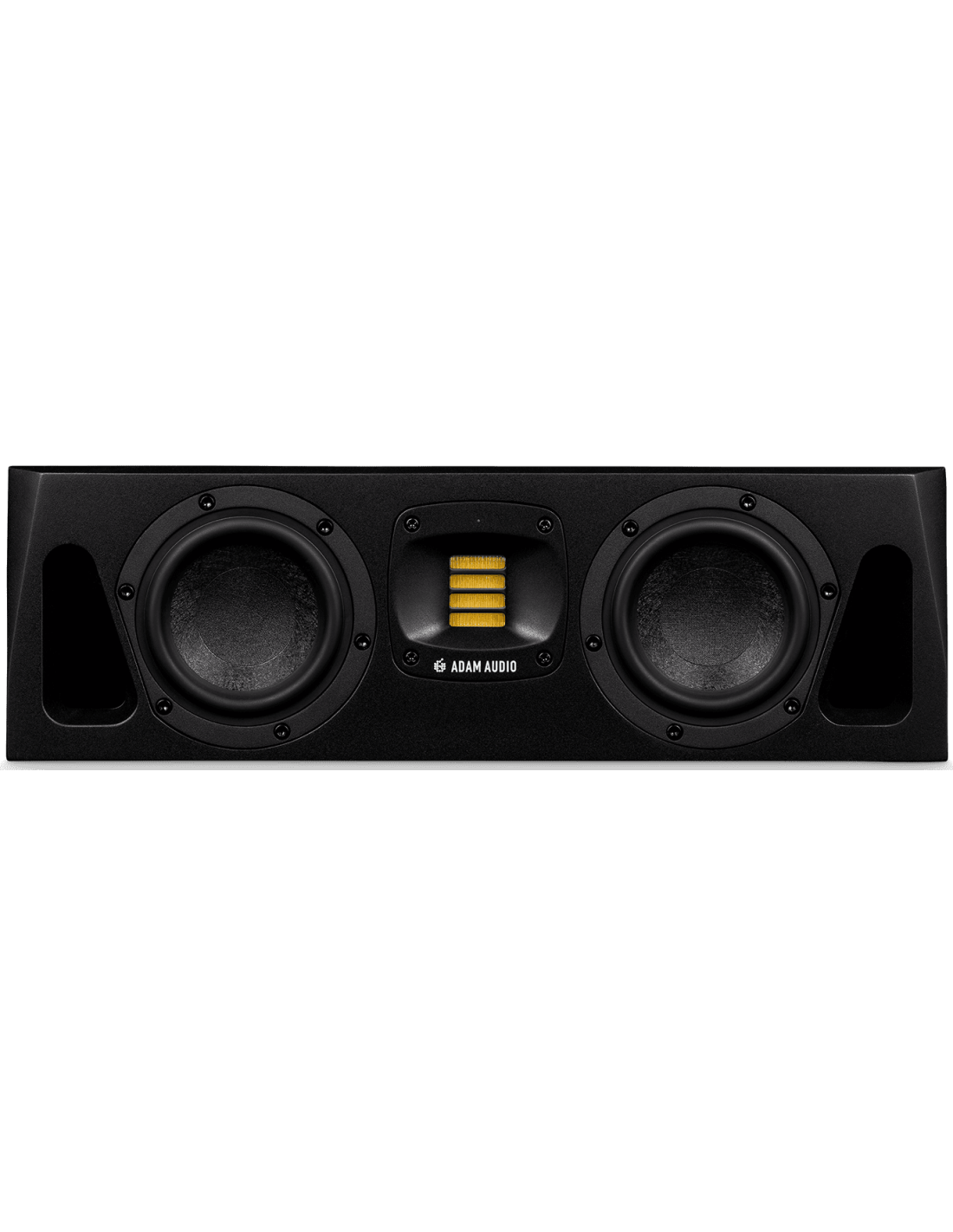 ADAM AUDIO A44H. Moniteur de studio 2x4" Near/Midfield. Les caractéristiques techniques incluent 2 woofers de 4" à excursion longue, tweeter X-ART, possibilité de modifier le son via DSP intégrés, puissance nominale de 300W, entrées XLR/RCA. À l'arrière : possibilité de sélection du voicing à 3 voies (Pure/Unr/Ext), EQ à 4 bandes (Bass/Desk/Presence/Treble) avec technologie d'adaptation à l'environnement Sonarworks, contrôle du niveau de sortie.
