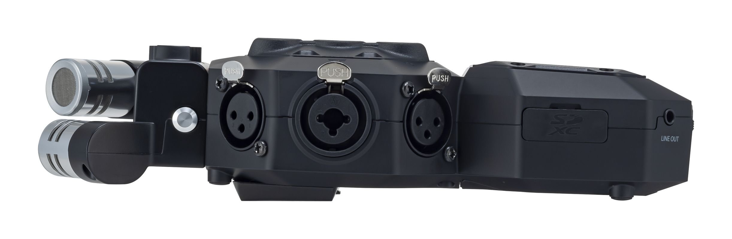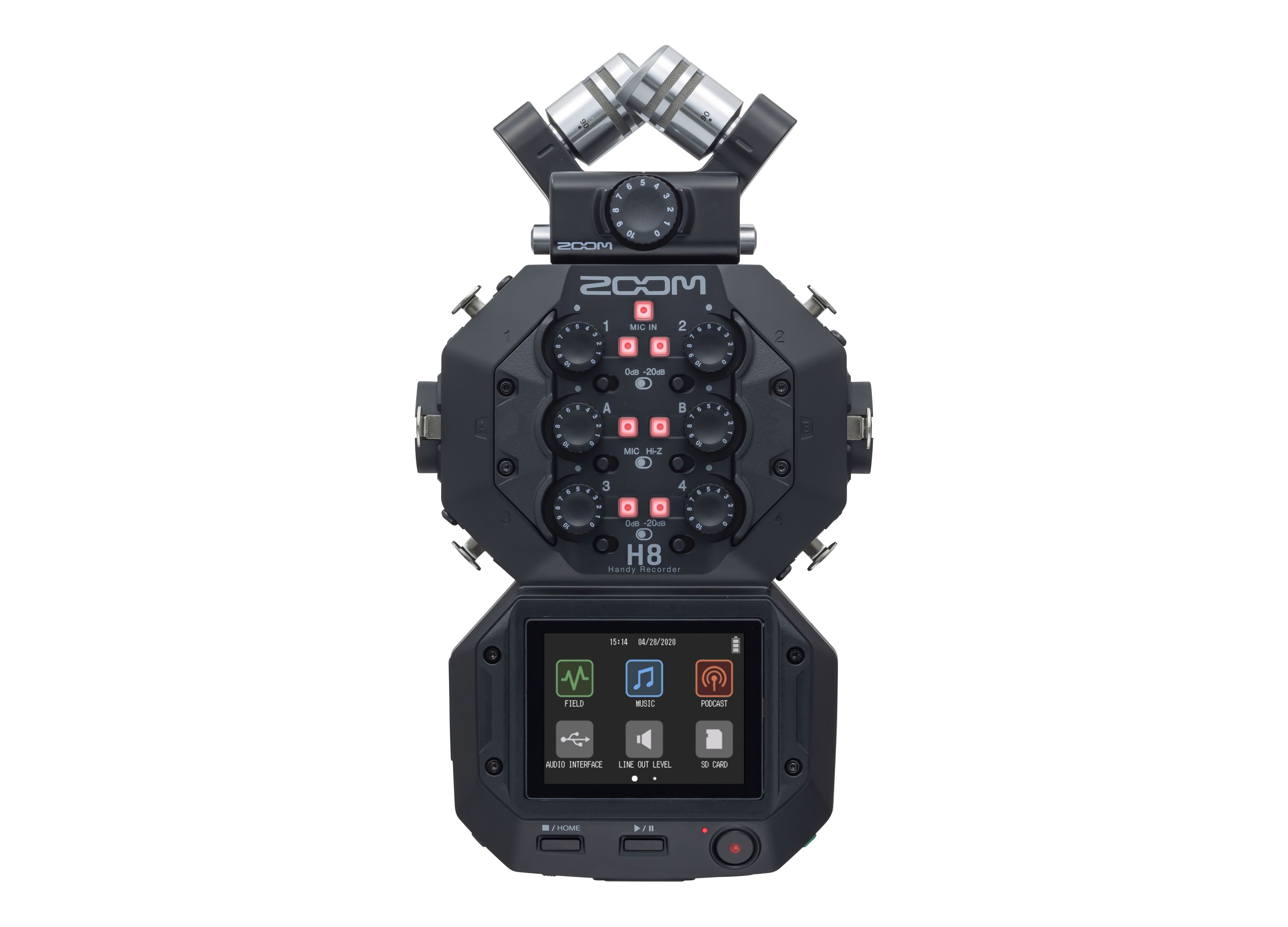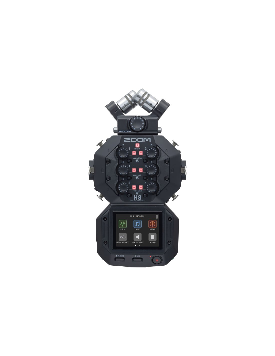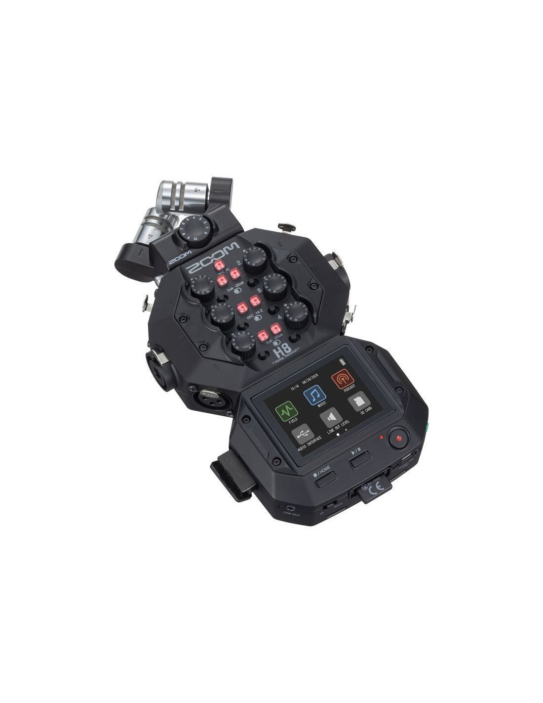 ZOOM H8. Enregistreur numérique portable avec reproduction simultanée de 12 pistes à 96KHz/24bit et 44.1KHz/16bit ou mp3. Les caractéristiques techniques incluent 2 capsules microphoniques à condensateur en configuration X/Y interchangeables avec un angle de prise de vue de 90° ou 120° et, un entrée modulaire Capsule System 2.0 pour le raccordement de microphones supplémentaires, préamplificateurs microphoniques de nouvelle génération, 4 entrées XLR microphoniques et 2 entrées combo XLR/TRS avec alimentation fantôme (+12v,+48v,+24v) et système de verrouillage Neutrik, entrées Hi-Z, sortie ligne/casque via miniJack stéréo 3.5mm, enregistre directement sur cartes SD/SDHC/SDXC jusqu'à 512 Go, interface audio USB 6in/4out intégrée, fonction d'enregistrement de sauvegarde, processeur multi-effets intégré, écran tactile de navigation. Alimenté par 4 piles AA ou adaptateur secteur. Inclut Capsule XYH-6 X/Y, piles AA (x4), guide rapide.