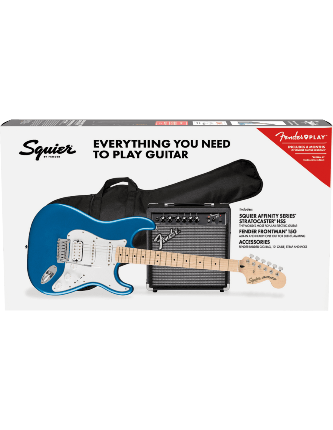 Guitare Électrique Squier Affinity Strat Pack HSS MN LPB couleur LAKE PLACID BLUE avec Amplificateur Frontman 15G, sac, sangle et médiators. La Squier Affinity Strat HSS MN LPB est une guitare électrique à 6 cordes. Les caractéristiques techniques incluent un corps en peuplier, un manche et une touche en érable avec 21 frettes Medium Jumbo, un rayon de 9,5", un pickup humbucker au pont et 2 single coil au centre et au manche, et un pont Tremolo Synchronisé Vintage-Style à 6 selles.