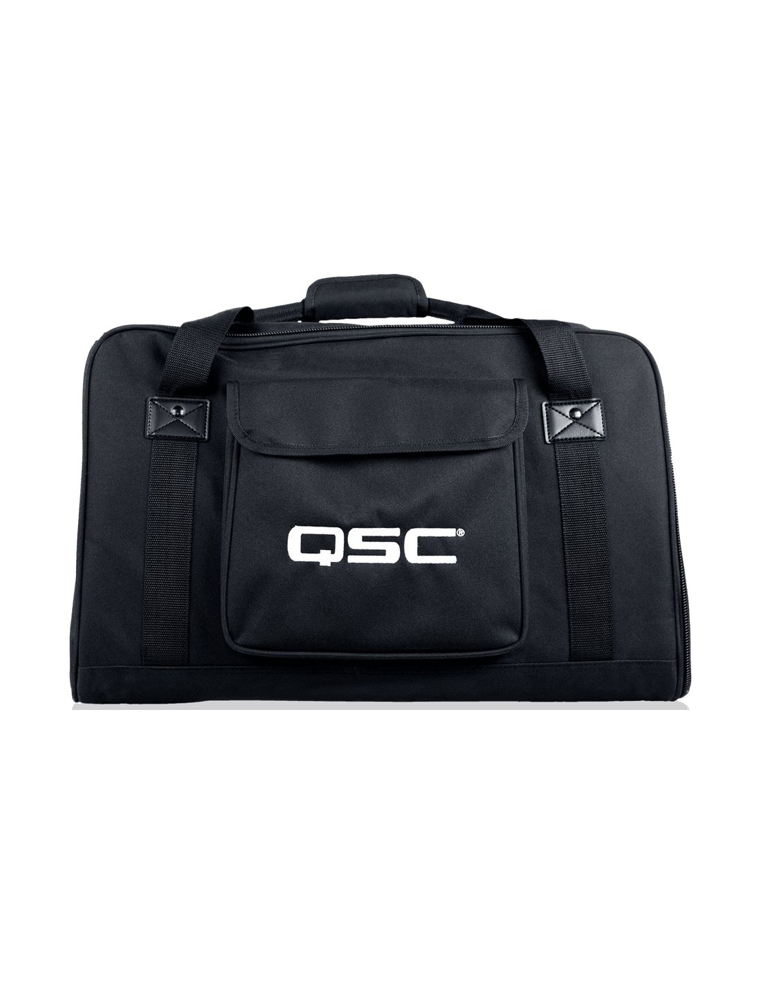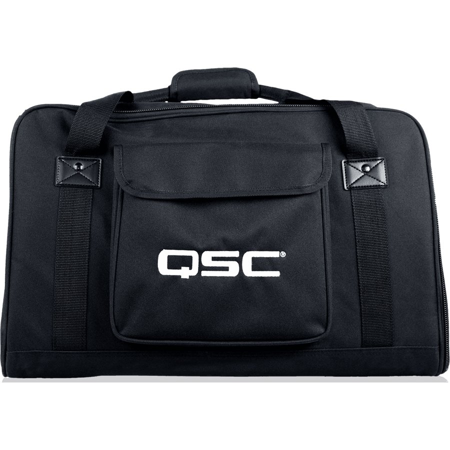 QSC CP8 TOTE BAG. Sac en nylon rembourré pour le transport du haut-parleur QSC CP8, équipé de poches pour accessoires et d'une poignée de transport.