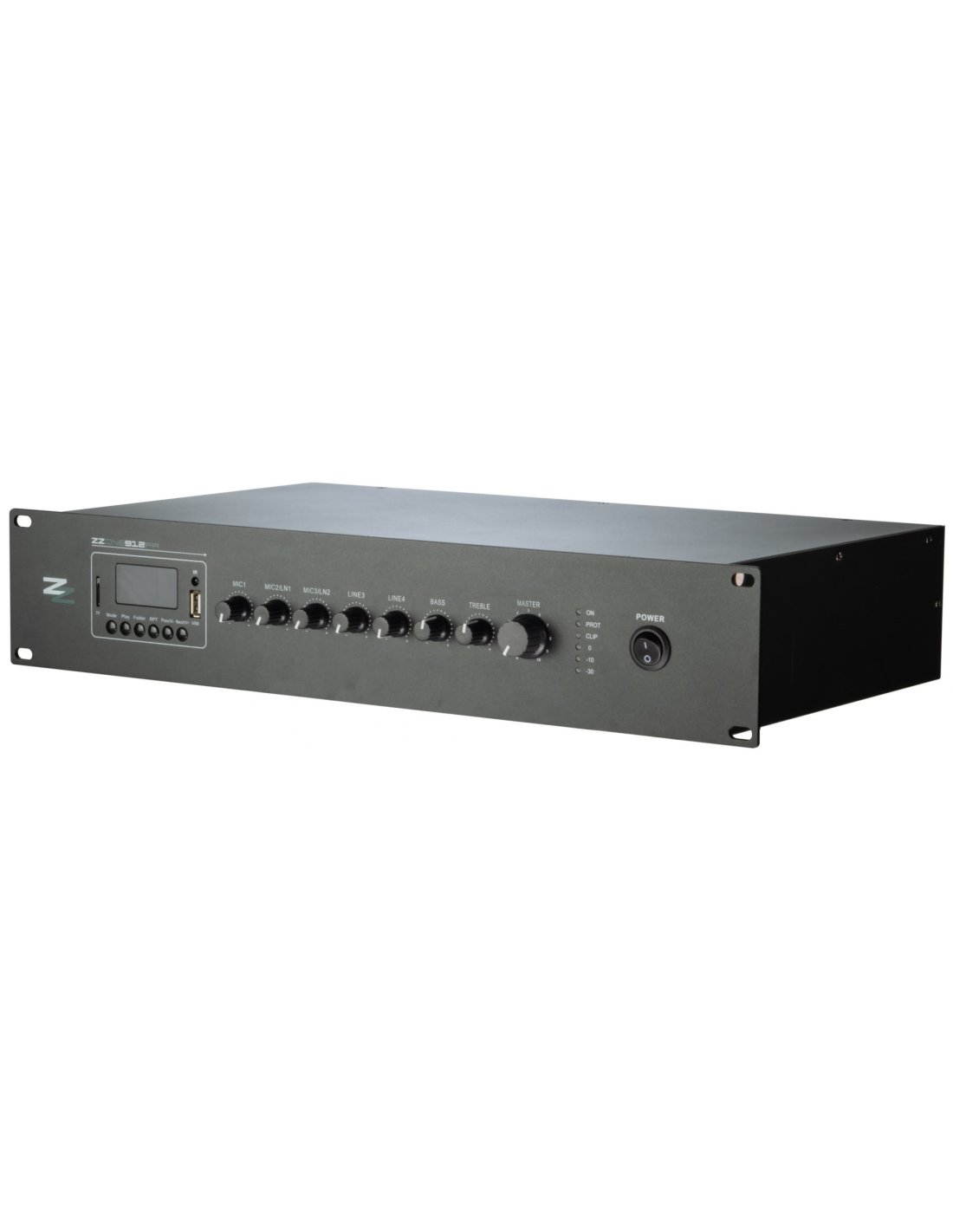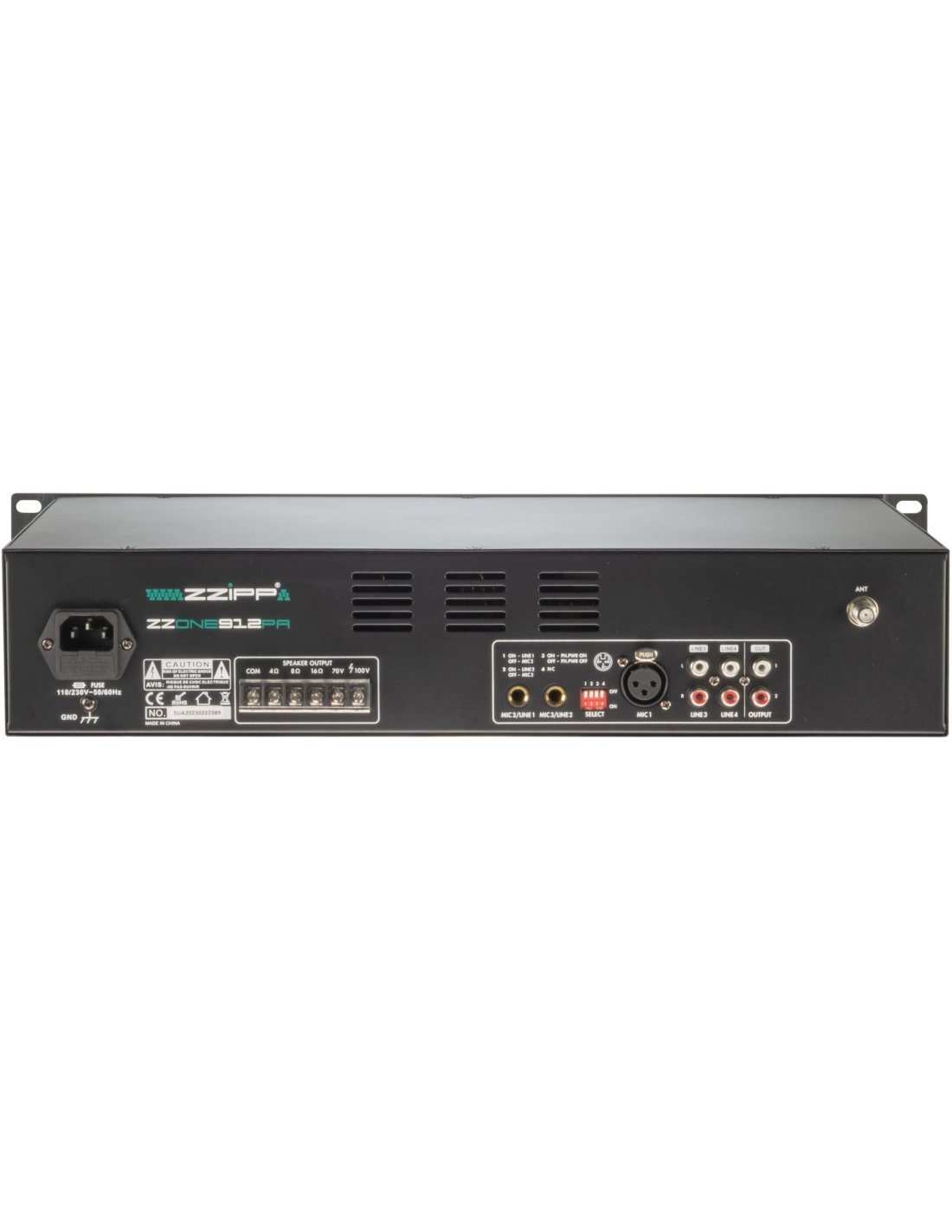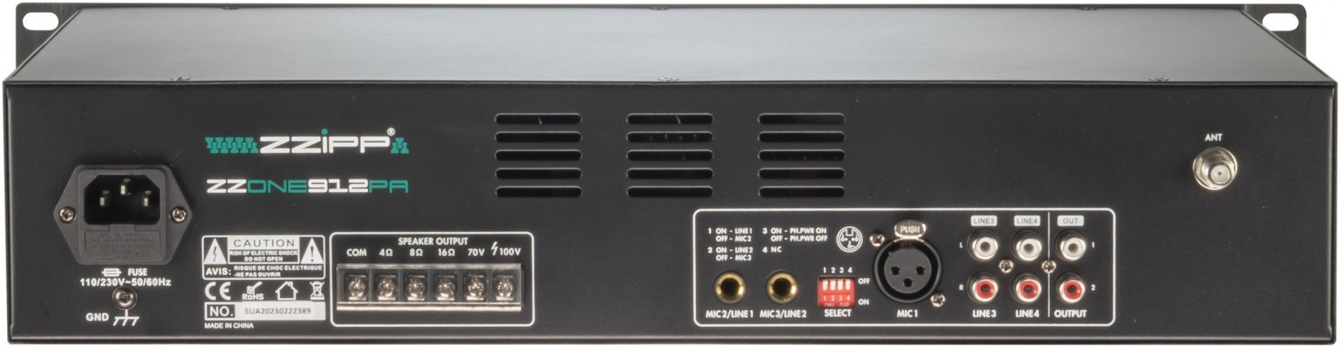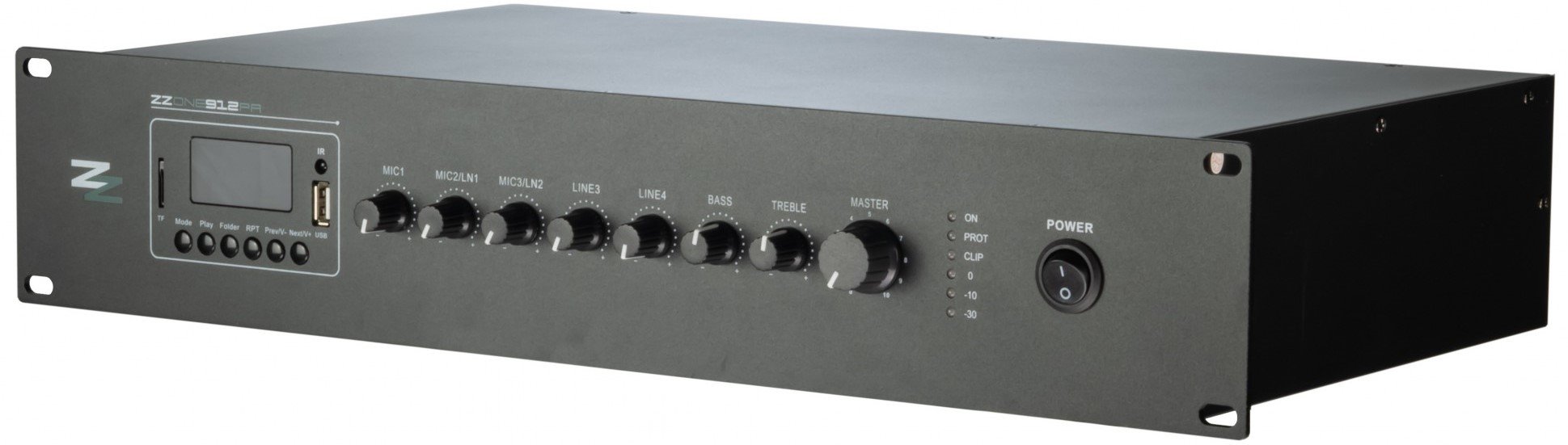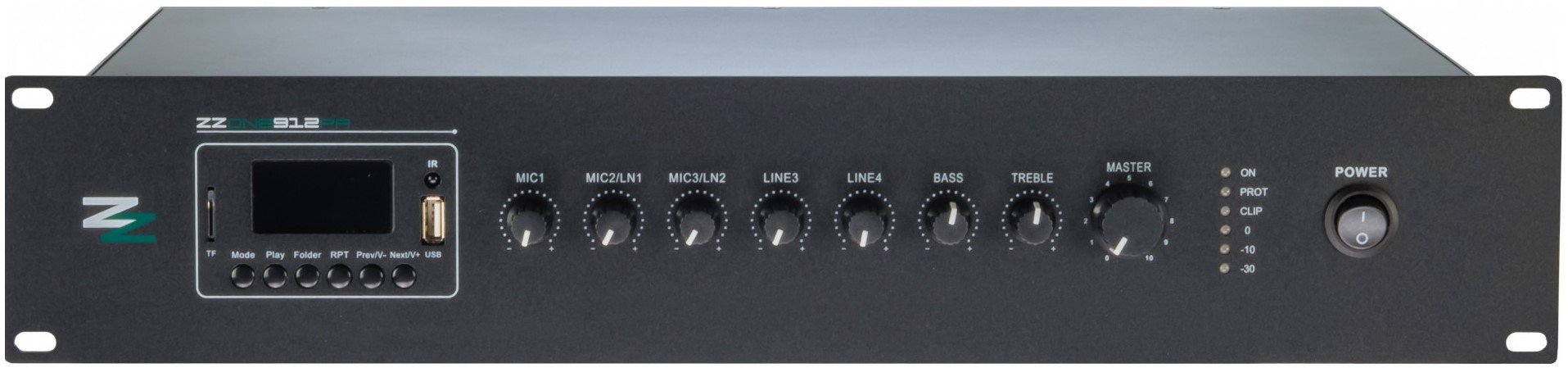 ZZIPP ZZONE912PA AMPLI MIXER 120W est un amplificateur/mélangeur multi-zone avec lecteur multimédia intégré, connectivité Bluetooth, alimentation fantôme, radio FM + DAB et télécommande incluse. Les caractéristiques techniques incluent un fonctionnement à 100V et 4-8 ohms, une puissance de 120 W, des protections intégrées contre les courts-circuits, le clipping, la surcharge et la température, une alimentation fantôme, une télécommande pour le contrôle à distance, 3 entrées Mic (1x XLR, 2x TRS), 2 entrées Ligne sur RCA L/R, 6 zones de sortie (70 V, 100 V, 16, 8, 4 Ohm, Com), sortie Ligne sur RCA L/R