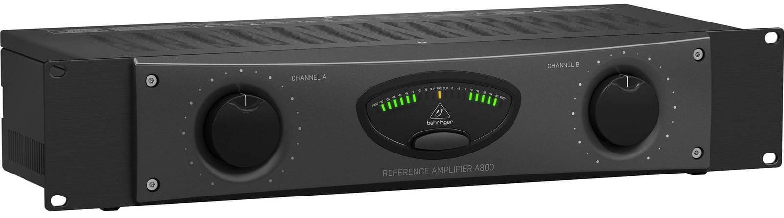 BEHRINGER A800. Amplificateur de puissance de studio à 2 canaux avec 800W de puissance à 8 Ohm en mode mono-bridgé et 2x400W à 4 Ohm. Les caractéristiques techniques incluent un système de refroidissement par convection qui élimine le bruit du ventilateur, des circuits de protection contre la résistance CC et la surchauffe sur chaque canal, un indicateur Led et des indicateurs de clip sur le panneau avant, un design servo contrôlé qui permet de gérer tout système d'enceintes passives.