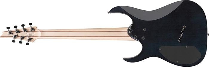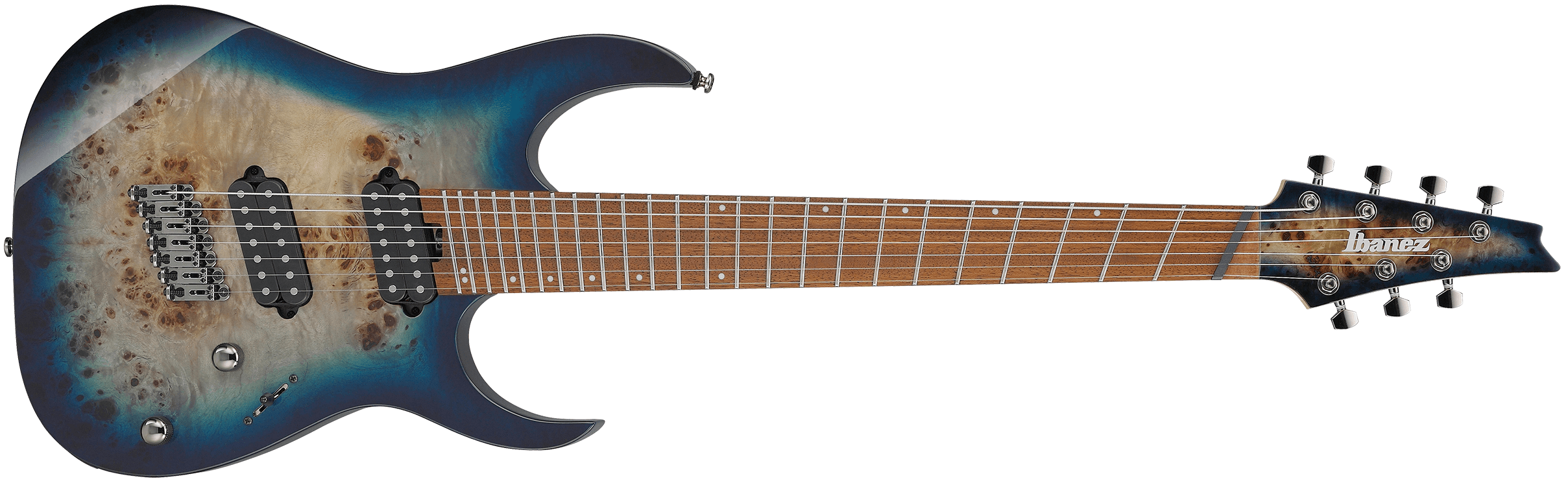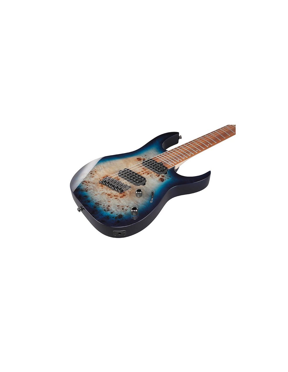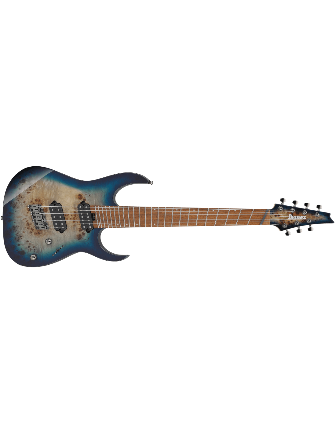 IBANEZ RGMS7PB-CBS est une guitare électrique solid body à 7 cordes de la série Ibanez RG, modèle MS7PB avec un corps en Nyato et un top en racine de peuplier, manche Wizard III-7 pour Multi Scale en 5 pièces érable/noyer, touche Multi-Scale en Jatoba à rayon 15,75" avec 24 frettes Jumbo et incrustations White Step off-set dot inlay, sillet Multi-Scale en PPS noir, quincaillerie Cosmo Black, mécaniques Die-Cast Small Button Cosmo Black et pont Mono-rail bridge. L'électronique à configuration HH, consiste en 2 micros Humbucker Array7 MS Passive/Céramique au pont et au manche, avec contrôle du Volume, Ton et sélecteur de micros à 5 voies