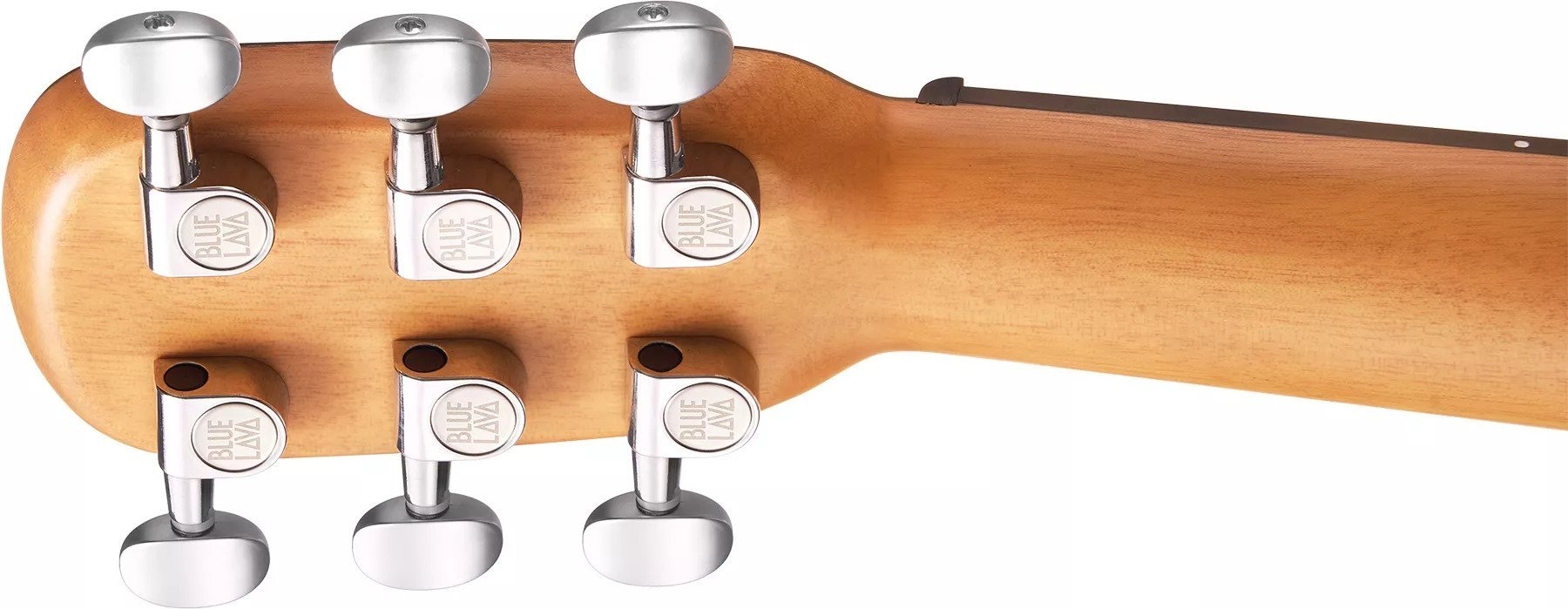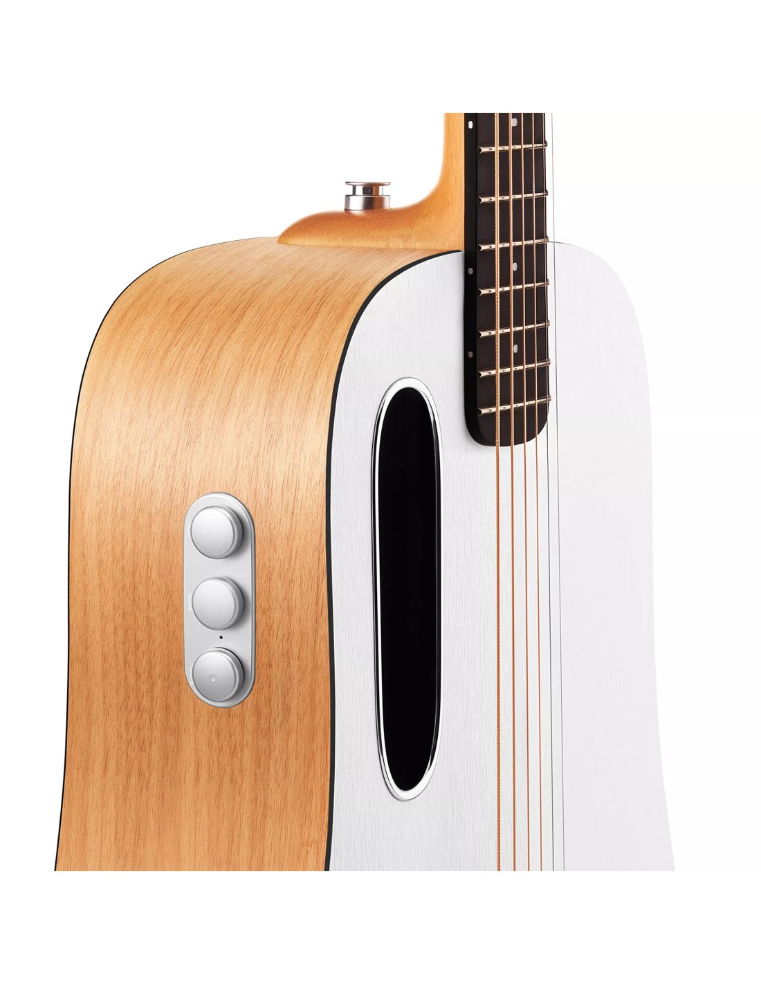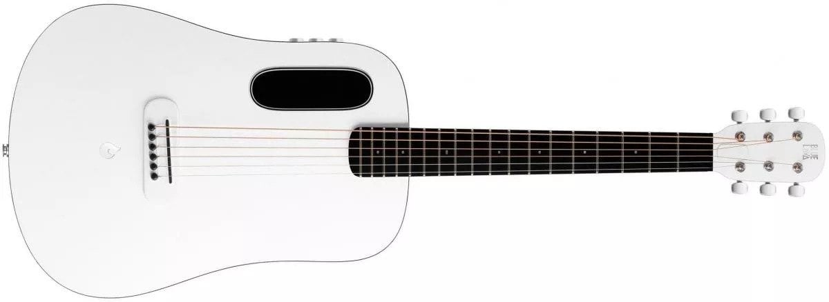 LAVA MUSIC BLUE ORIGINAL FREEBOOST. Guitare acoustique électrifiée réalisée en matériau composite HPL (High Pressure Laminate) de 36 pouces avec technologie L2 Pickup, qui permet de reproduire des effets sans connecter la guitare à l'amplificateur. Les caractéristiques techniques incluent préamplification via L2 Pickup, qui permet l'utilisation du dos de la guitare comme haut-parleur, technologie Freeboost avec effets de Réverbération, Chorus et Delay, pont en fibre composite haute performance, 18 frettes, truss rod réglable au manche. Inclut une housse de concert Airflow et un câble de recharge Micro USB. Finition : fond et table blancs, éclisses en finition naturelle.