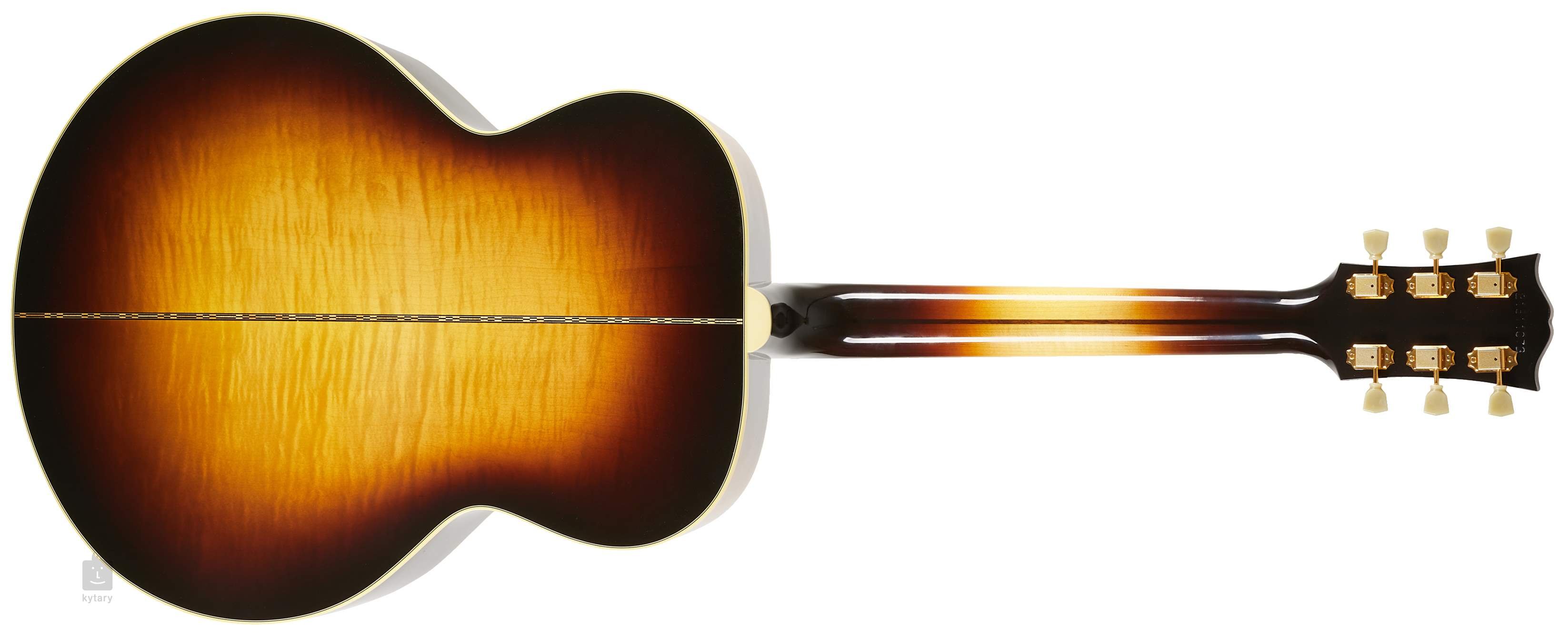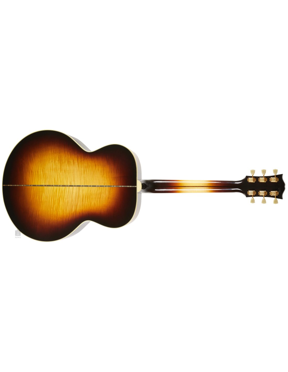 GIBSON SJ-200 ORIGINAL VINTAGE SUNBURST. Chitarra acustica elettrificata Gibson SJ-200 modello Super Jumbo-200 con Top in abete Sitka, fondo e fasce in acero fiammato, manico in acero 2 pezzi a profilo arrotondato con tastiera in palissandro a raggio 12" e 20 tasti standard, giunzione manico-body X-Bracing smerlato, capotasto in osso, intarsi Corone in madreperla, meccaniche Gotoh Keystone con manopole bianche, ponte SJ-200 Four Bar Moustache e battipenna tartarugato inciso. L' elettronica consiste in un pickup sotto sella LR Baggs VTC con controlli di volume e tono.